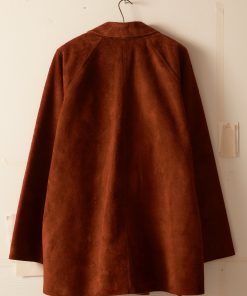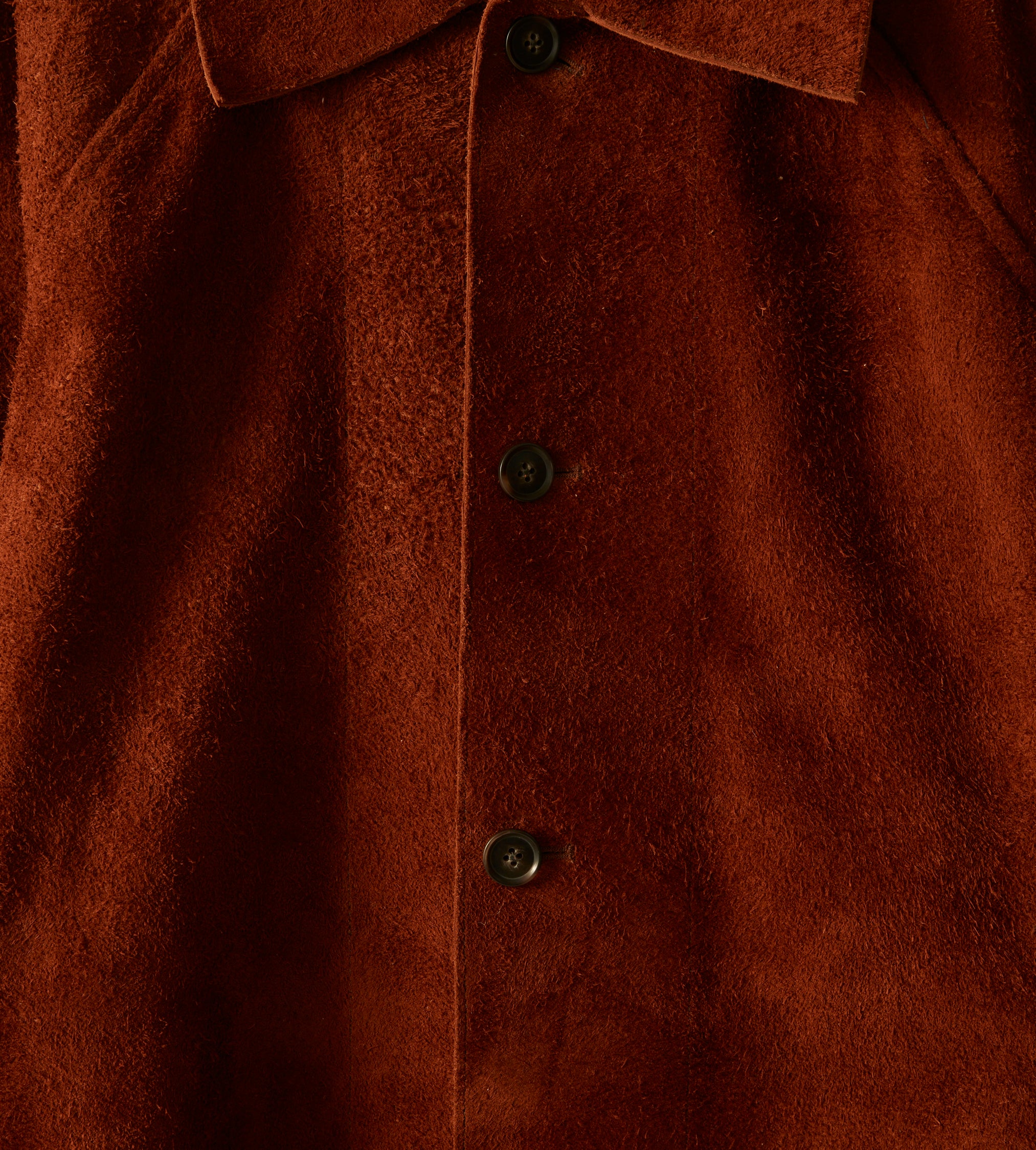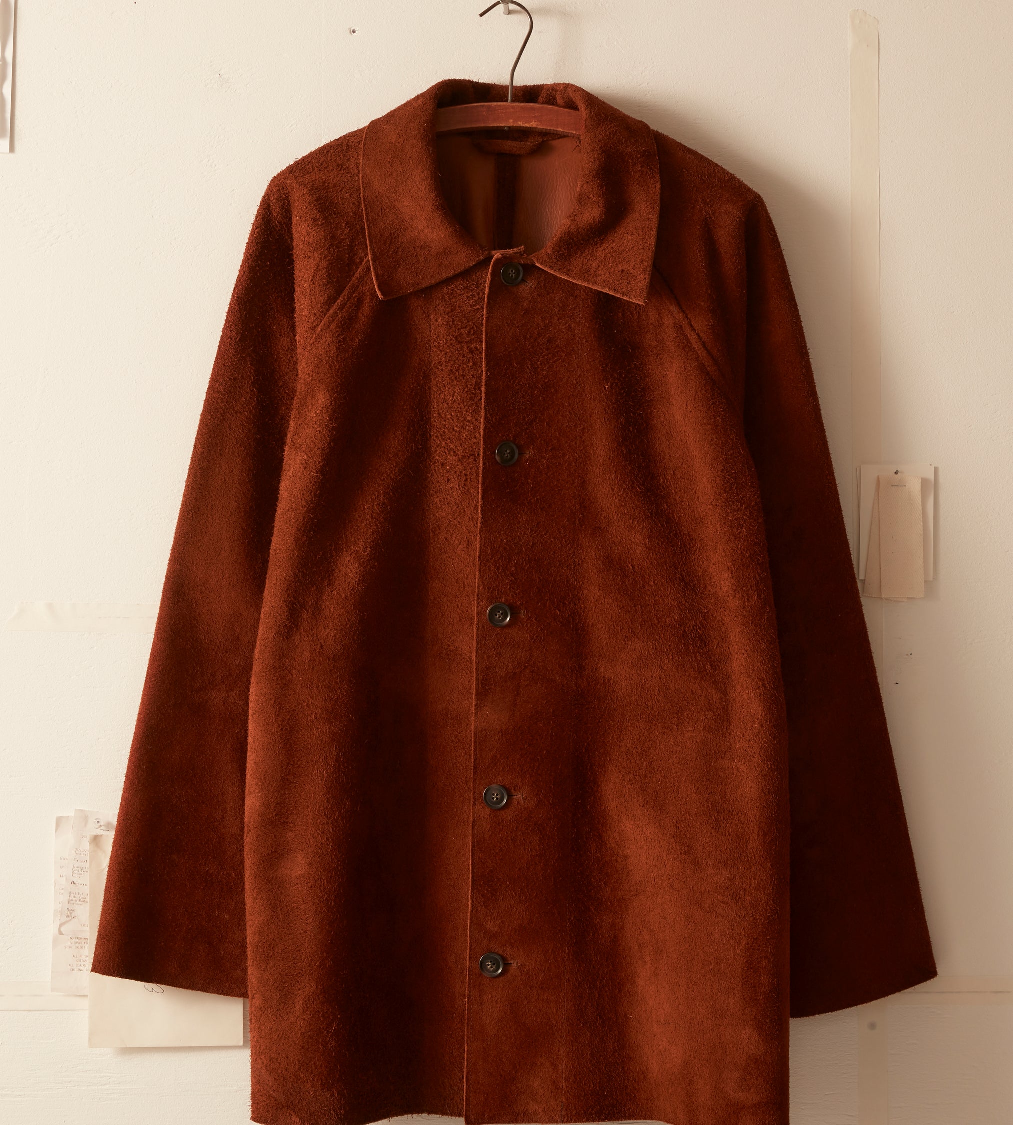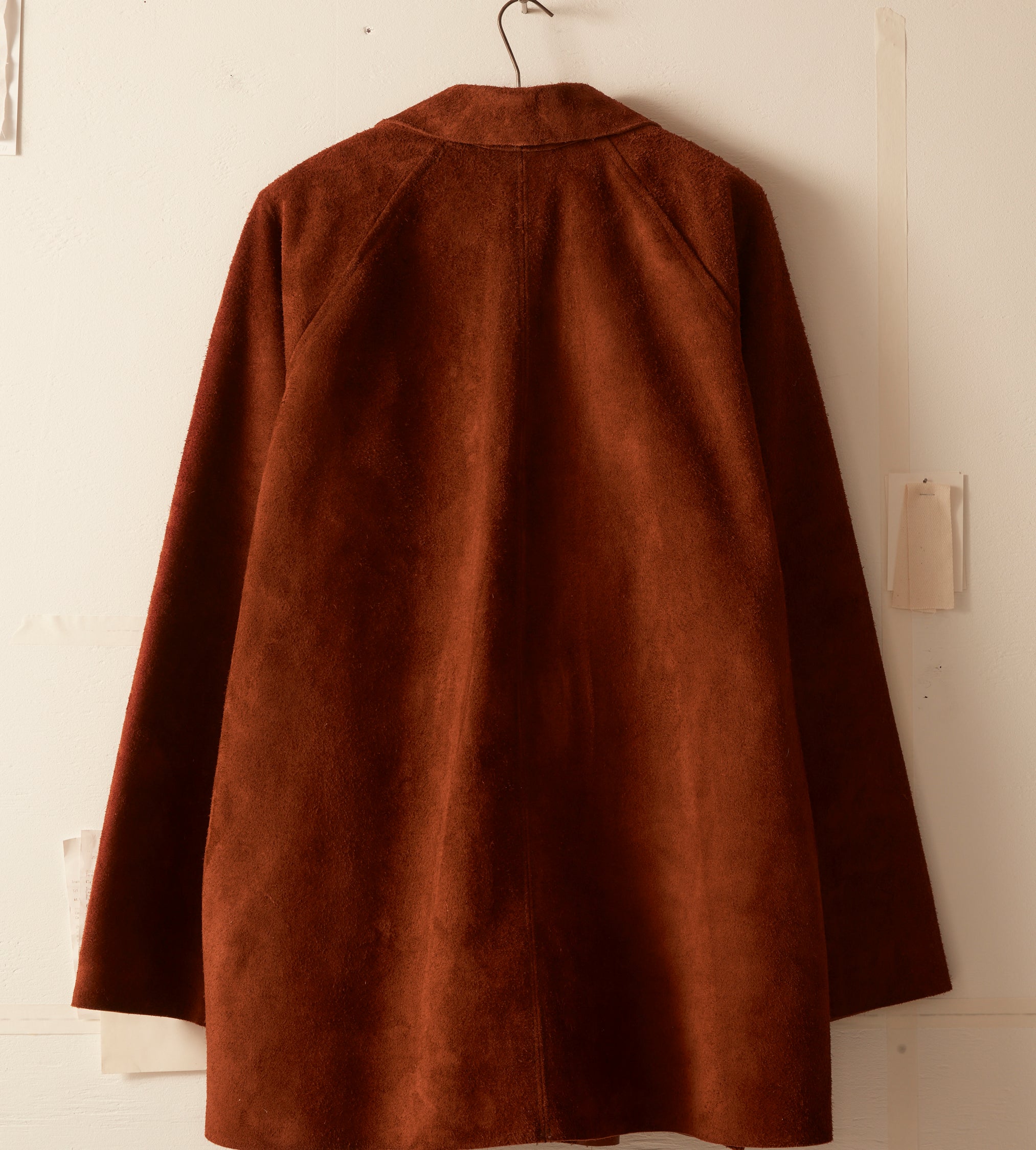 This suede coat is inspired by midcentury workers’ coats. The coat is made with a raglan sleeve and no placket for an easy fit. The suede is hand selected and cut; no two pieces are identical.