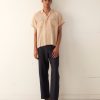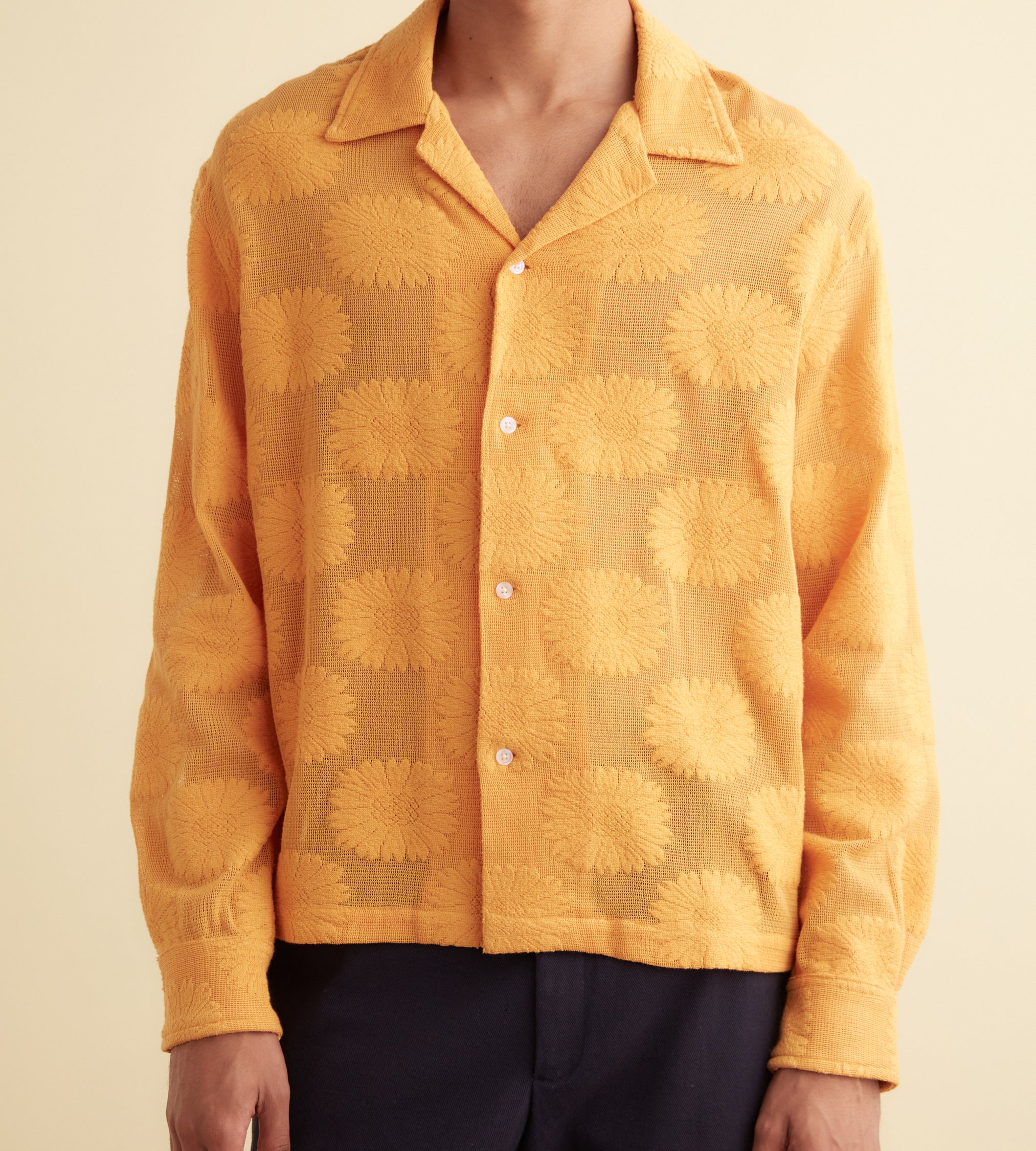 This shirt is inspired by a lace curtain from the 1930s-1950s and is part of Bode’s lace development program. Made of golden lace and patterned with sunflowers, it has a camp collar and a straight hem. The shirt features a hand-embroidered Bode logo on the back.