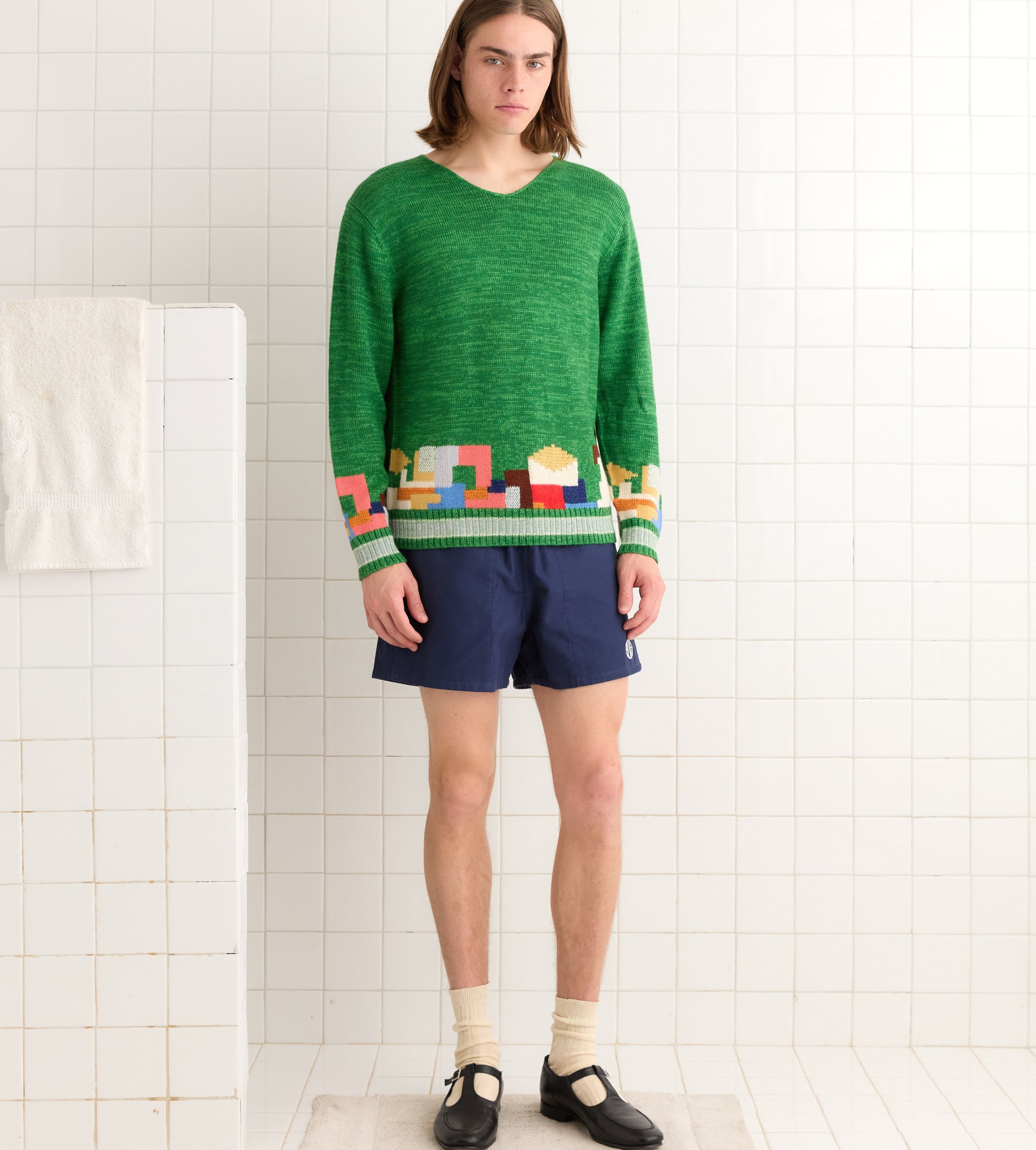 This sweater is a historical reproduction of a children’s sweater, made for a Chicago department store in the 1930s. We reproduced the knit pattern, with its blocks of color around the hem and cuffs, for this style.