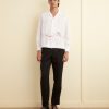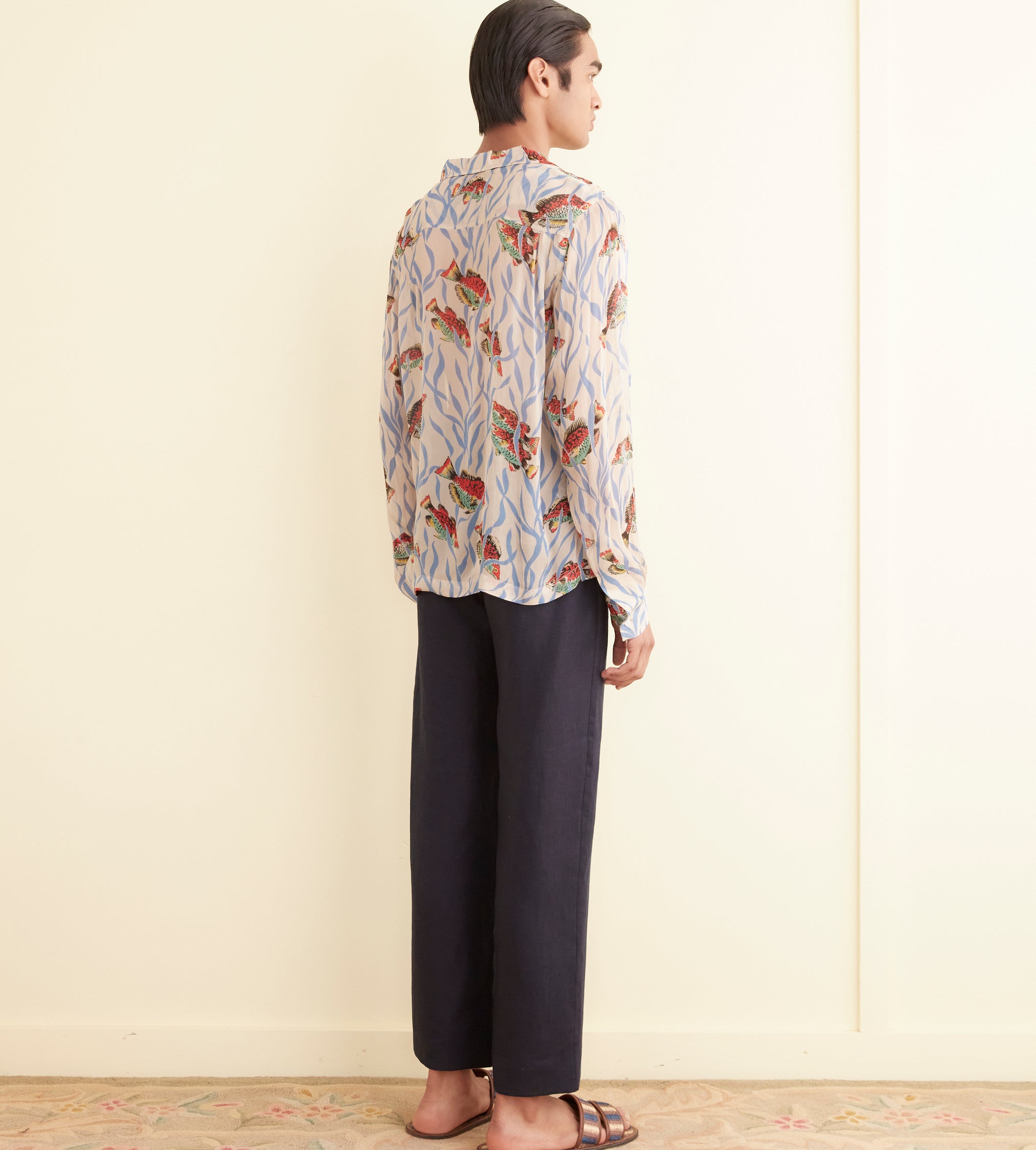 This shirt is inspired by deadstock yardage from the midcentury, which was printed with a pattern of blue seaweed and orange fish. We reproduced the original print on a fine, textured crepe for this style.