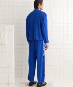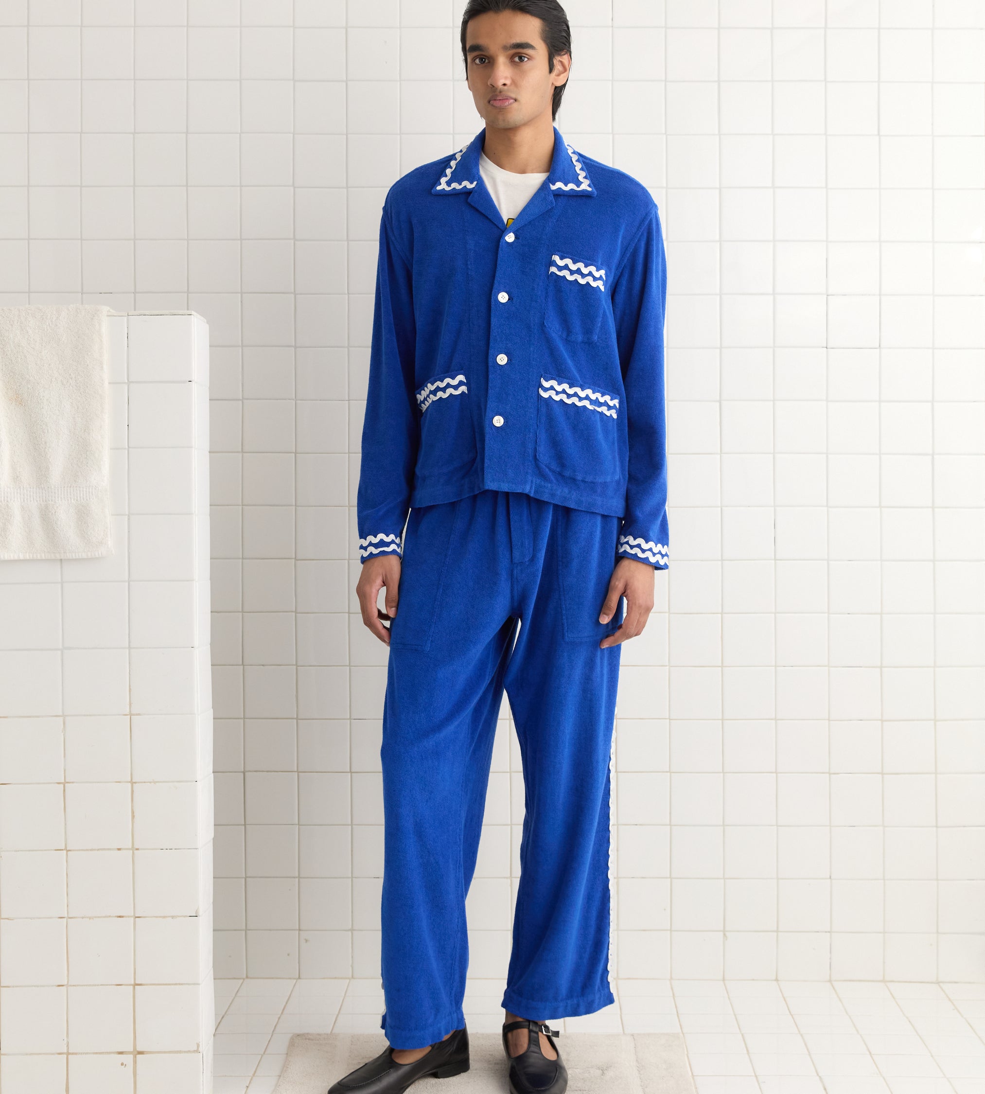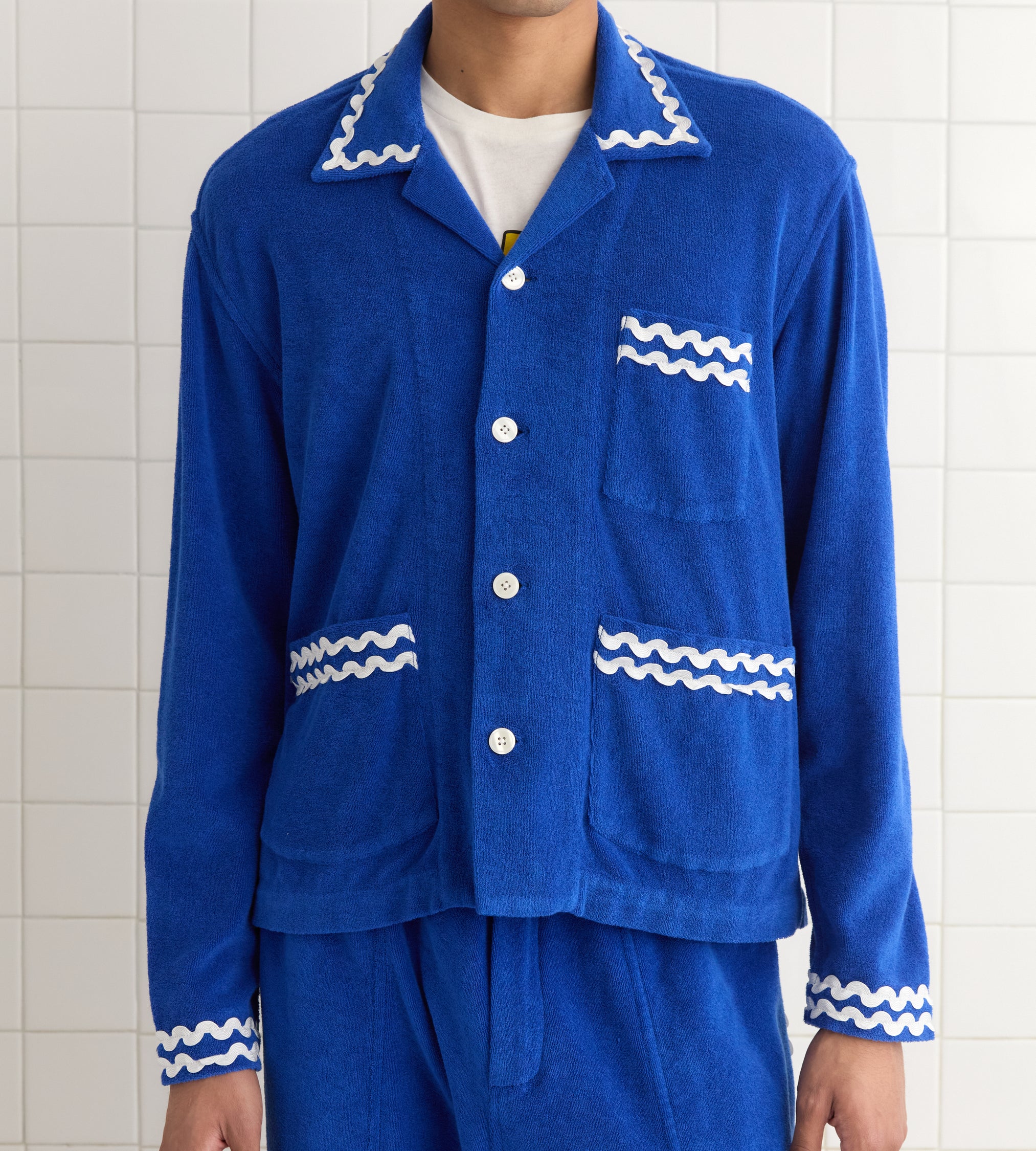 This overshirt is inspired by a French tracksuit from the 1980s. We reproduced the soft blue terrycloth for this style, which is trimmed with white rickrack across the collar, cuffs, and pockets.