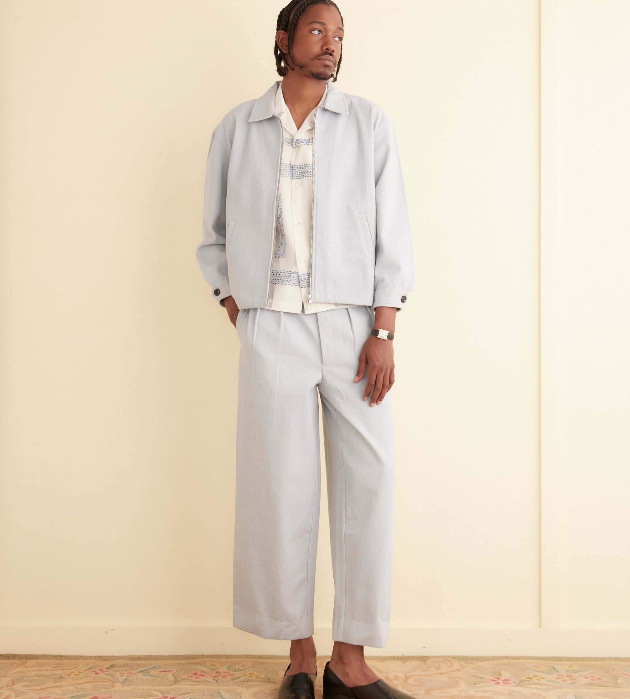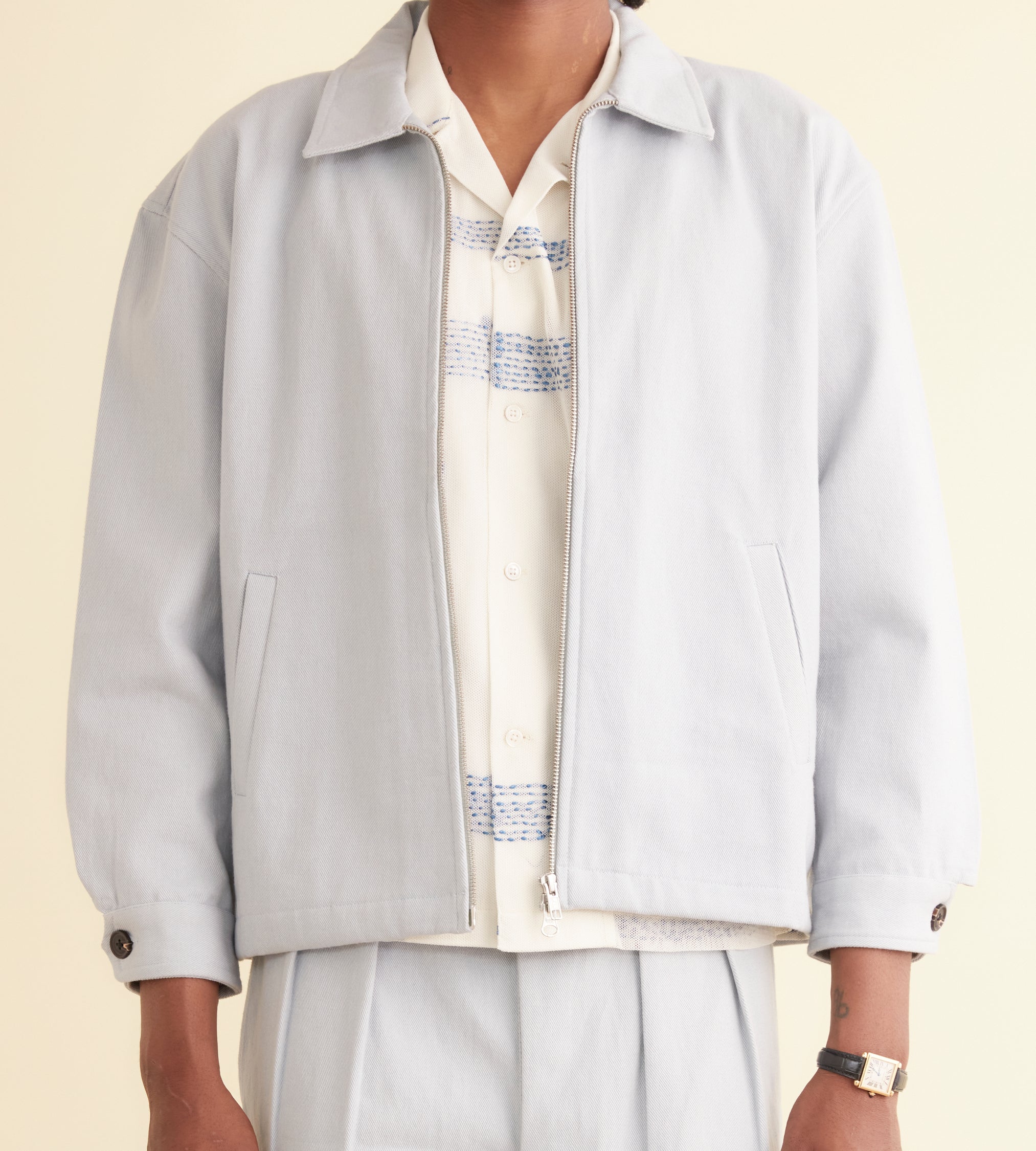 This jacket is inspired by a 1980s jacket from a high school club. We reproduced the original silhouette, with its welt pockets and front zip, in a heavyweight twill.