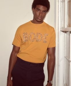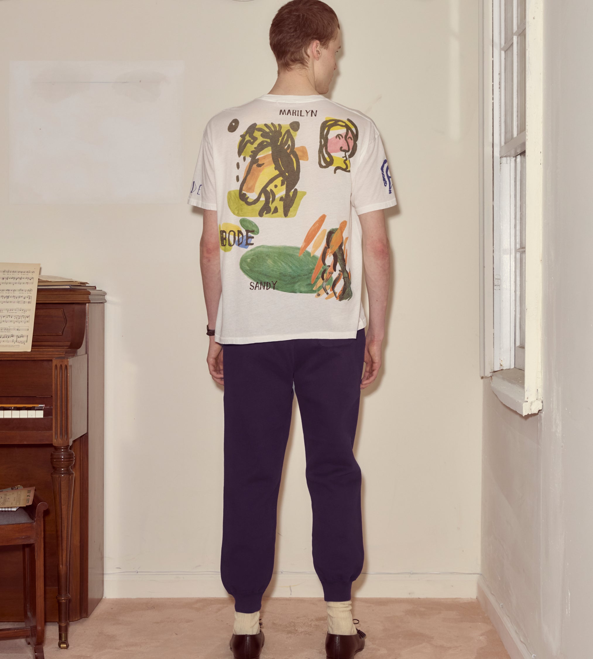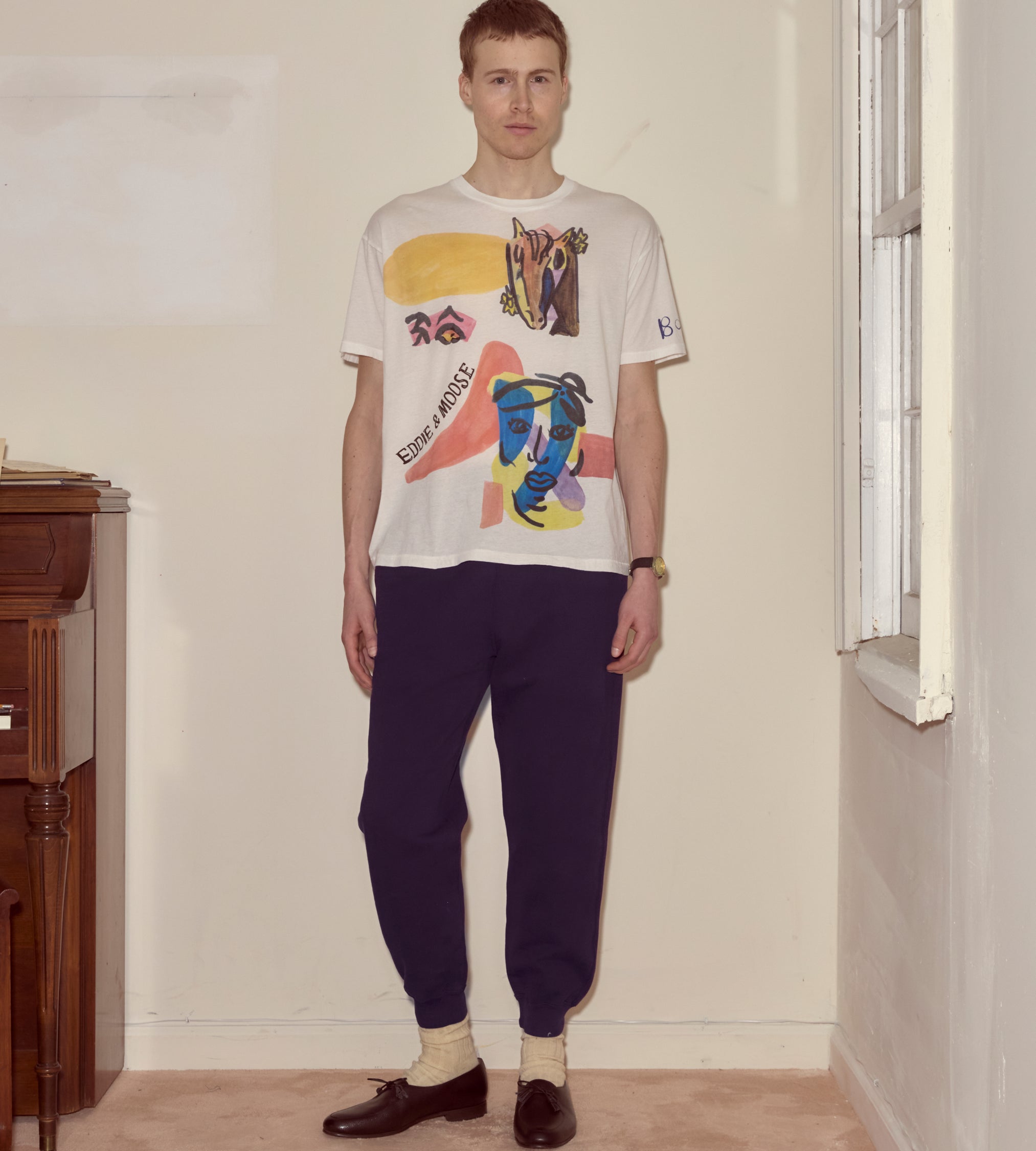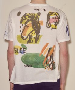 Moose Charlap and his writing partner, Eddie Lawrence, shared an eye for Modernist art, and both filled their homes with art purchased from young artists in Paris. This tee, with its abstract colorblocking and handwritten “Eddie and Moose,” “Marilyn and Sandy,” is an imagined souvenir from their travels—Moose with his wife Sandy and Eddie with his wife Marilyn.