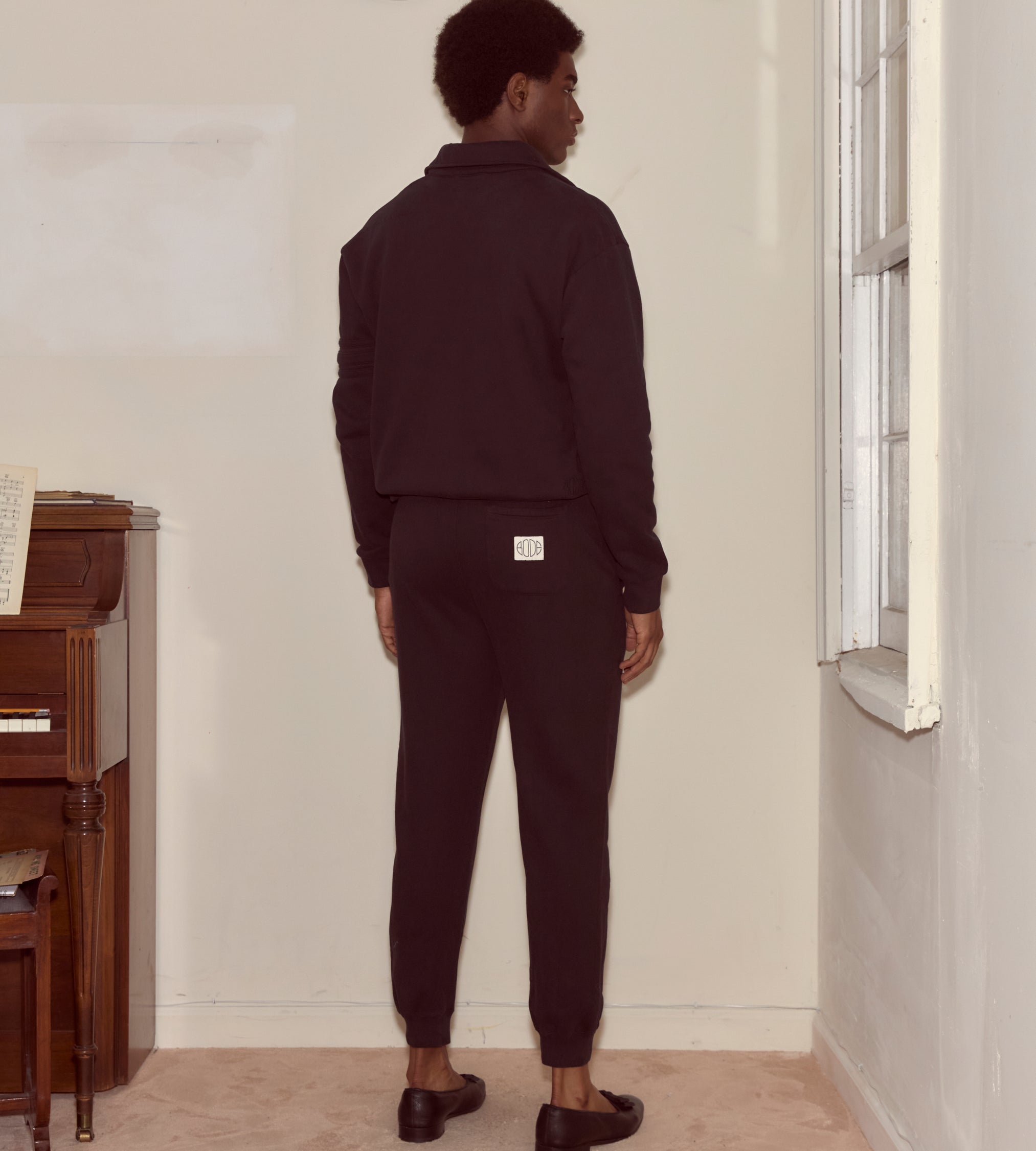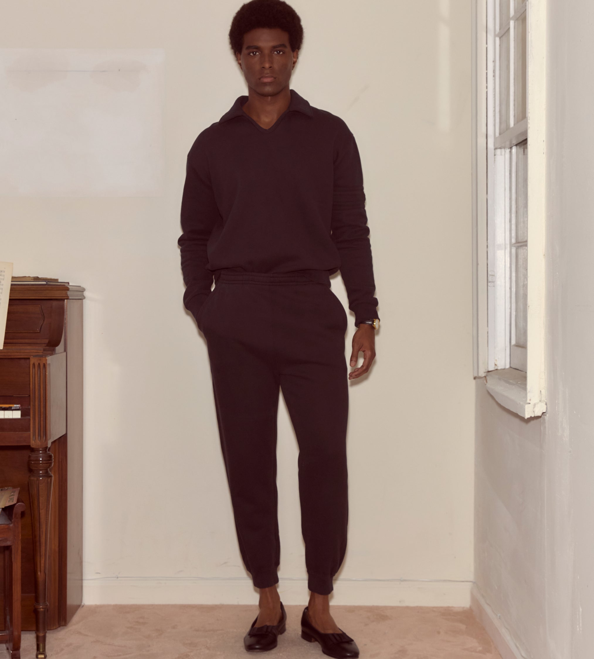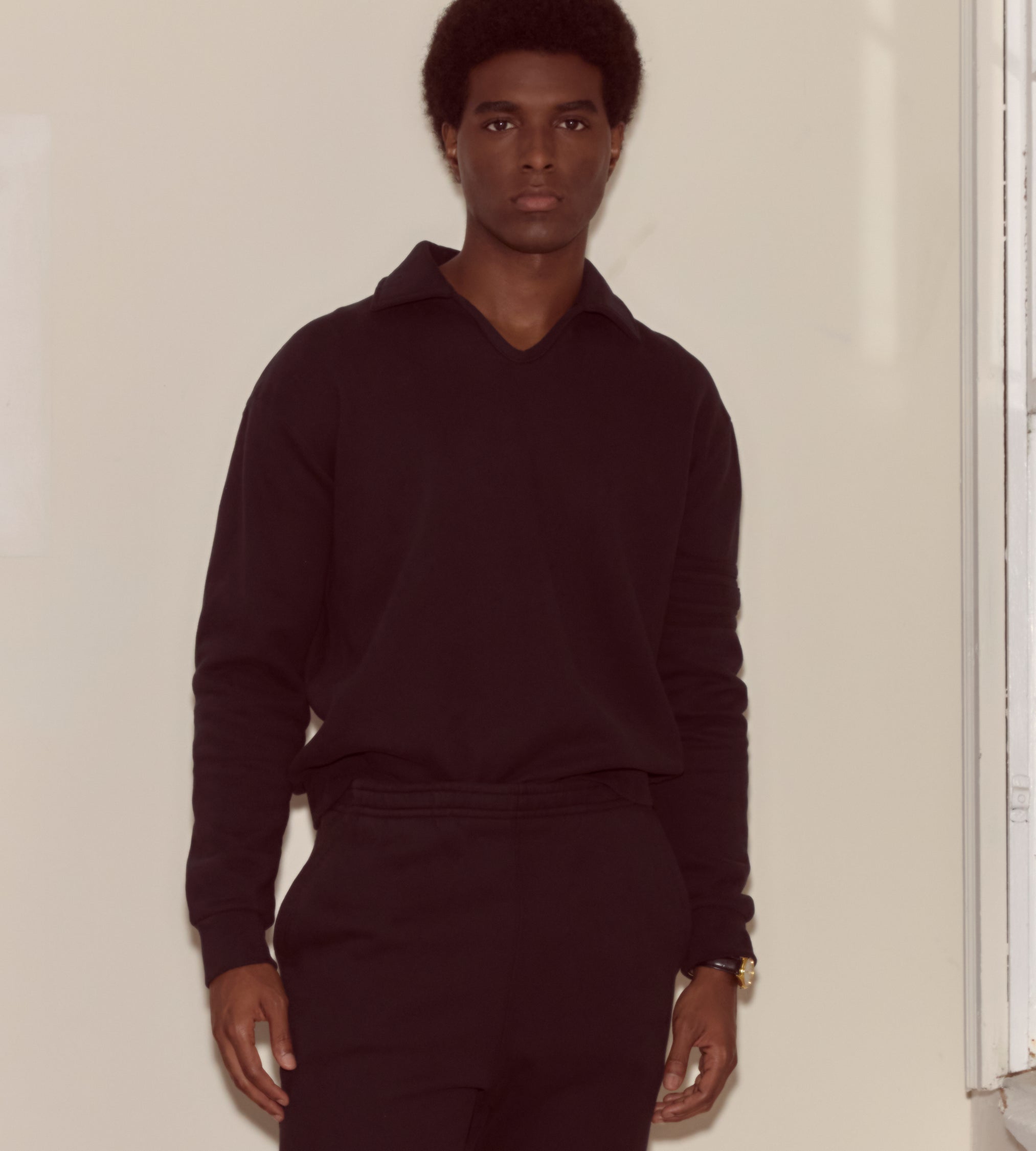 This polo is inspired by a rugby shirt from the 1980s. We reproduced the silhouette, with its open collar, for this style, which has three tonal stripes around one arm.