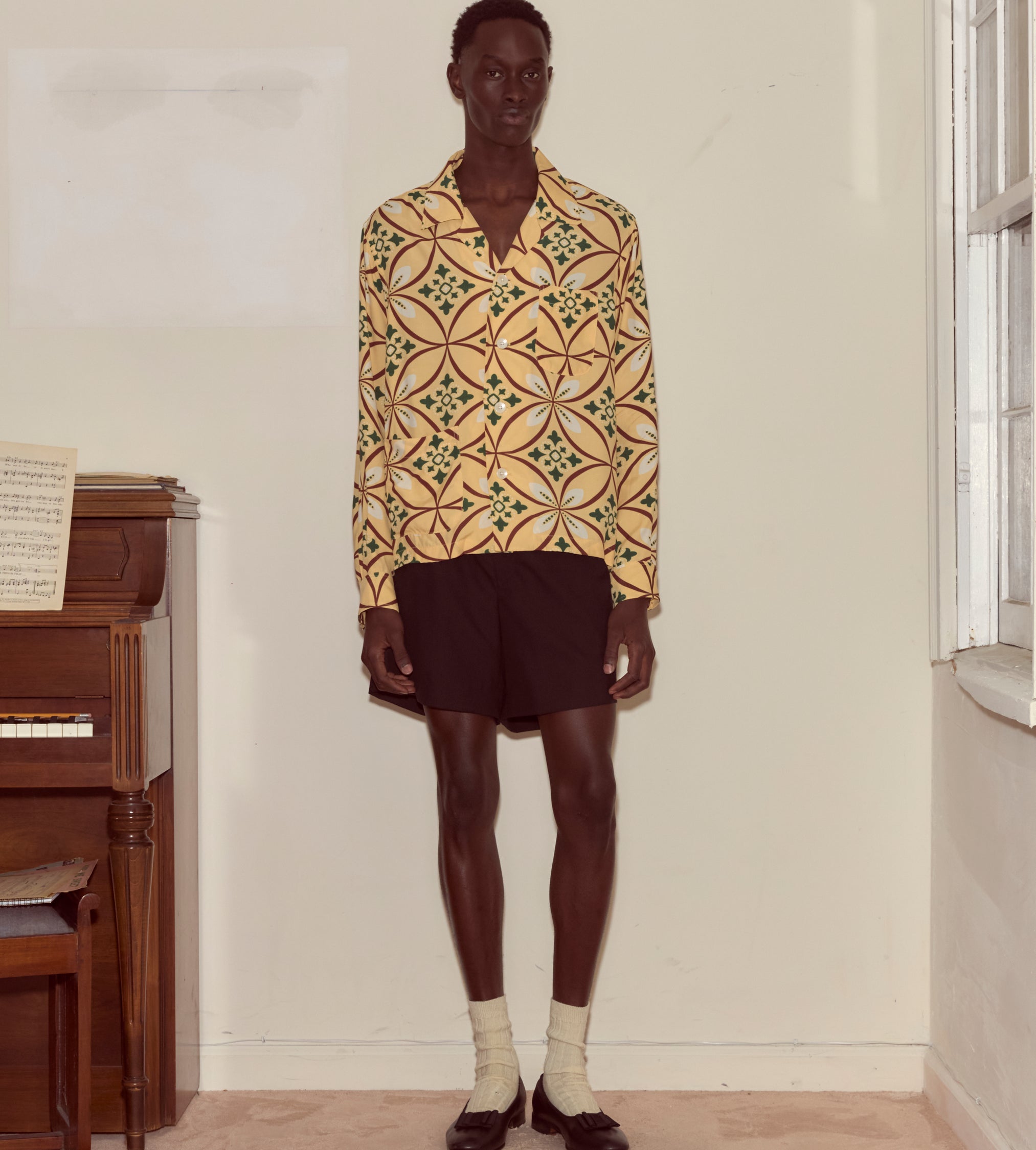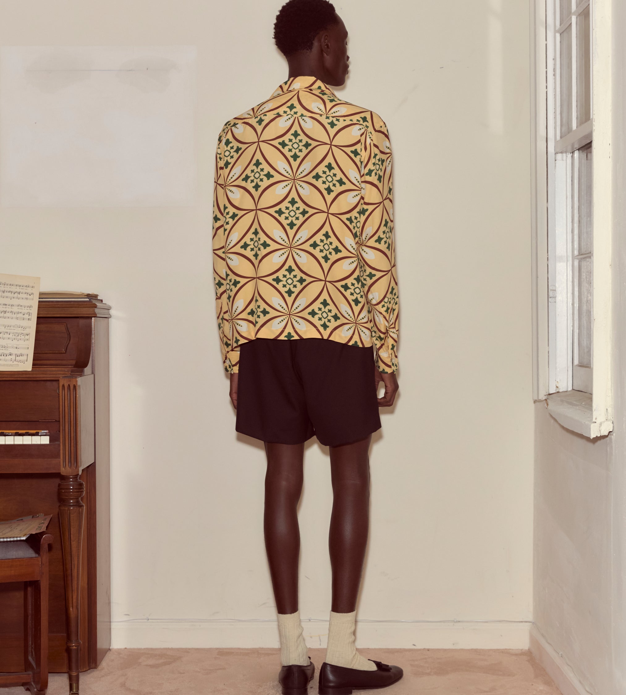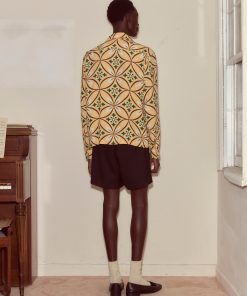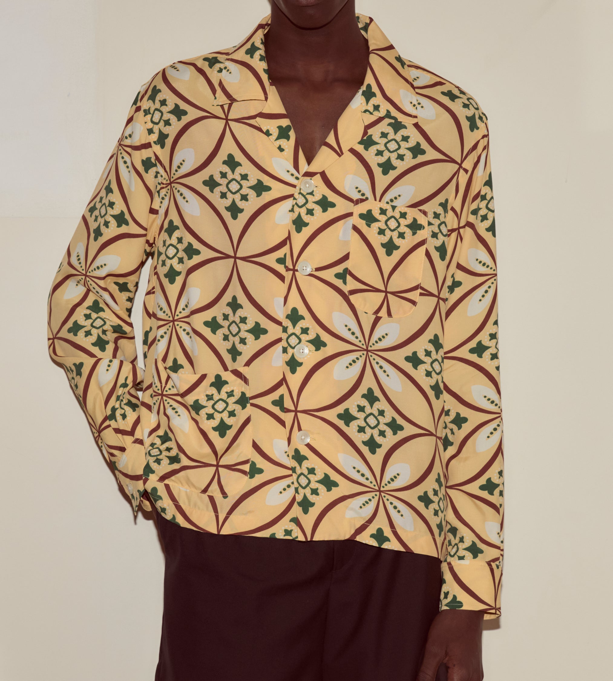 This shirt is inspired by a men’s shirt from the 1960s, printed with a geometric pattern in brown, tan, and green. We reproduced the fabric for this style.