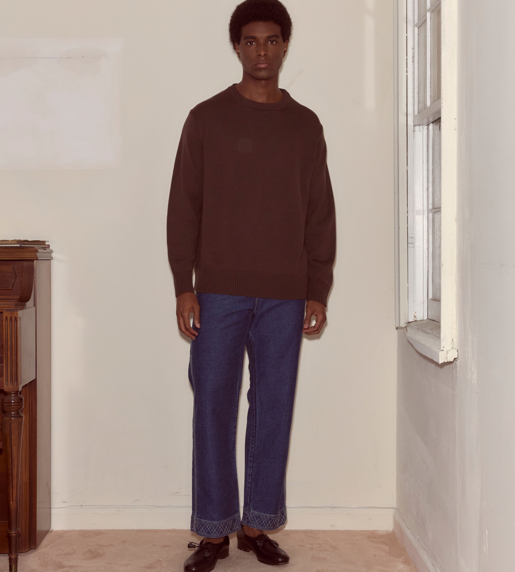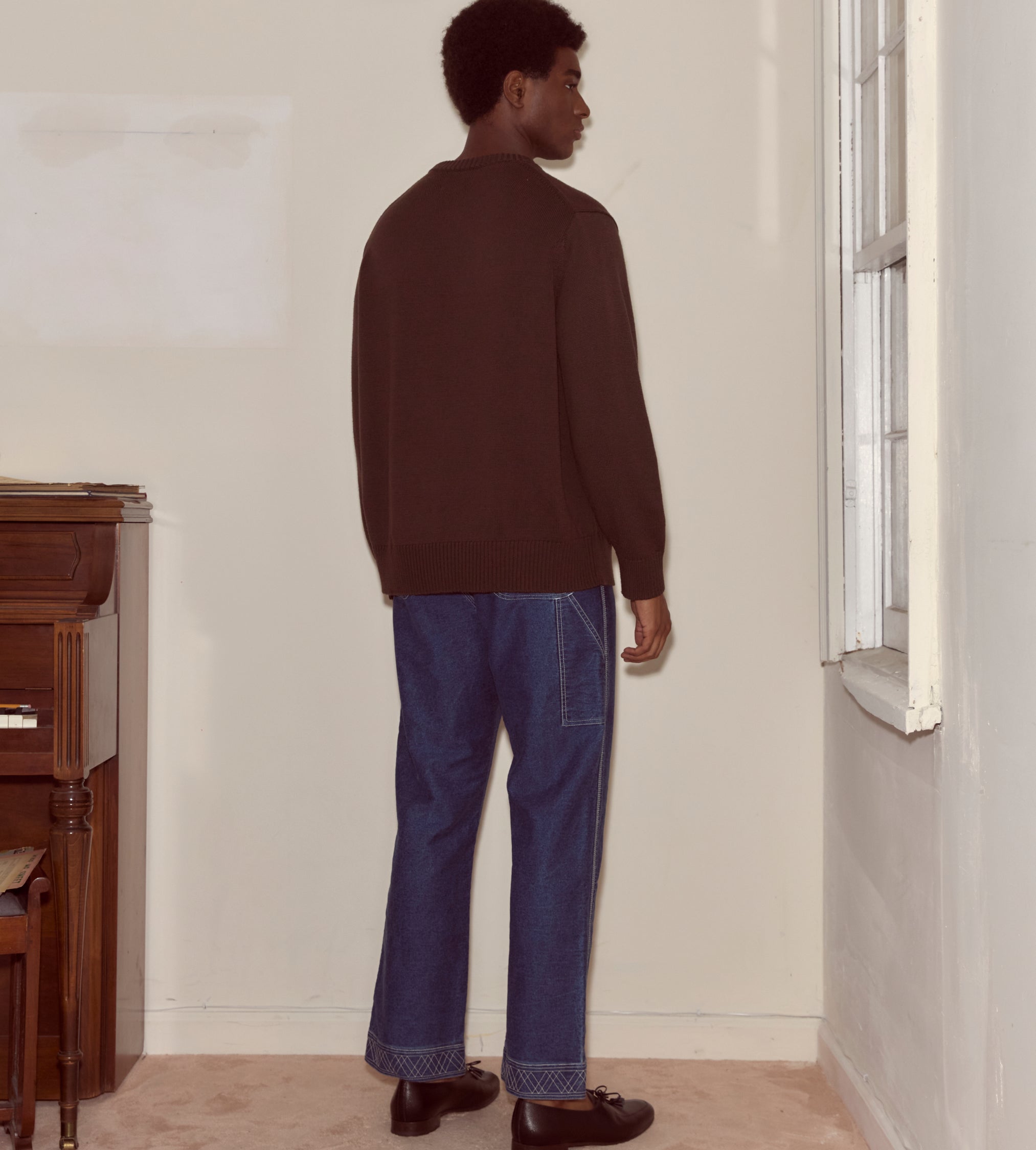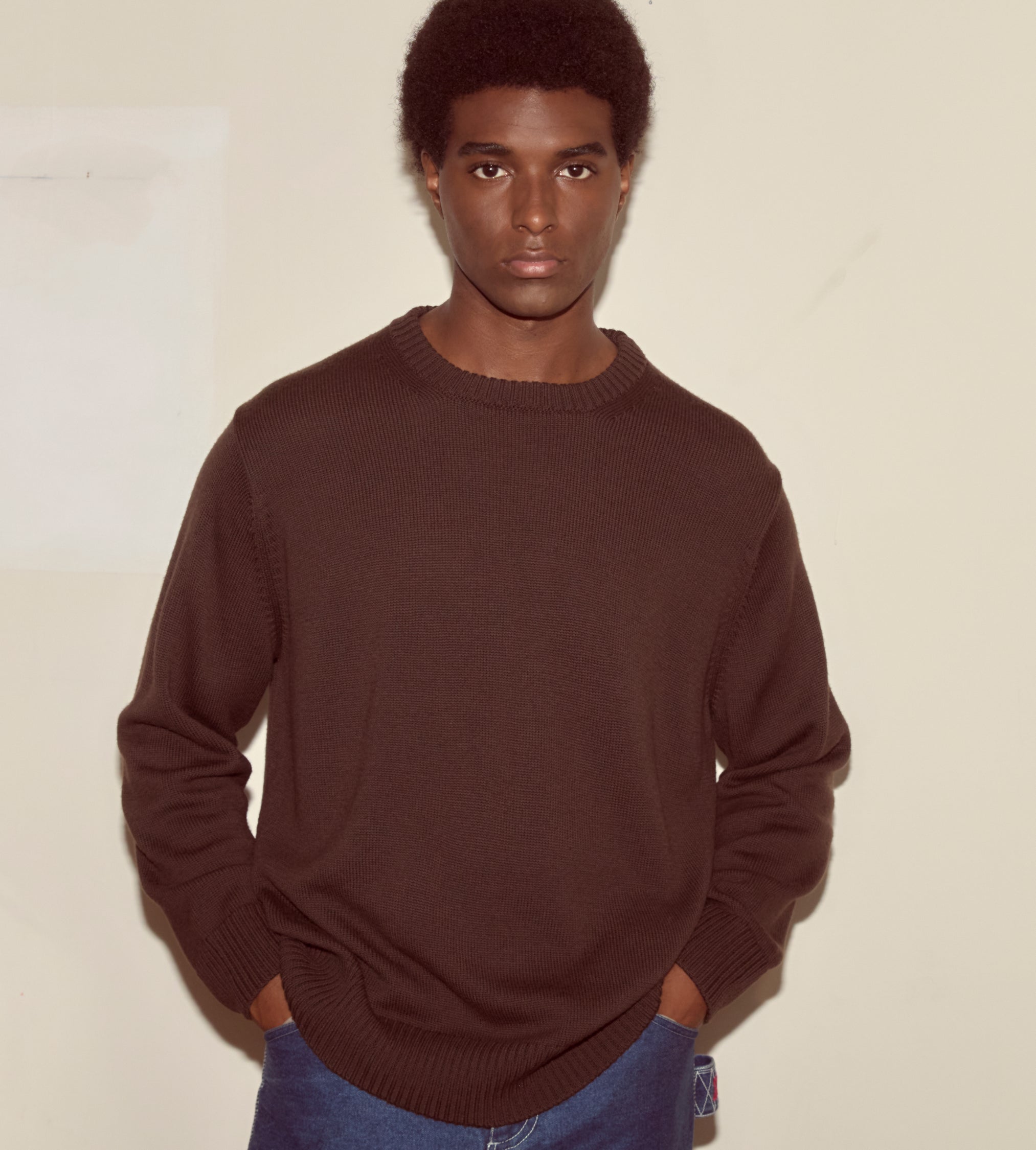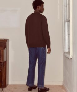 This style is a reproduction of a 1960s sweater. It features ribbed detailing around the collar, cuffs, and hem. The sweater is made from washable merino wool.