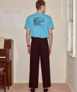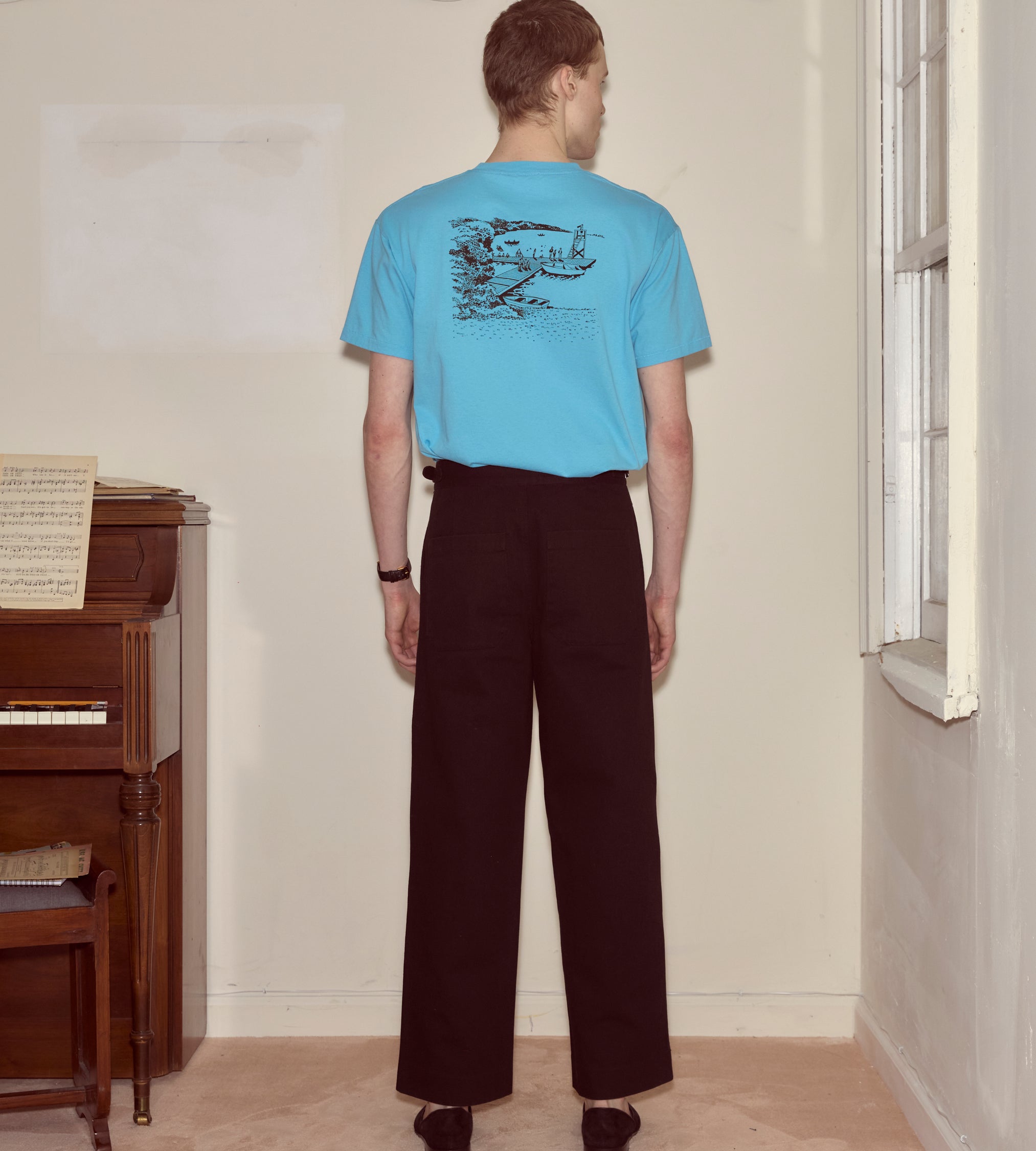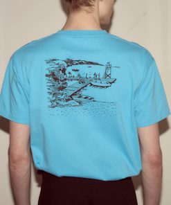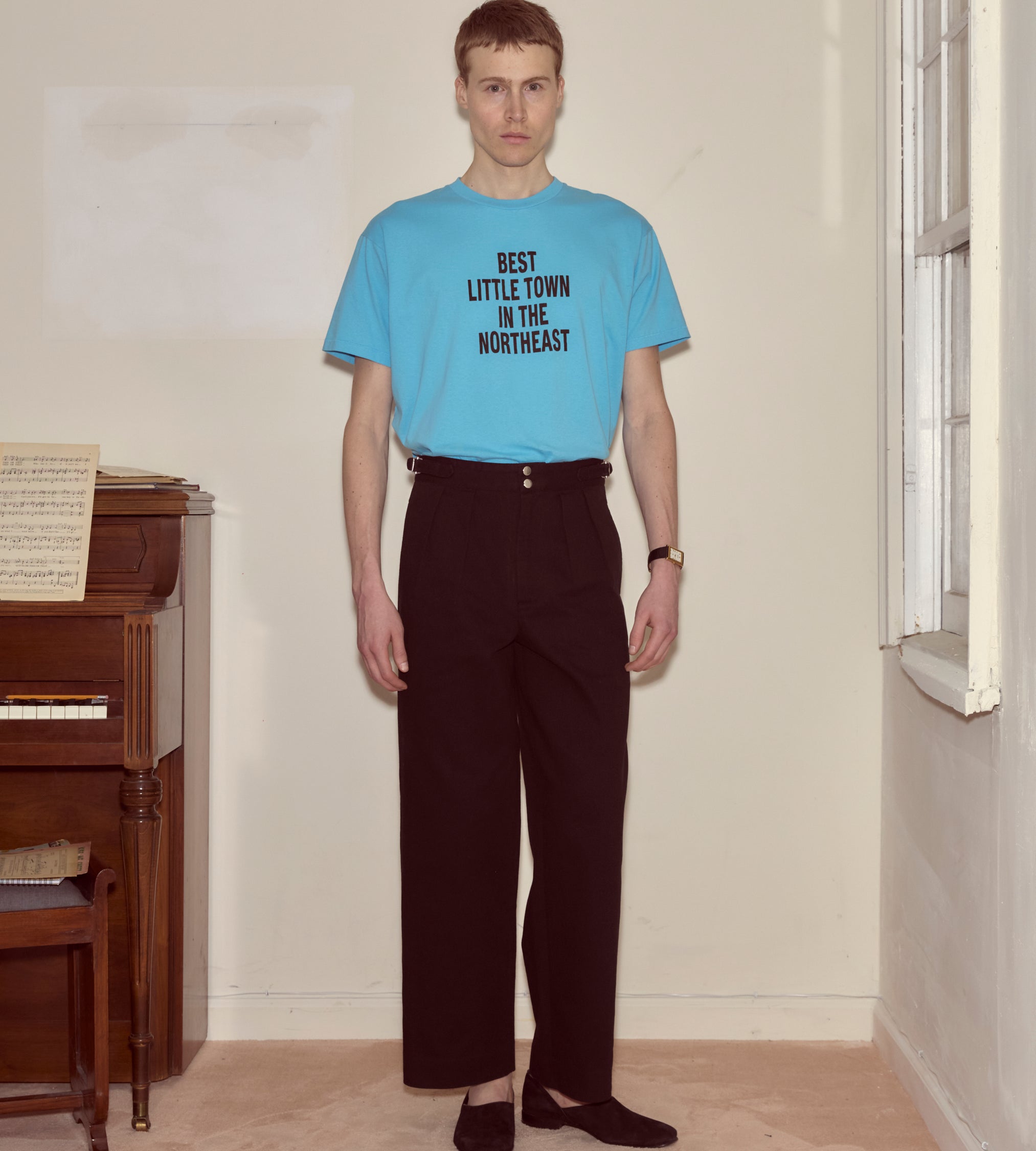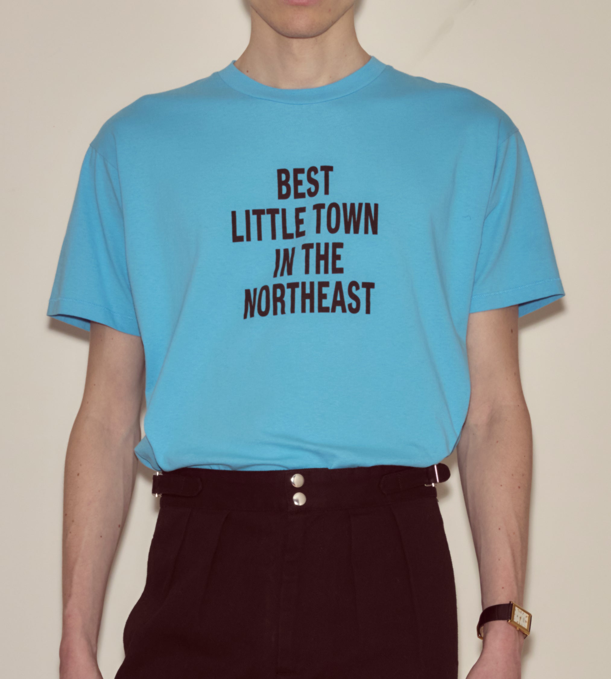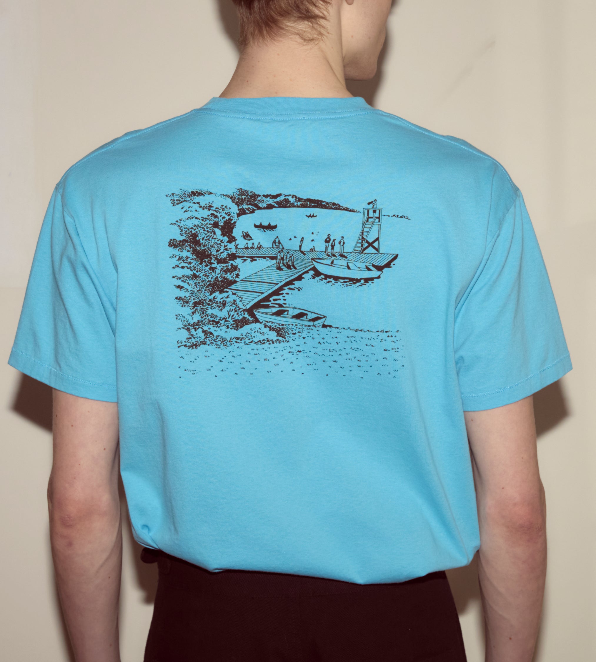 Moose Charlap attended Camp Onibar, a summer camp in the Poconos, as a child, returning as a teenager to work as the music counselor. This bright tee, with its “Best Little Town in the Northeast” slogan, is printed with an illustration of the camp’s swimming dock, looking out over Long Lake.