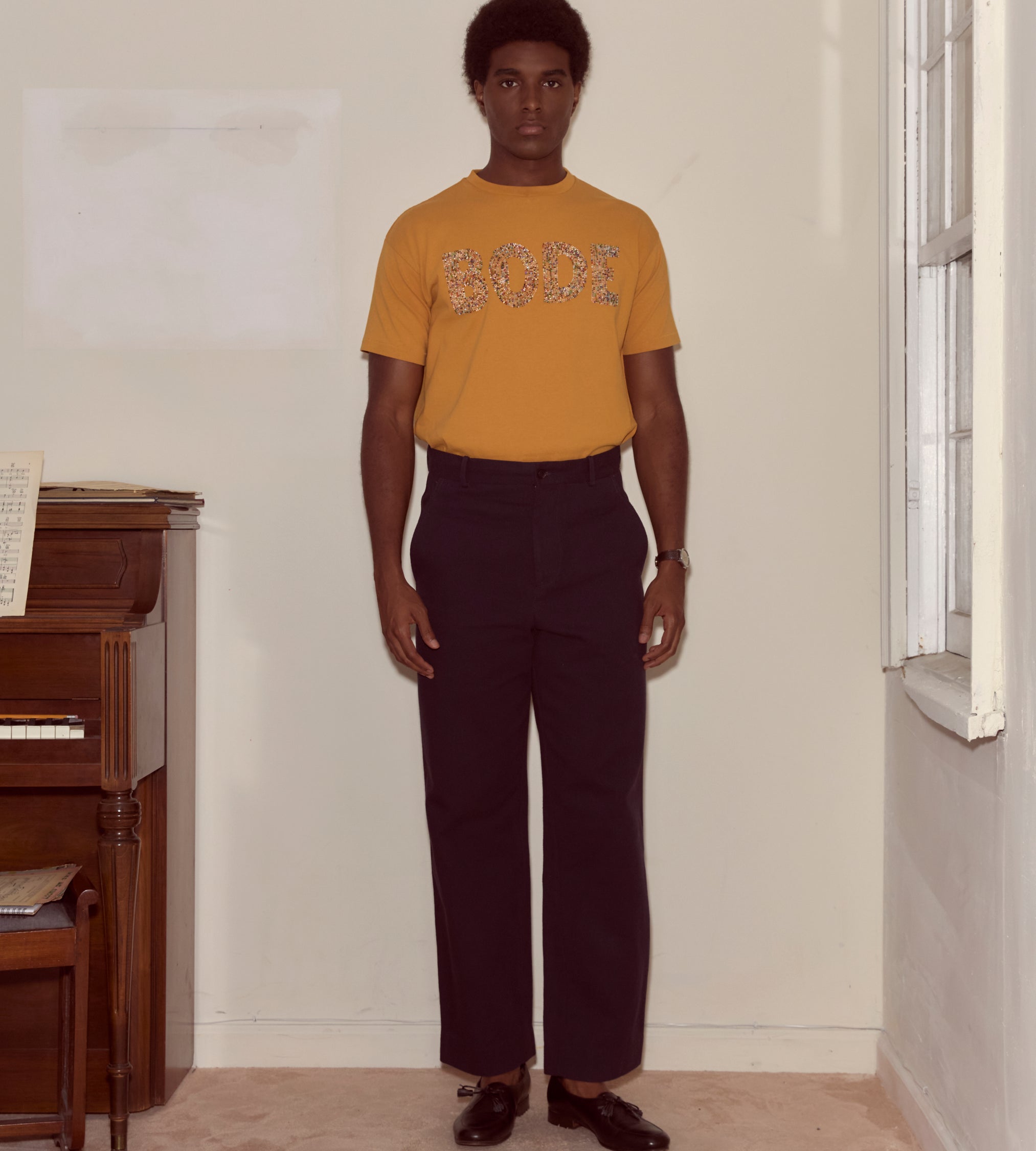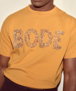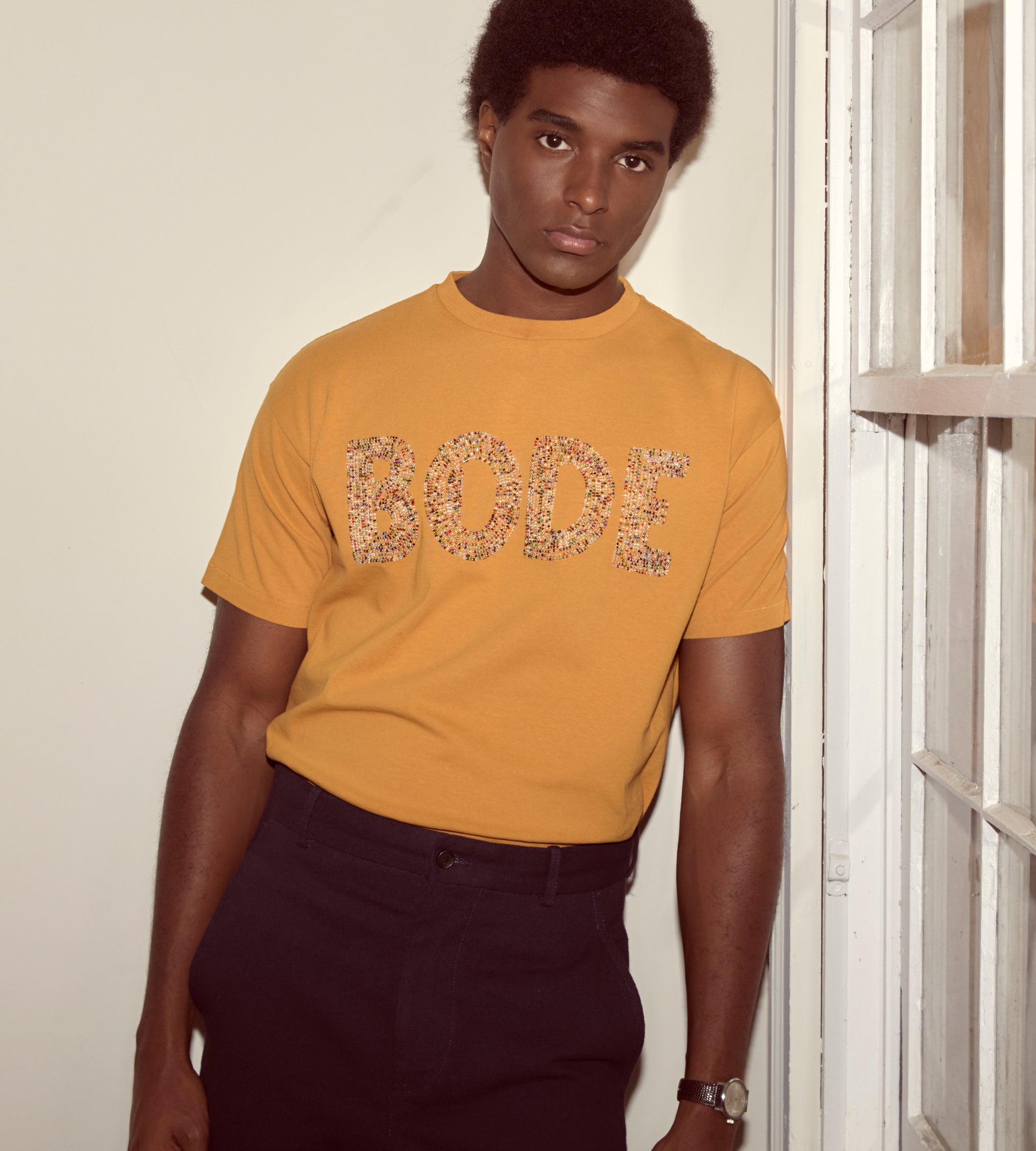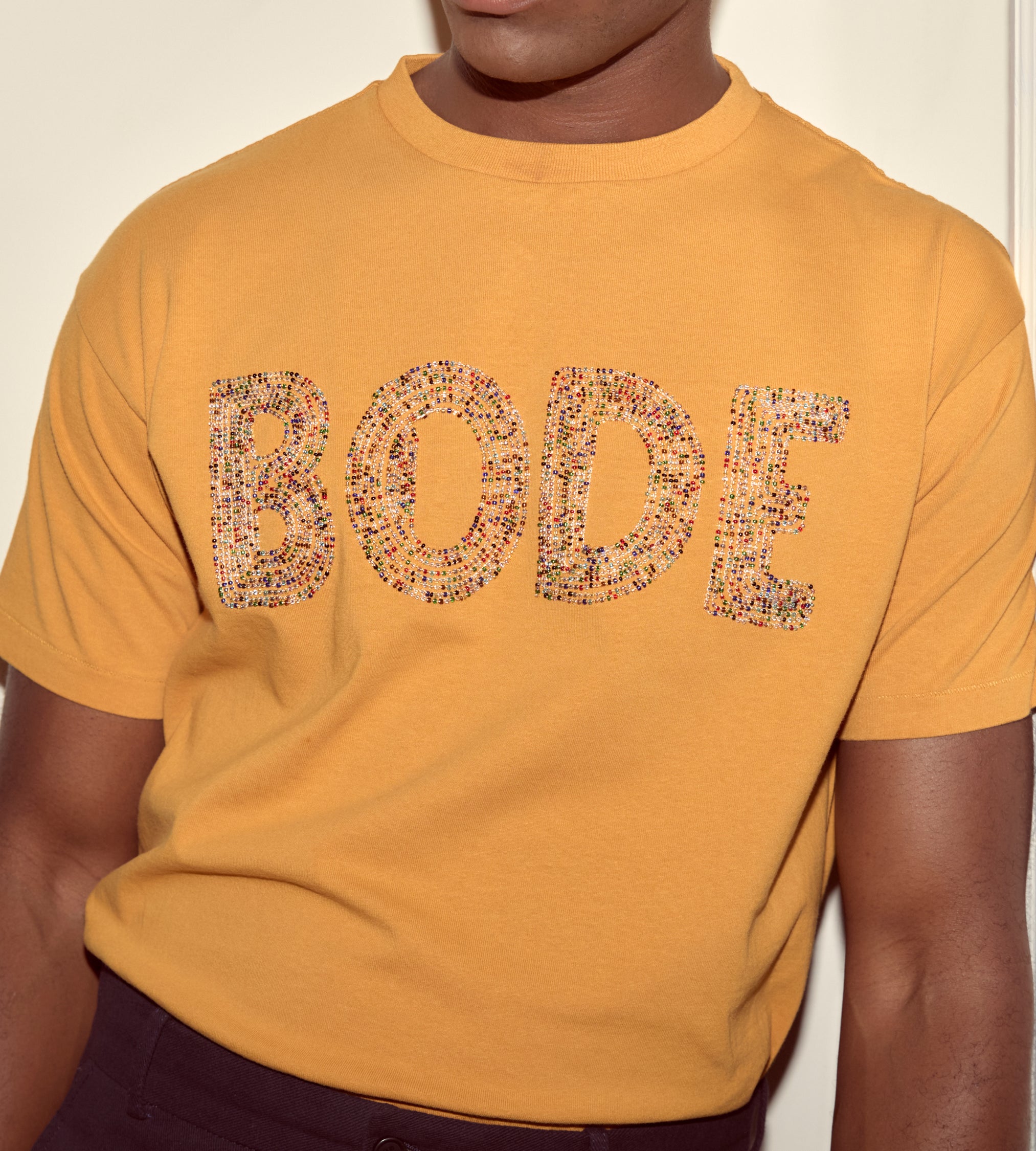 This tee is inspired by children’s novelty t-shirts, circa 1960s. It features a beaded, multicolored “Bode” across the front.