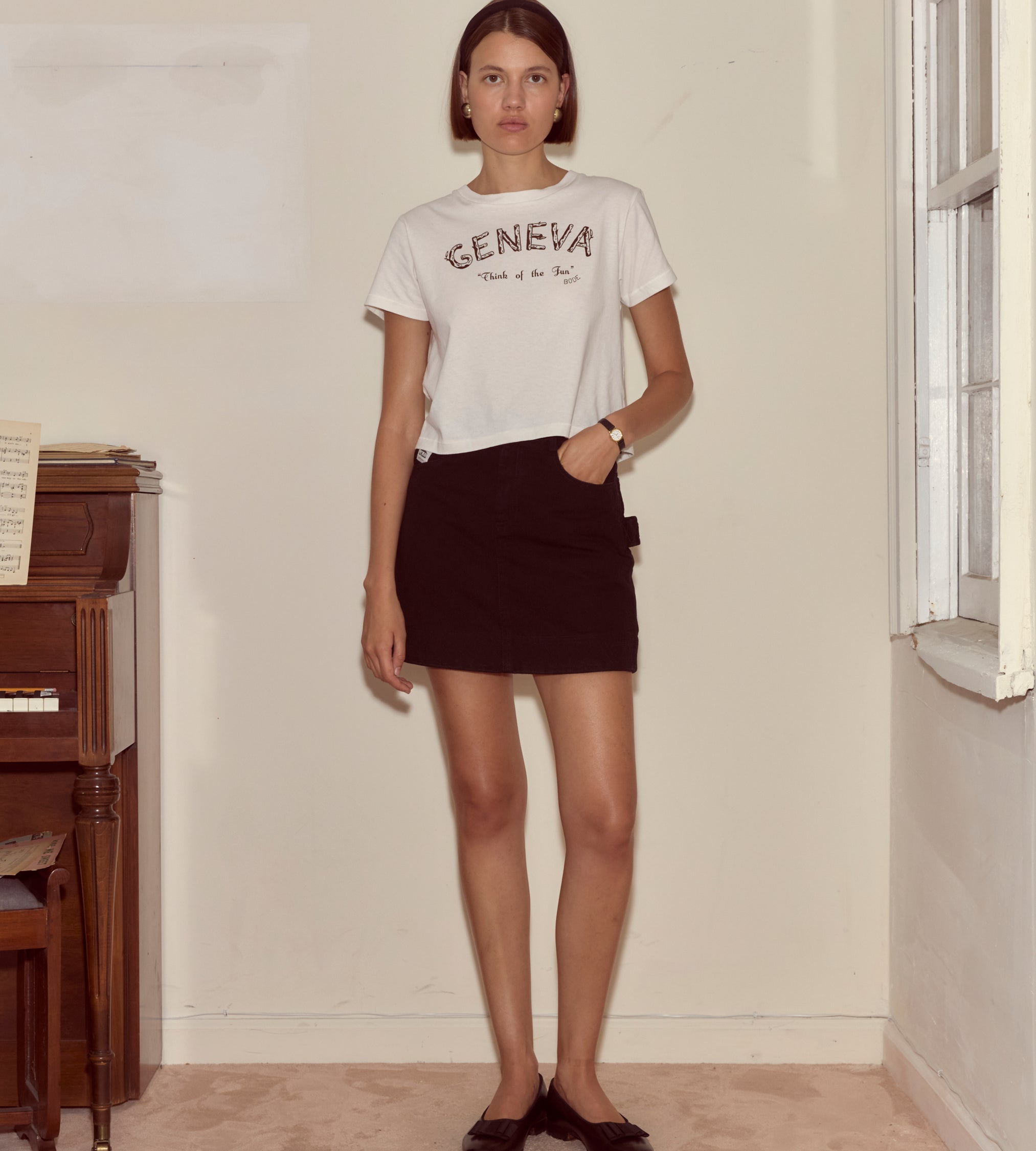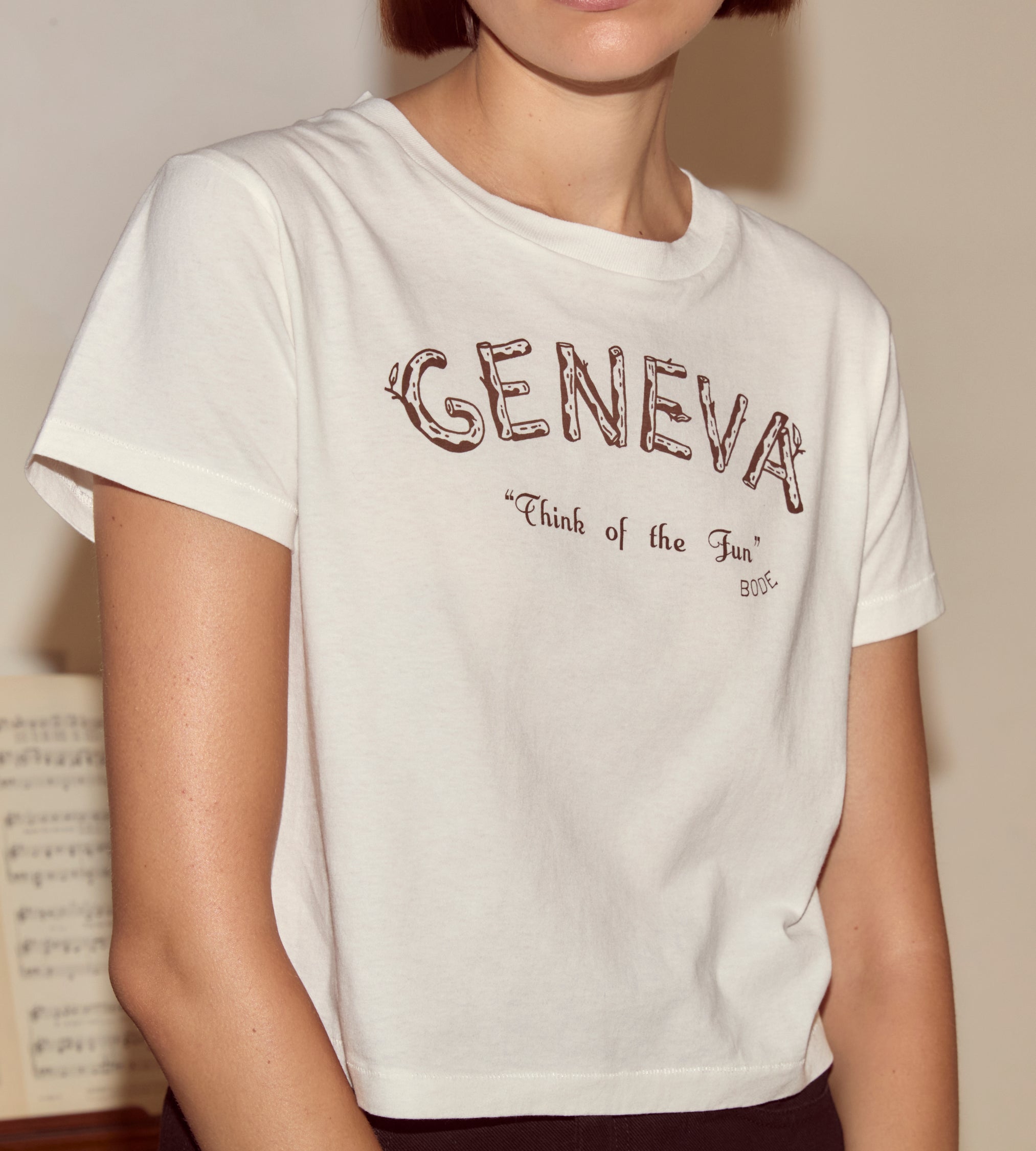 Camp Geneva was the girls’ camp paired with Camp Onibar, the summer camp Moose Charlap attended as a child. This shrunken tee is printed with lettering from a vintage Geneva photo album: “Camp Geneva; Think of the Fun.”