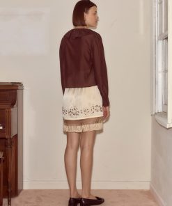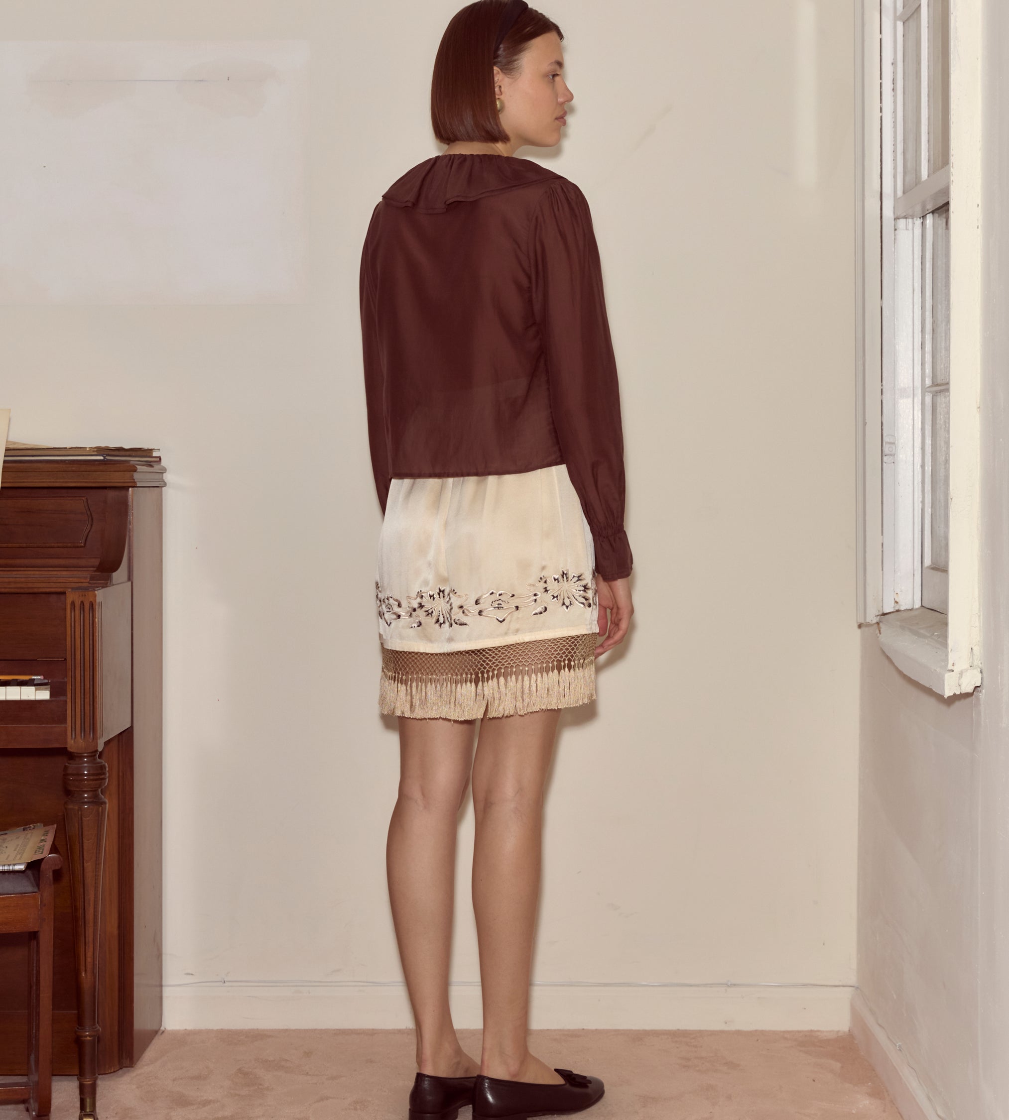 This blouse is inspired by a ruffled French blouse from the late 20th century. We reproduced the original silhouette in a lightweight cotton/silk blend with tie-front closures.
