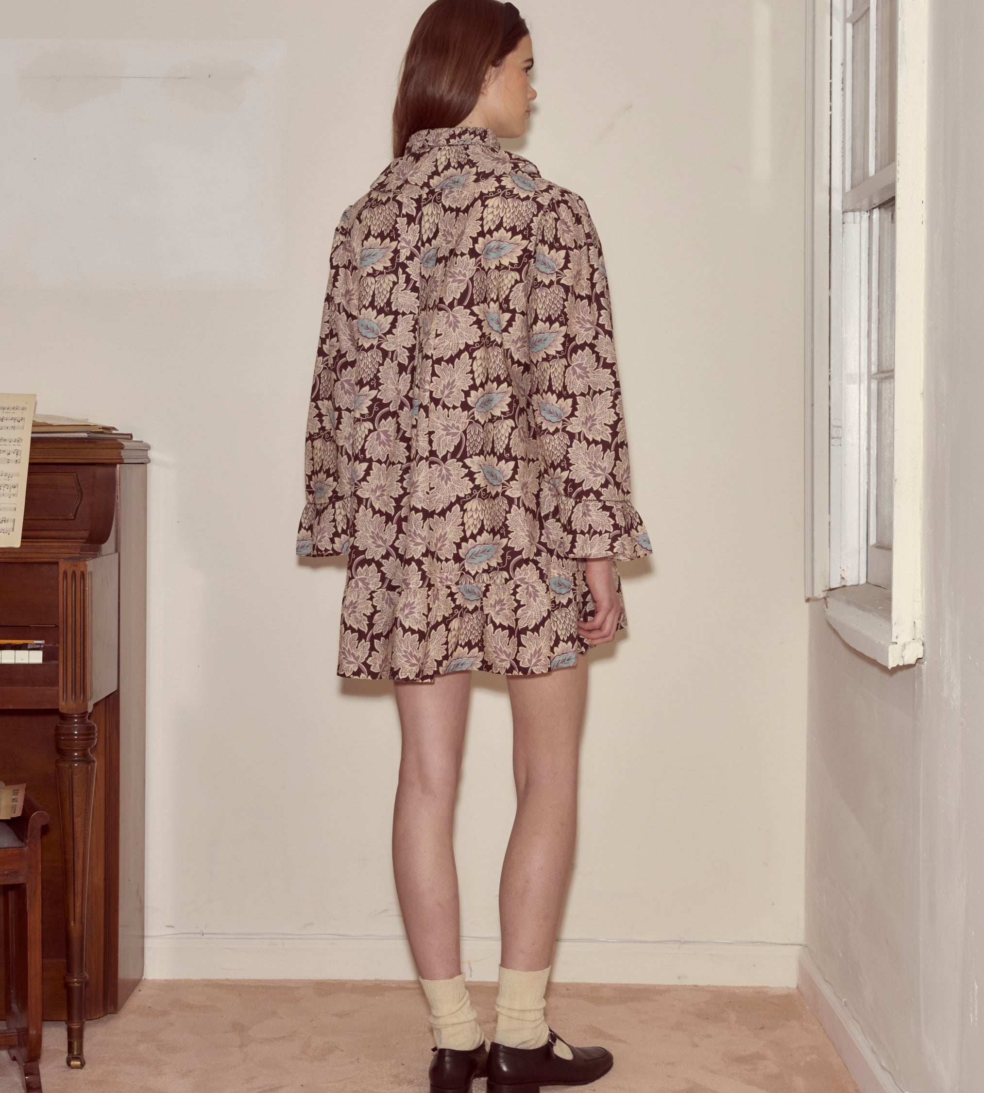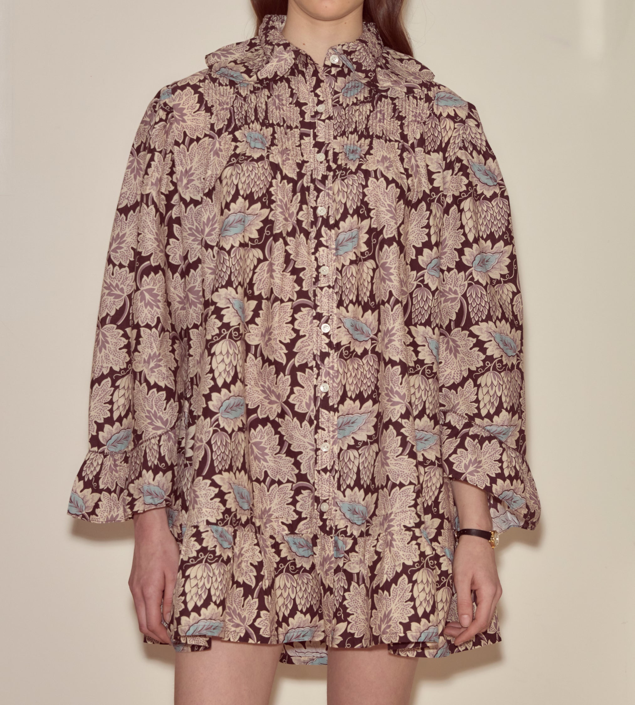 This dress is printed with a intricate Victorian botanical pattern. It is cut like an antique nightgown, with rows of pintucks and ruffles around the cuffs and hem.