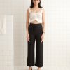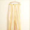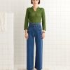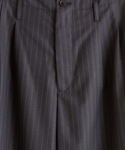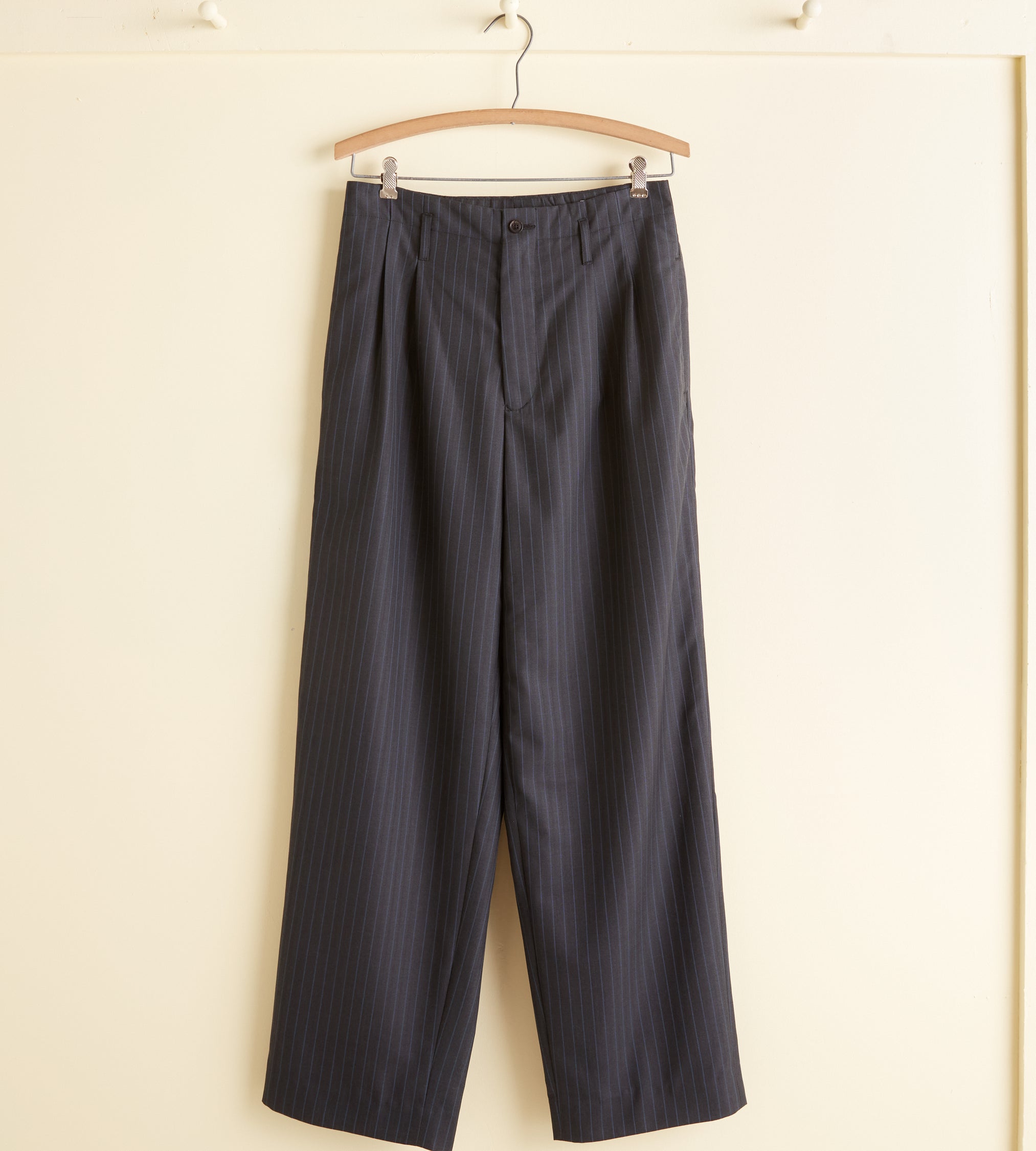 These trousers are made of deadstock wool from the late 20th century, likely intended for suiting. The fabric is navy with blue pinstripes, and the trousers have a mid-rise and a wide leg. Hand-mending throughout.