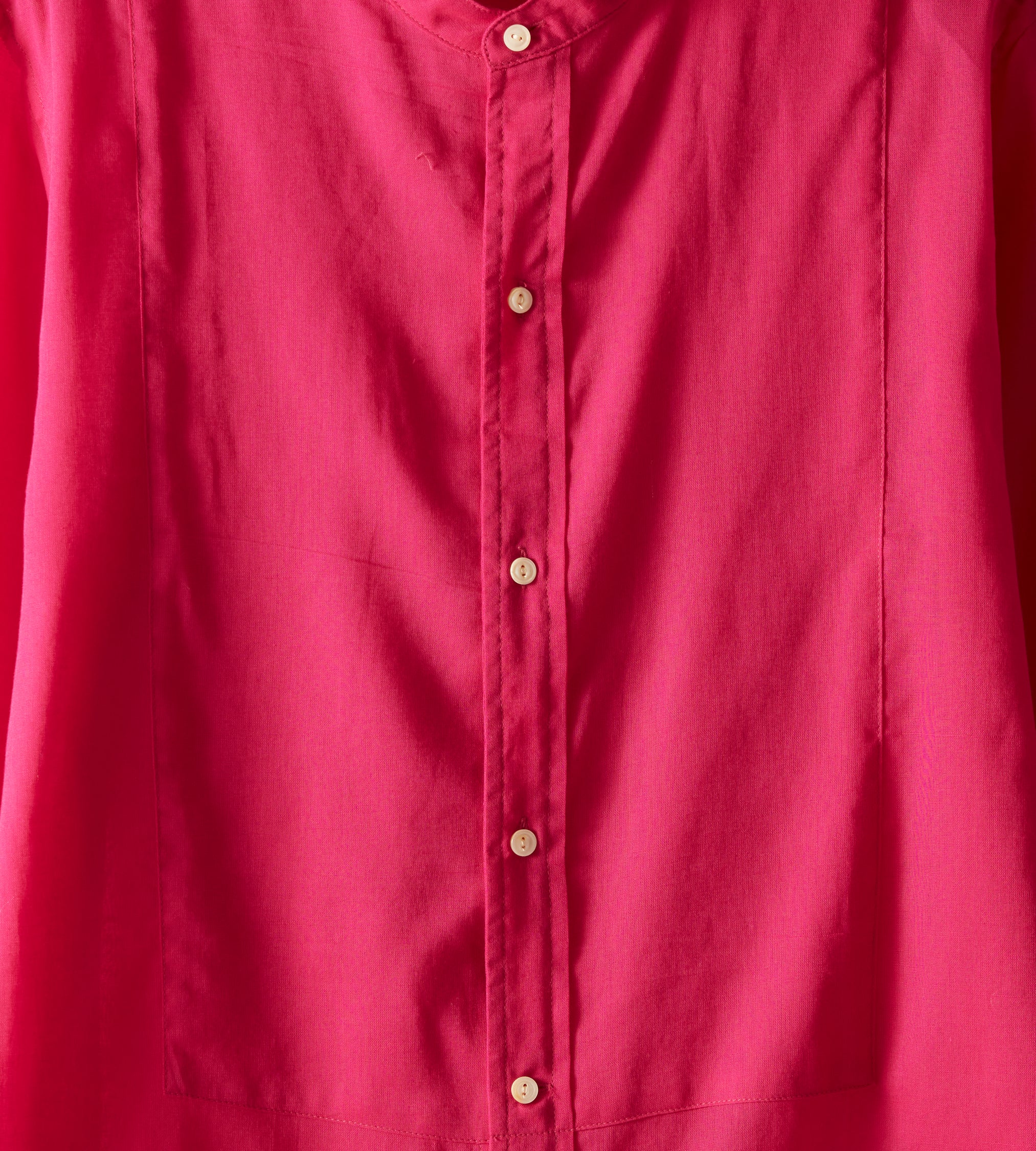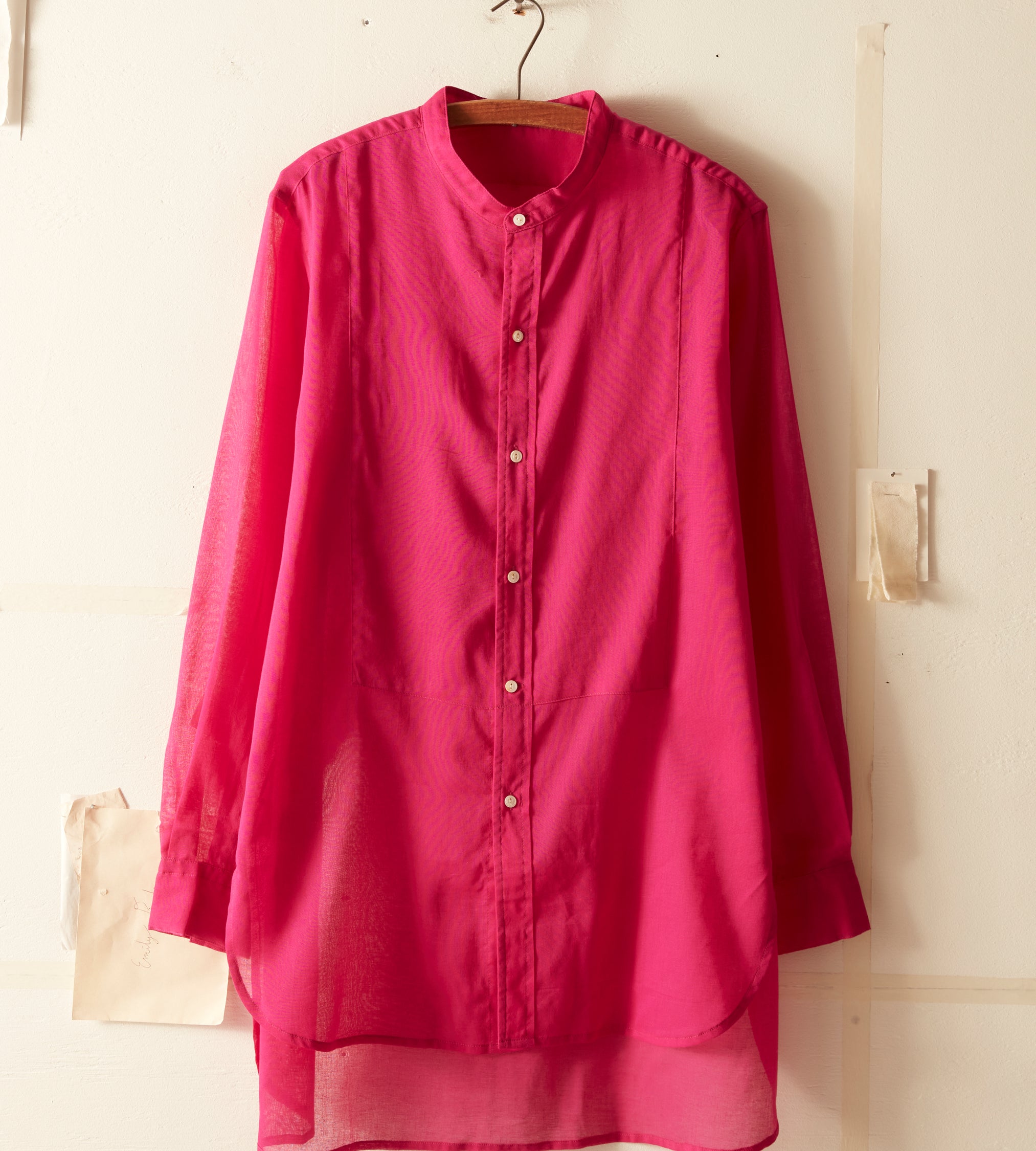 This tunic is made from deadstock cotton voile. It has an elongated fit and a band collar.