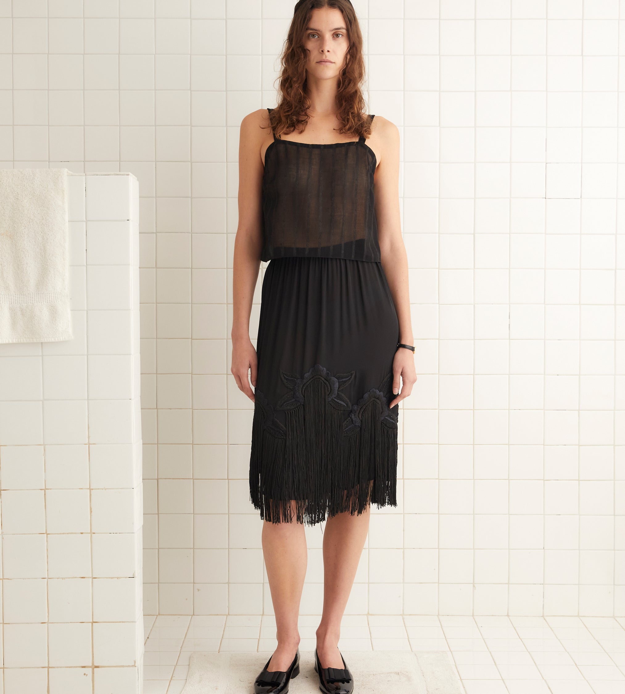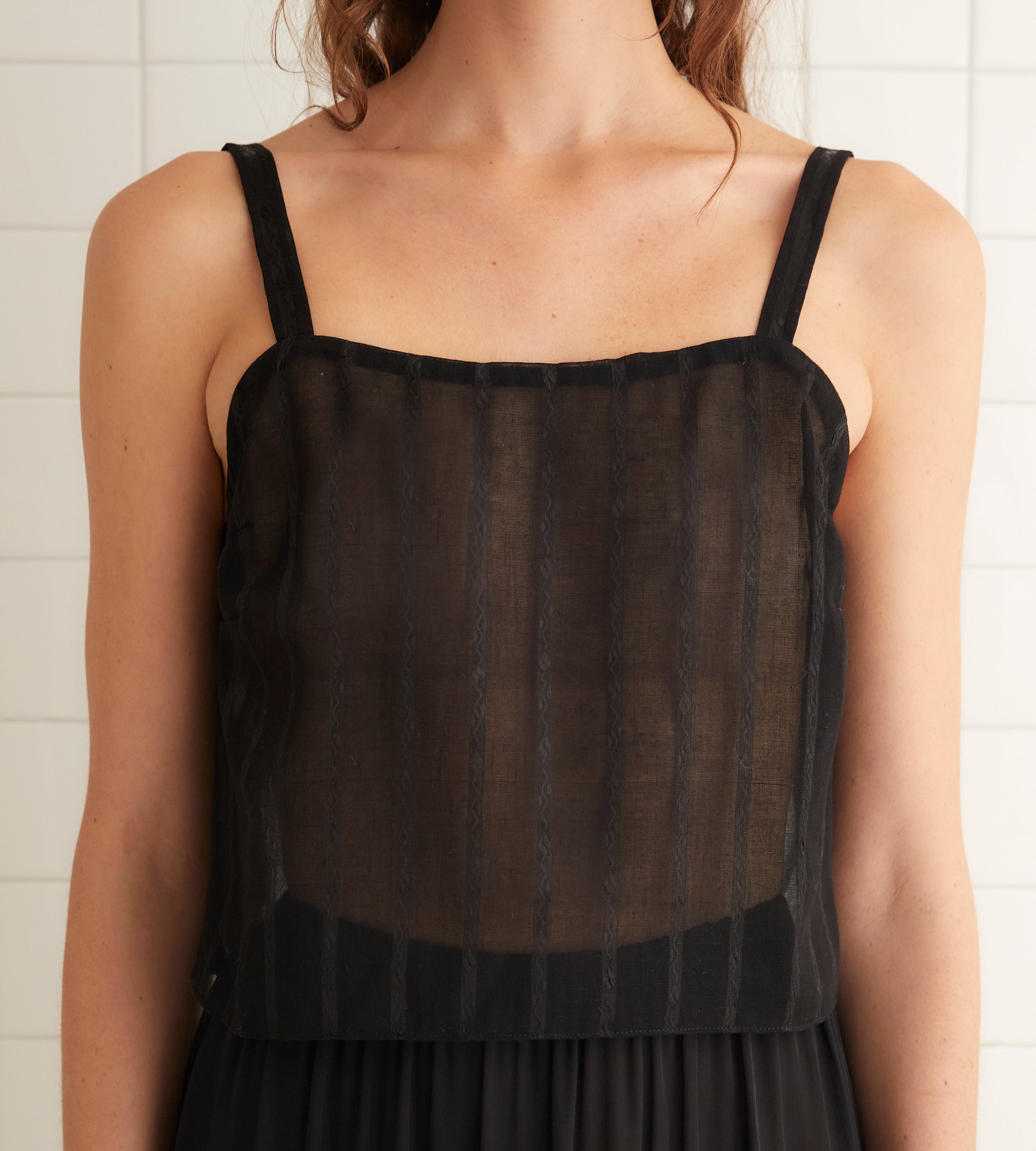 This tank is made from deadstock yardage from the late 20th century, woven with a jacquard stripe pattern. Hand-mending throughout.