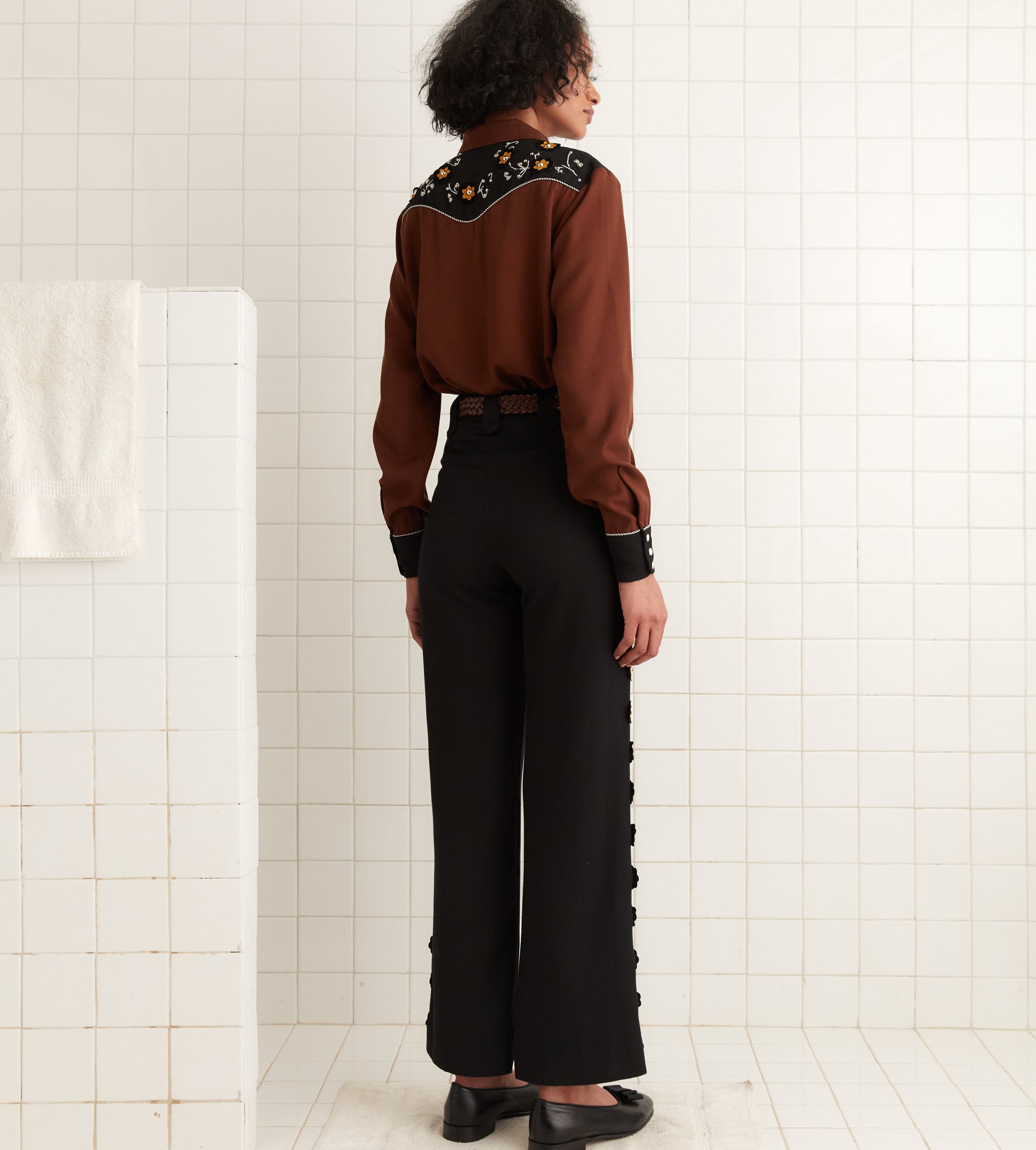 These trousers are inspired by a branded costume from a 1960s Western TV show. We reproduced the studded felt flowers down the side seams of these pants, which are made from lightweight wool twill and feature distinctive Western smile pockets.