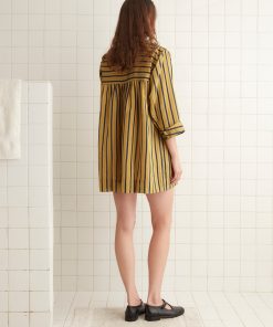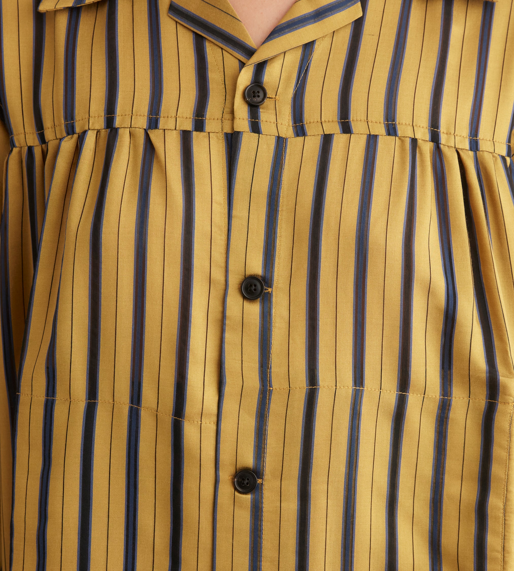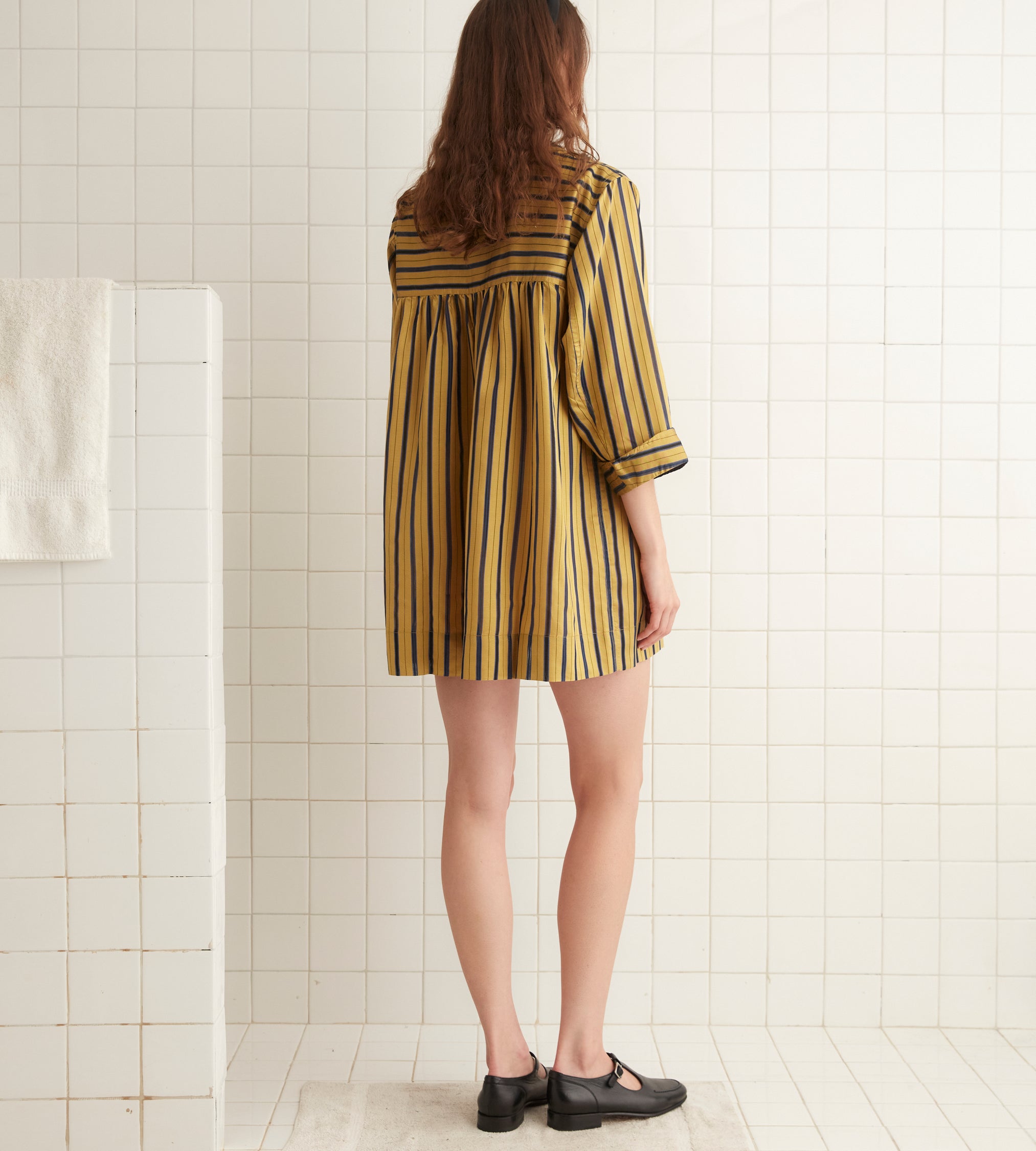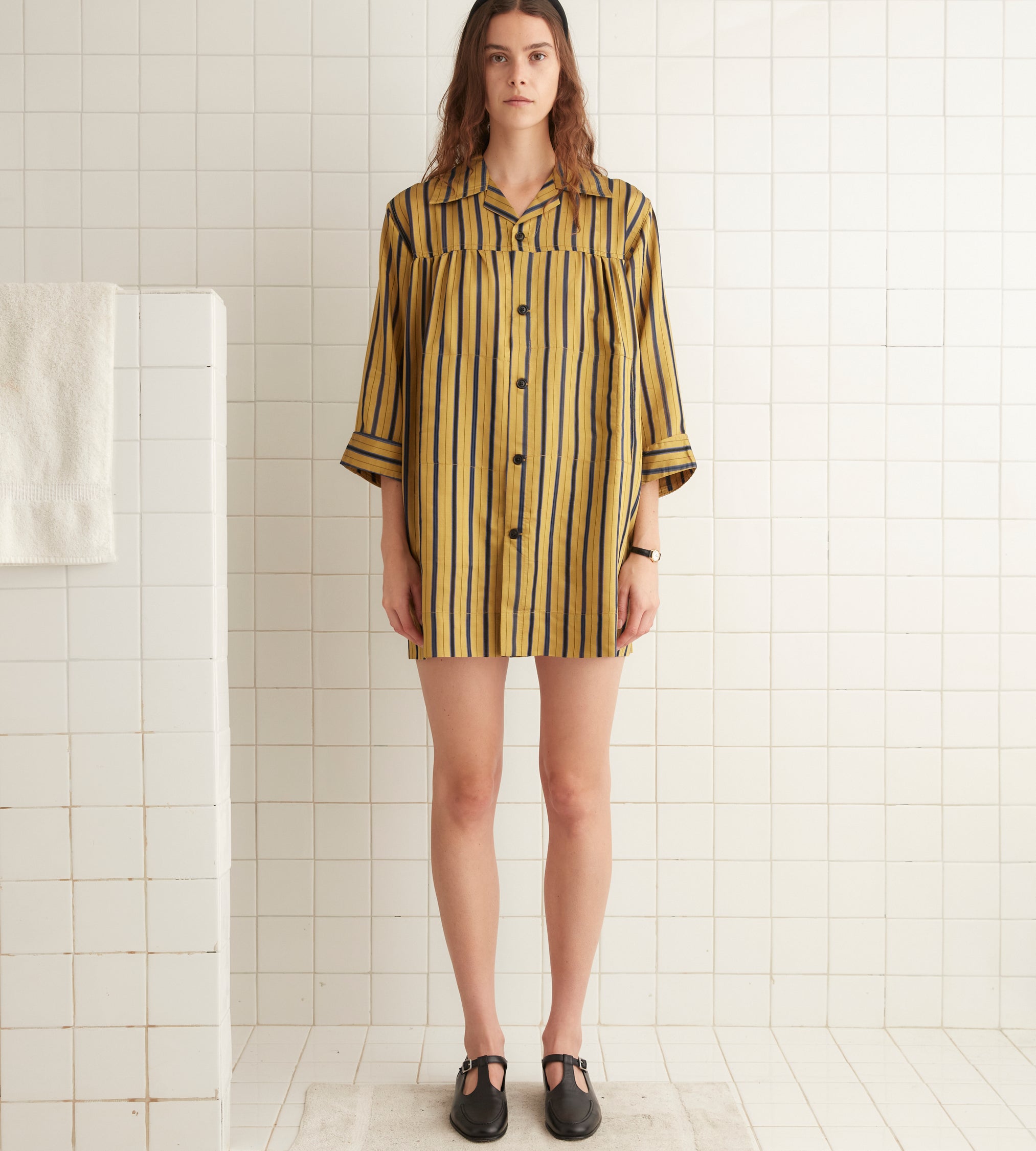This style is inspired by a vintage women’s dress, c.1970s. We reproduced the silhouette in silky fabric with navy and gold stripes.