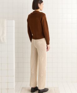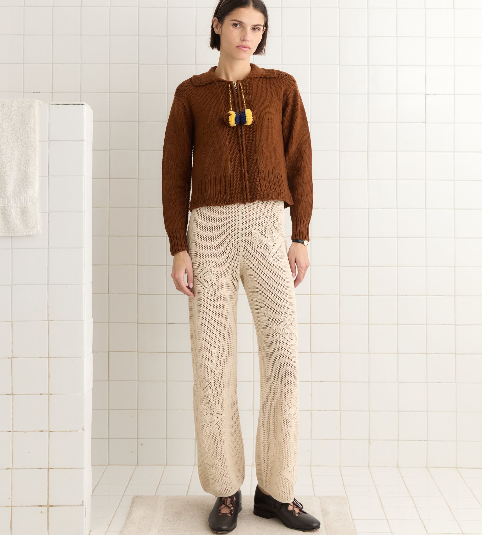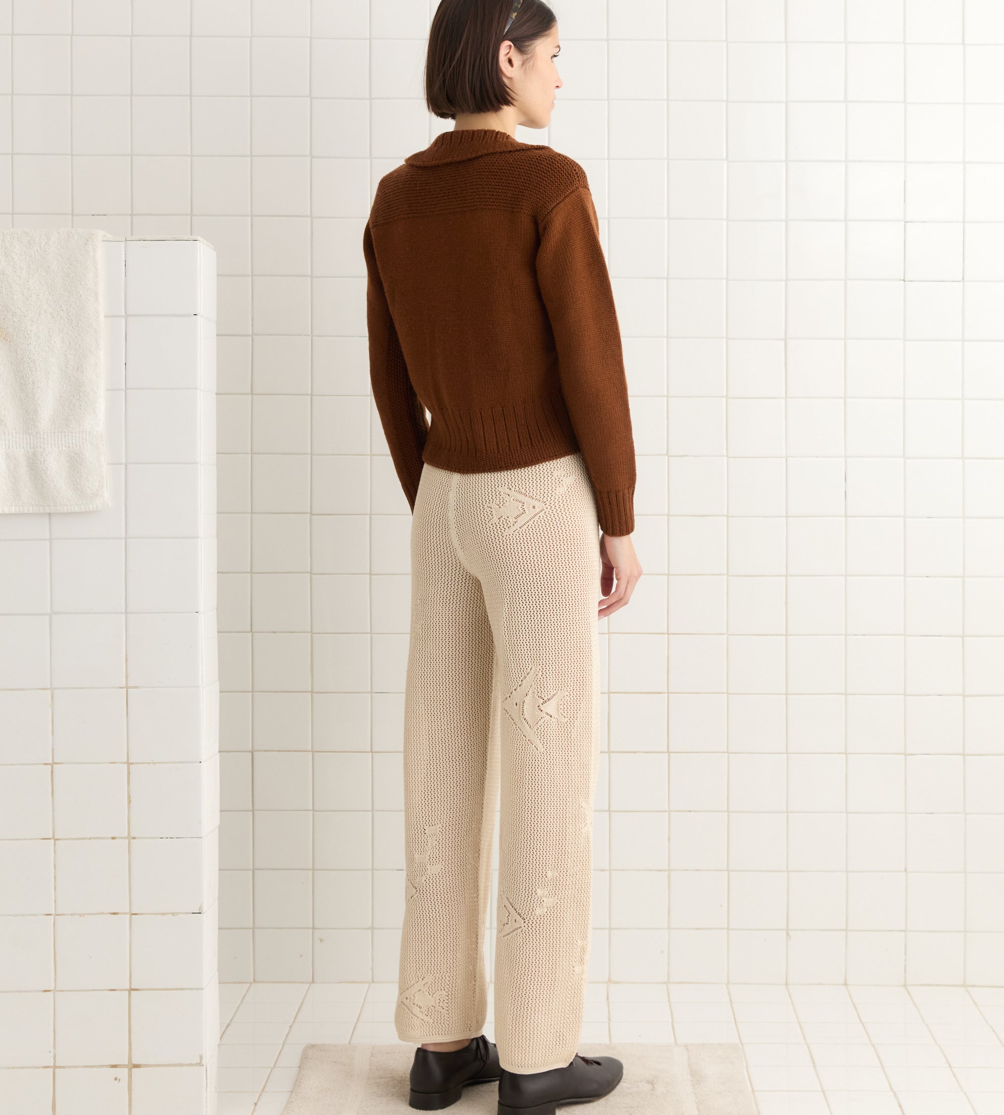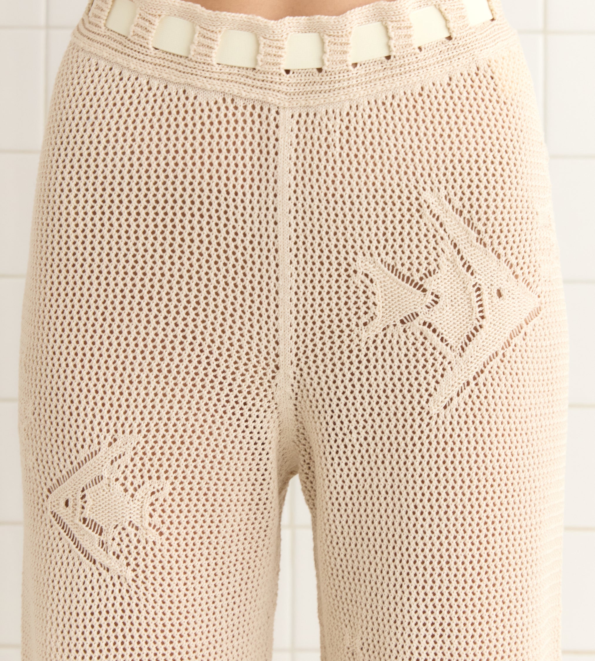 These pants are inspired by a printed tee from the 1970s. We reproduced the angel fish pattern in a knit lace for this style, which features a woven elastic around the waistband.
