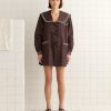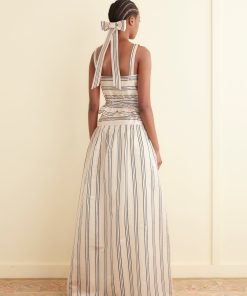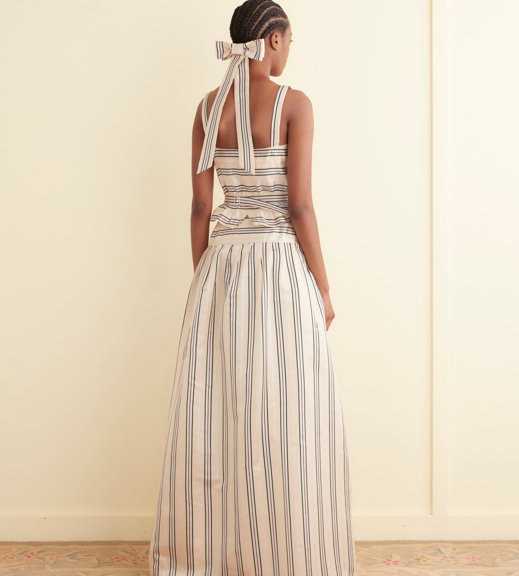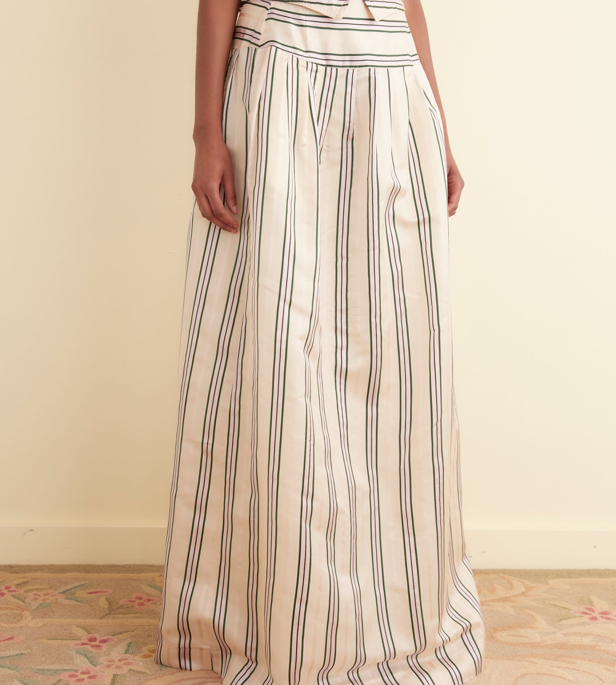 This skirt is inspired by silk from the 1920s, which was woven in this cream, purple, and green stripe pattern. We recreated the fabric for this style.