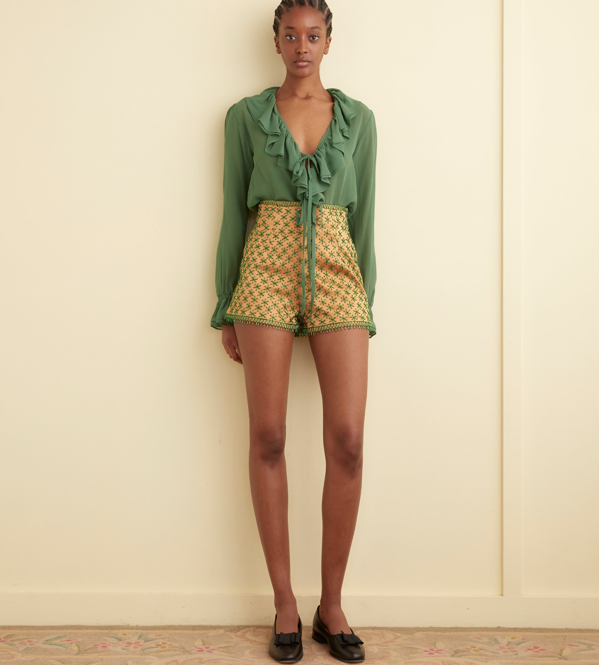 This style is inspired by a pair of beaded tap shorts from the 1920s. We reproduced the fitted, high-waisted silhouette here. The shorts are covered with beaded bugle-bead stars and fringe at the hem.