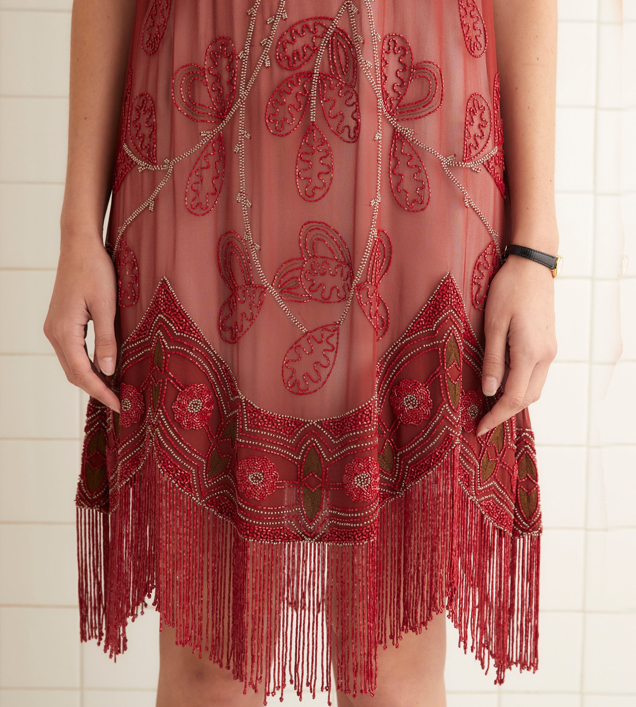 This style is a reproduction of a dress from the 1920s. It features red and silver beading with bronze bullion embroidery accents and has a fringed, scalloped hem. All beadwork was done by hand.