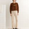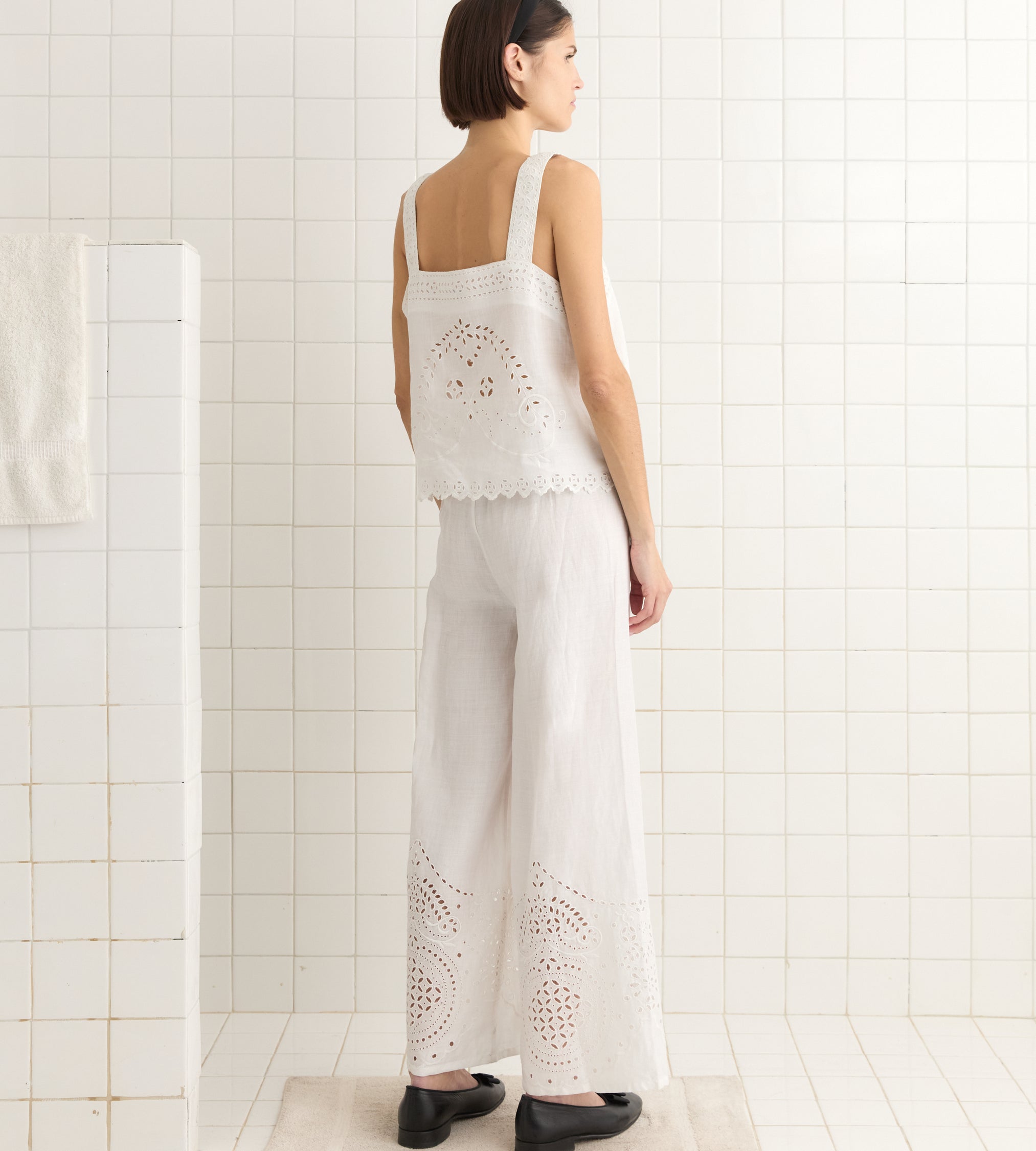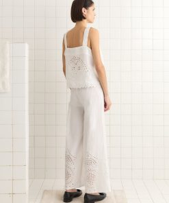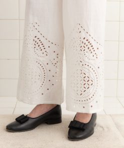 This pants are inspired by a bed jacket from the 1890s. We reproduced the broderie anglaise lacework for this style, which is made of lightweight linen.