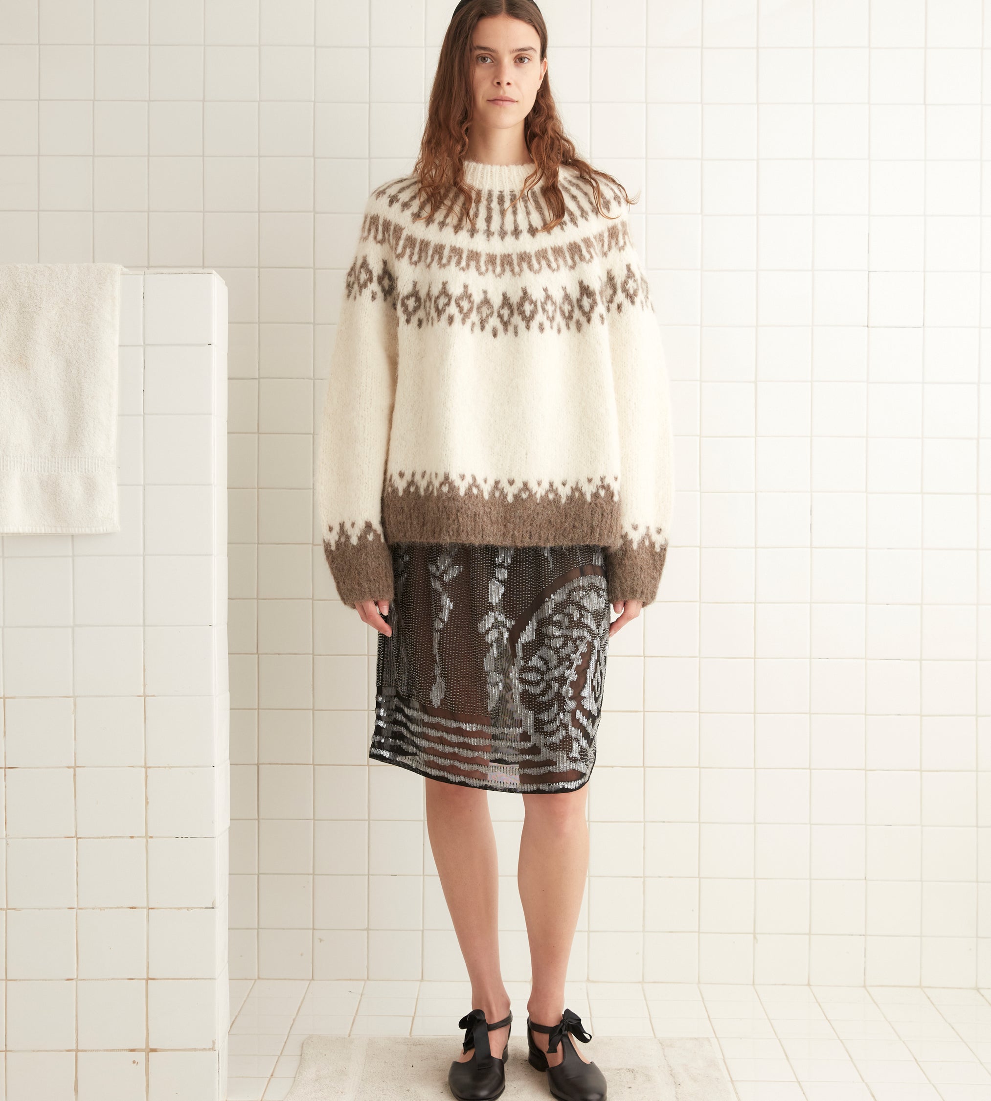 This sweater is inspired by a Lopapeysa sweater from the 1960s-1970s, a traditional Icelandic style with a patterned yoke. We reproduced the original sweater for this style.
