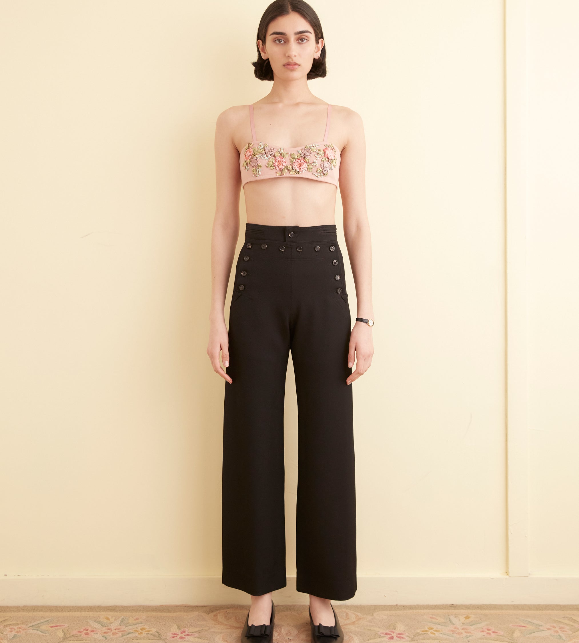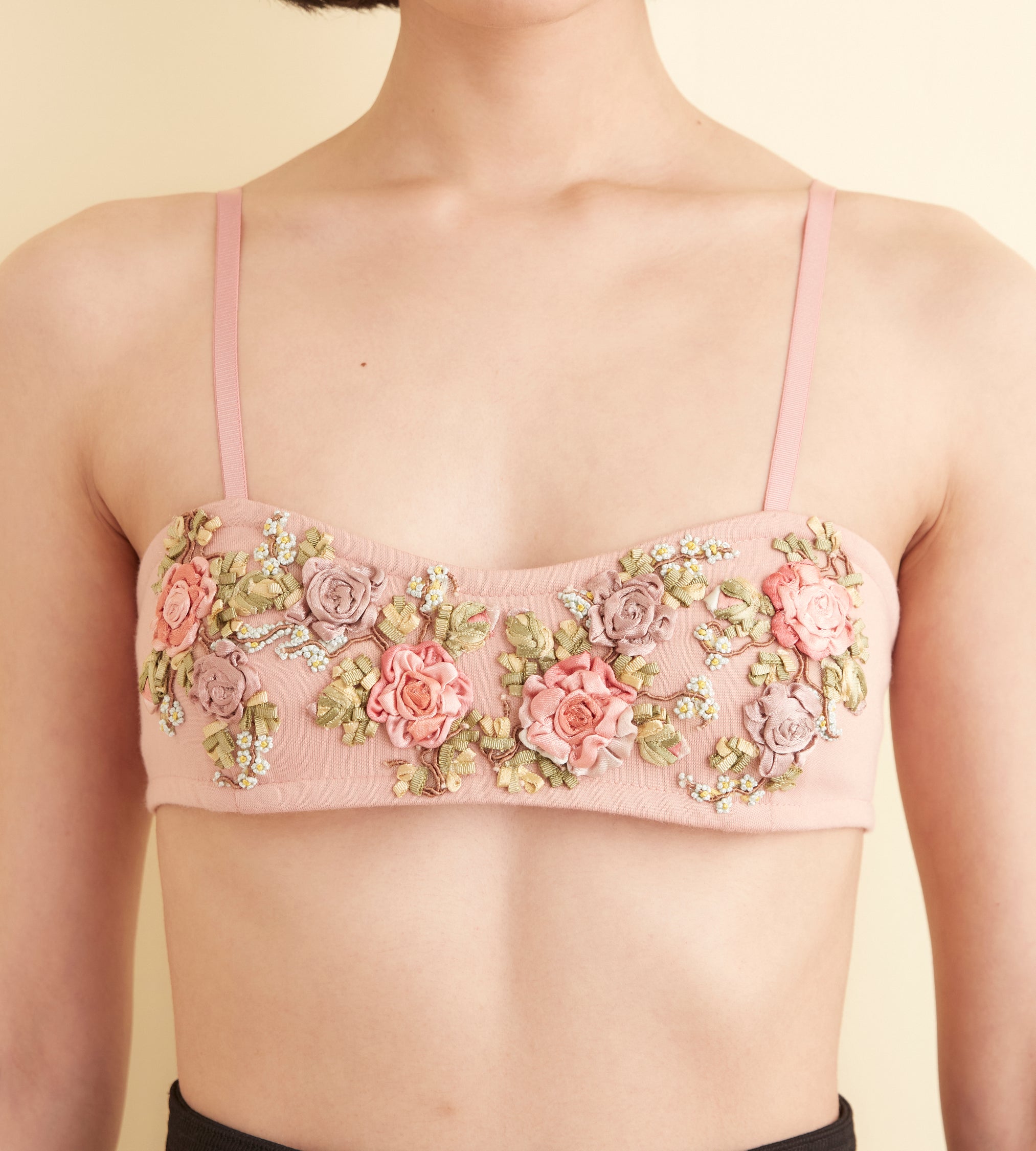 This bra is inspired by a 1930s bralette. We reproduced the silhouette for this style, which has been appliquéd with leaves and flowers made of silk ribbon.