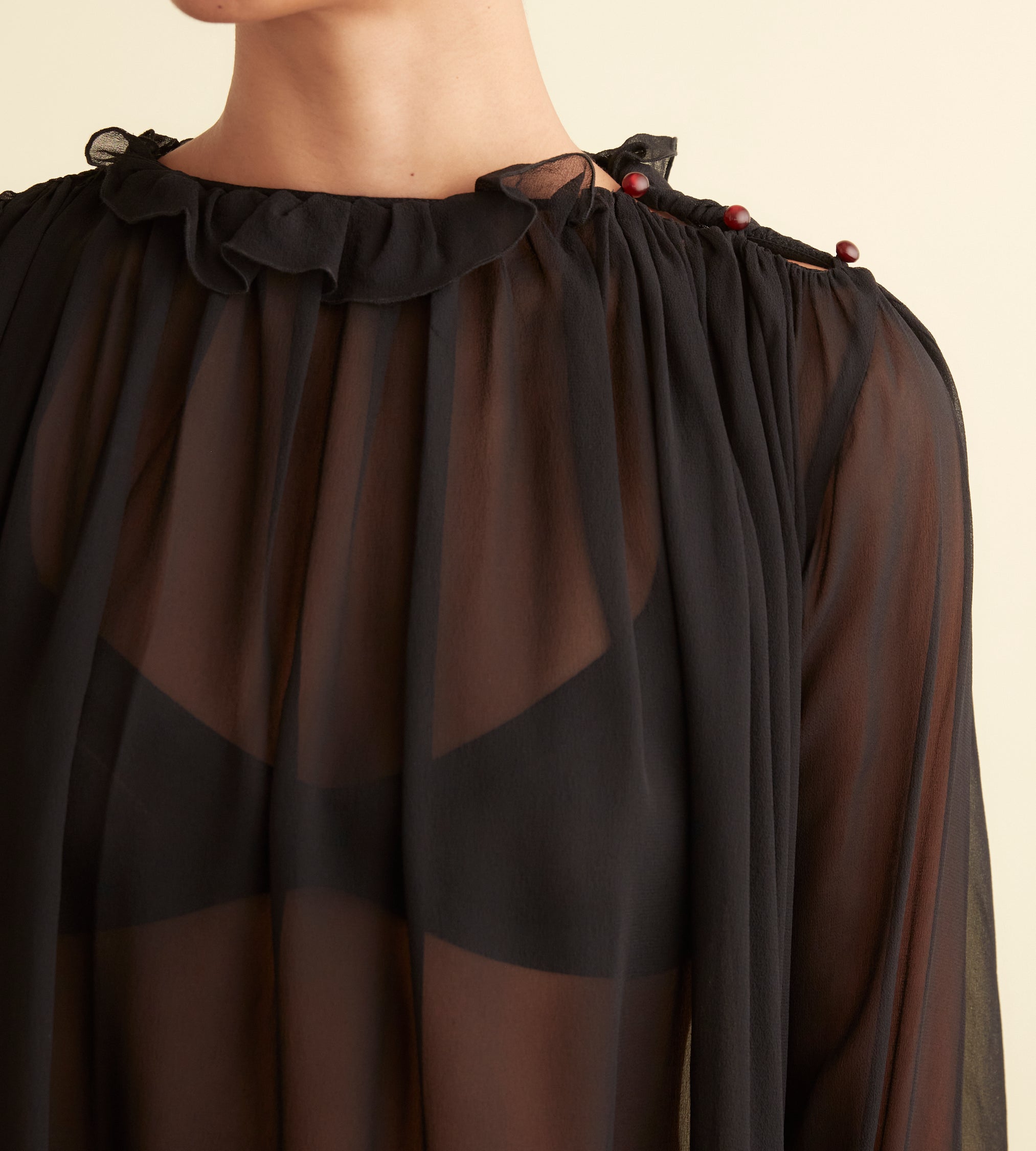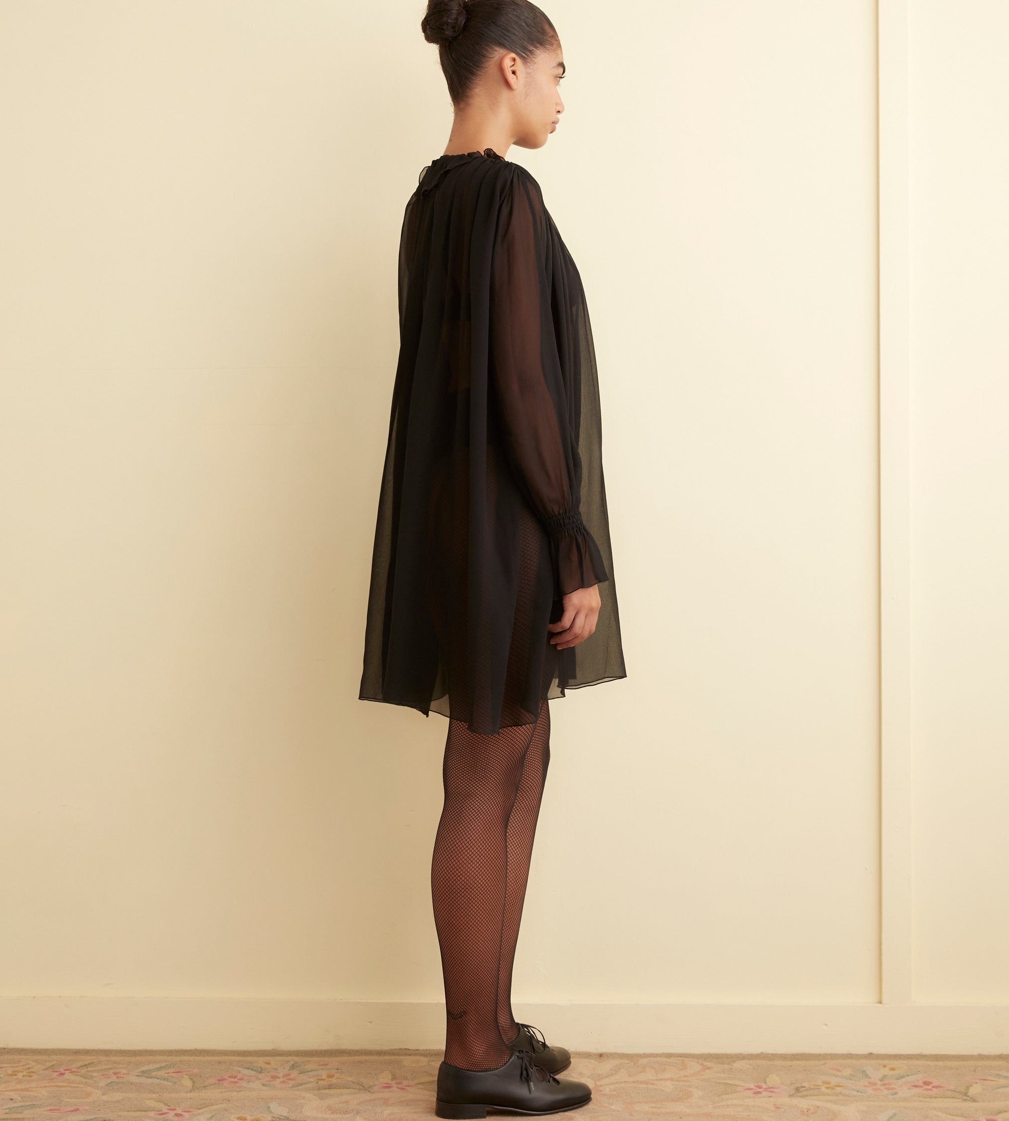 This style is inspired by a dress from the 1920s. We have reproduced the original piece, with its gathered, unfitted silhouette. The neckline is trimmed with a ruffle detail and the sleeves with smocking.