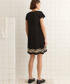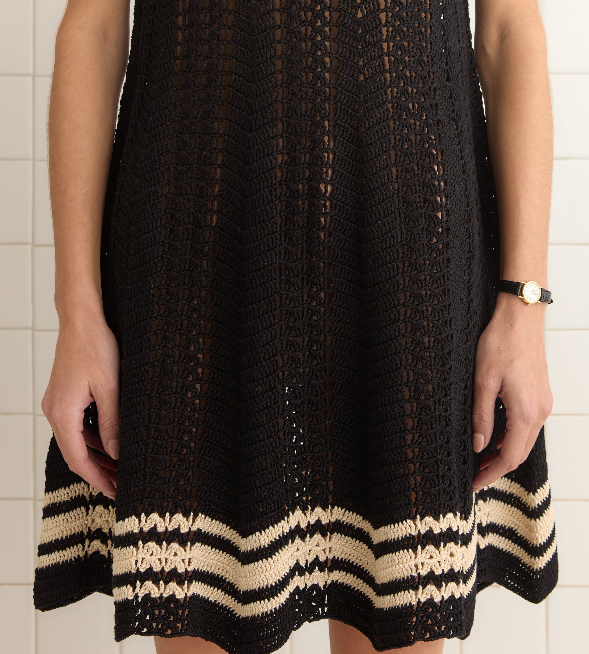 This hand-crocheted dress is inspired by a vintage knit top from Italy. We reproduced the zig-zag hem and striped crochet pattern for this style.