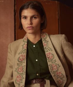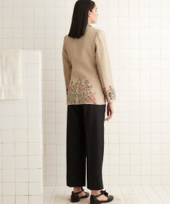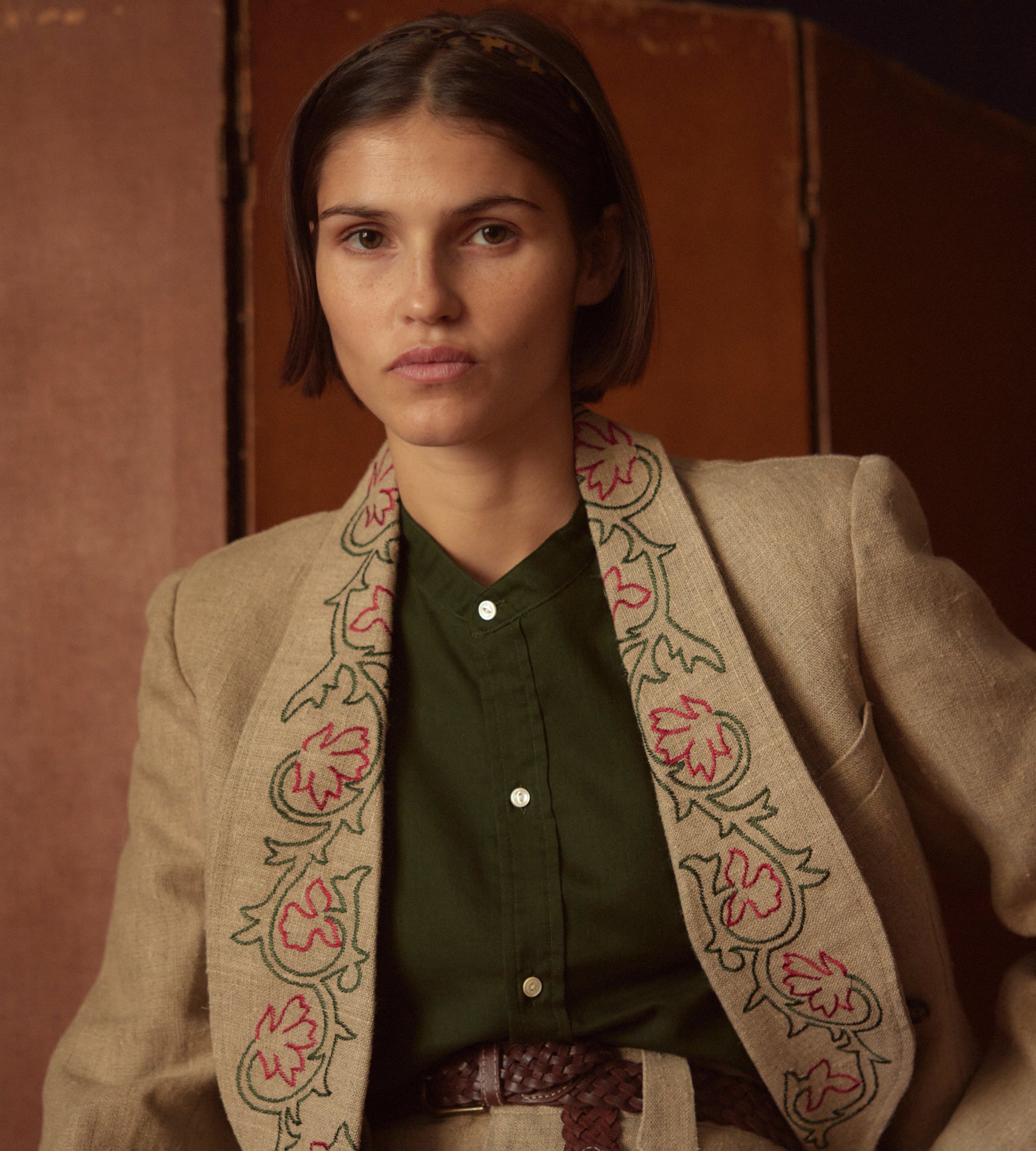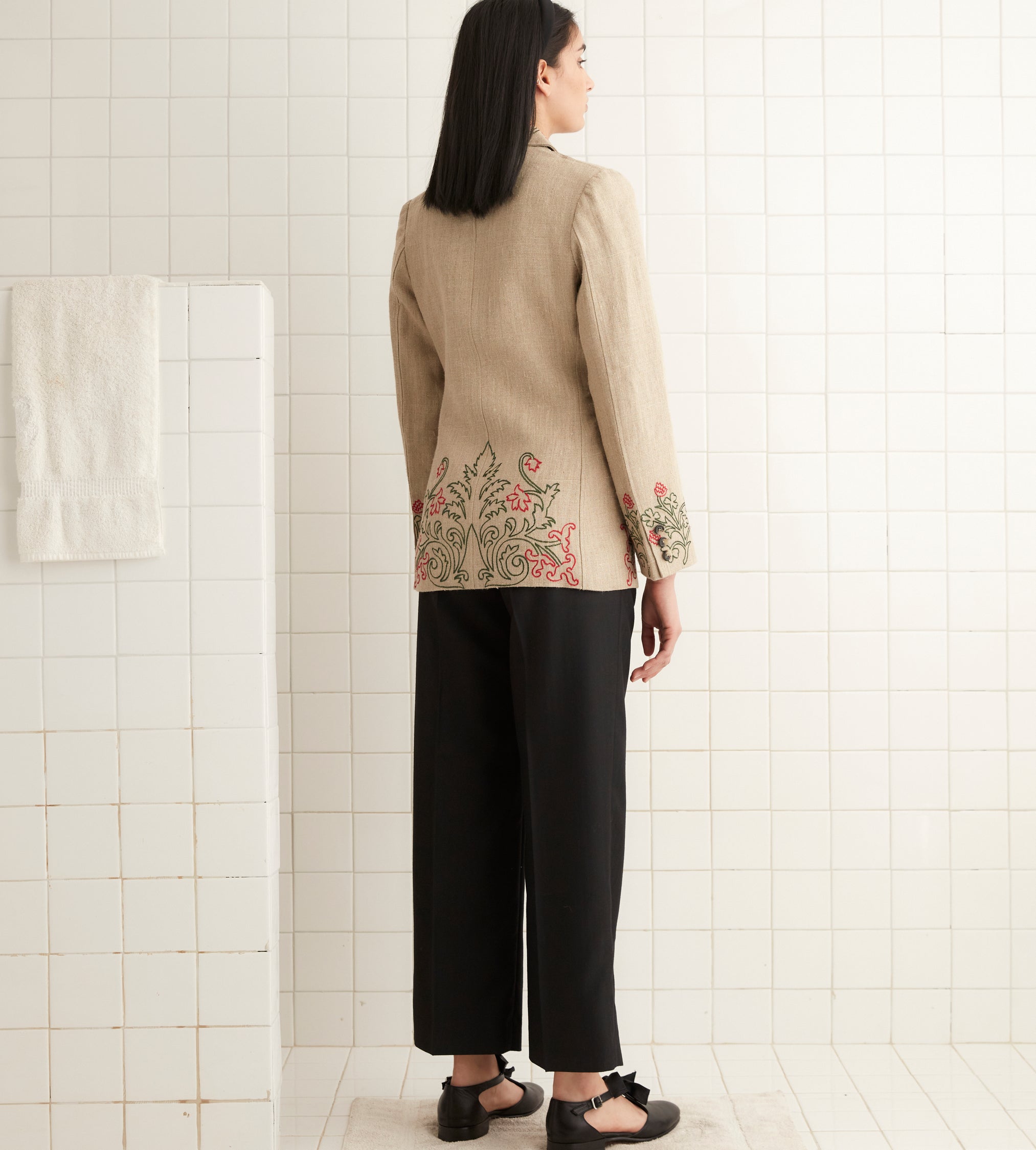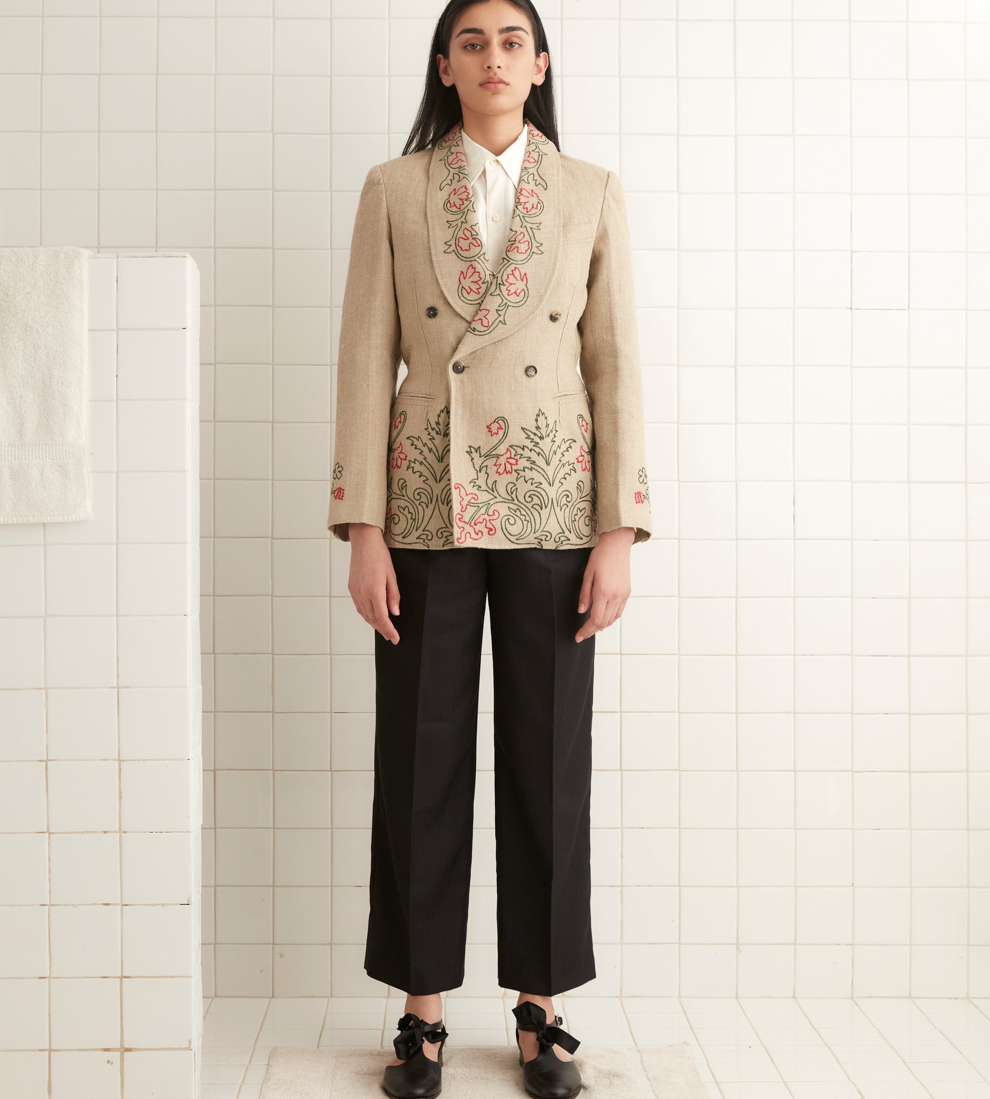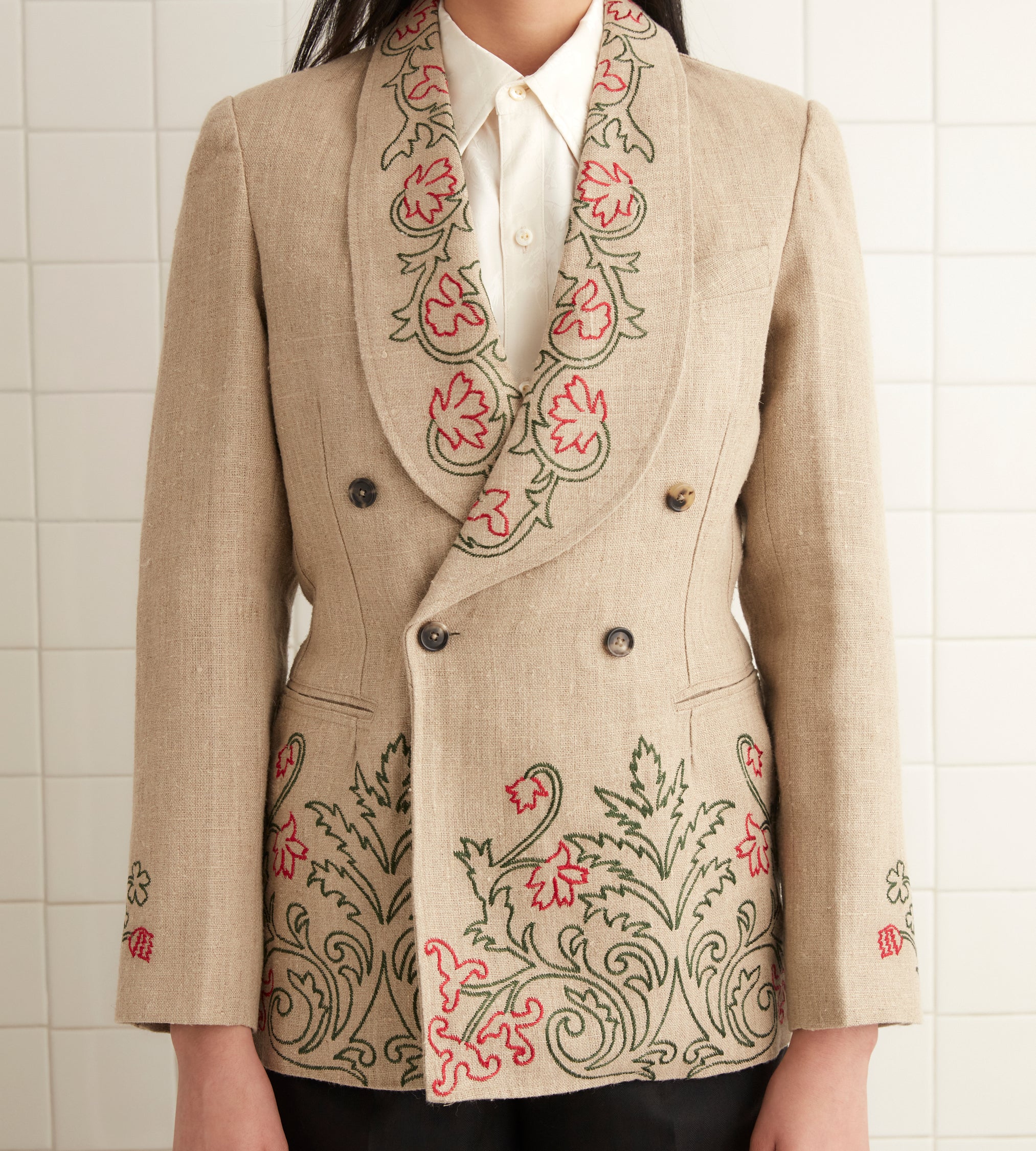 This suit jacket is inspired by an embroidered Victorian travel bag, circa 1860s-1890s. We reproduced the fabric and floral embroidery for this style, which has a shawl collar and a double-breasted silhouette.