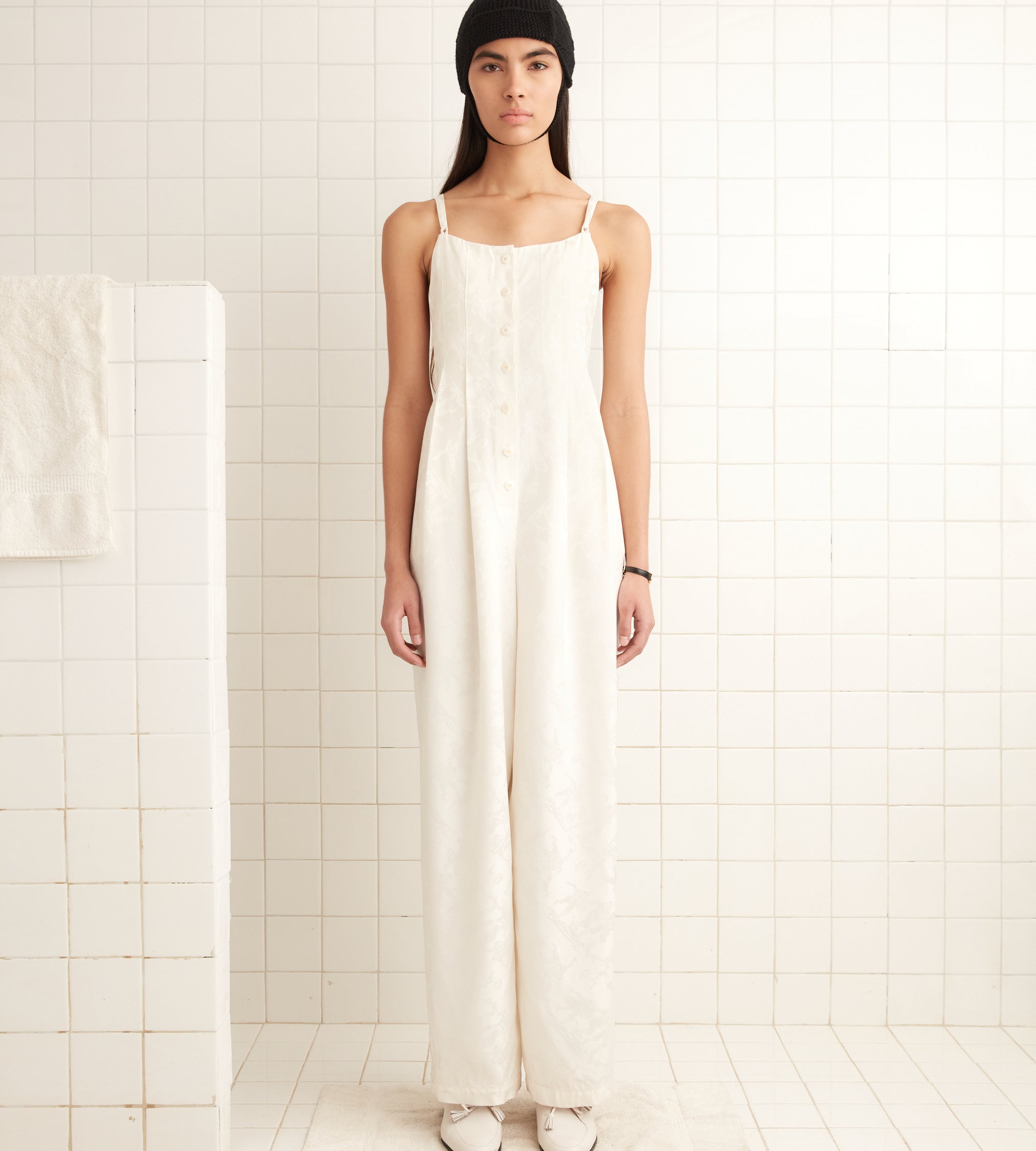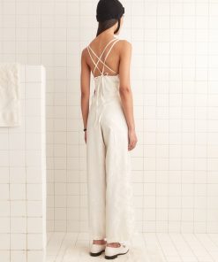 This jumpsuit is inspired by deadstock yardage from the midcentury, woven with a pattern of football players. We reproduced the fabric for this style. The jumpsuit has a loose, relaxed fit, with straps that cross over the shoulders and tie at the back.