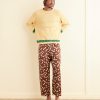 This jumpsuit is inspired by deadstock yardage from the midcentury, woven with a pattern of football players. We reproduced the fabric for this style. The jumpsuit has a loose, relaxed fit, with straps that cross over the shoulders and tie at the back.