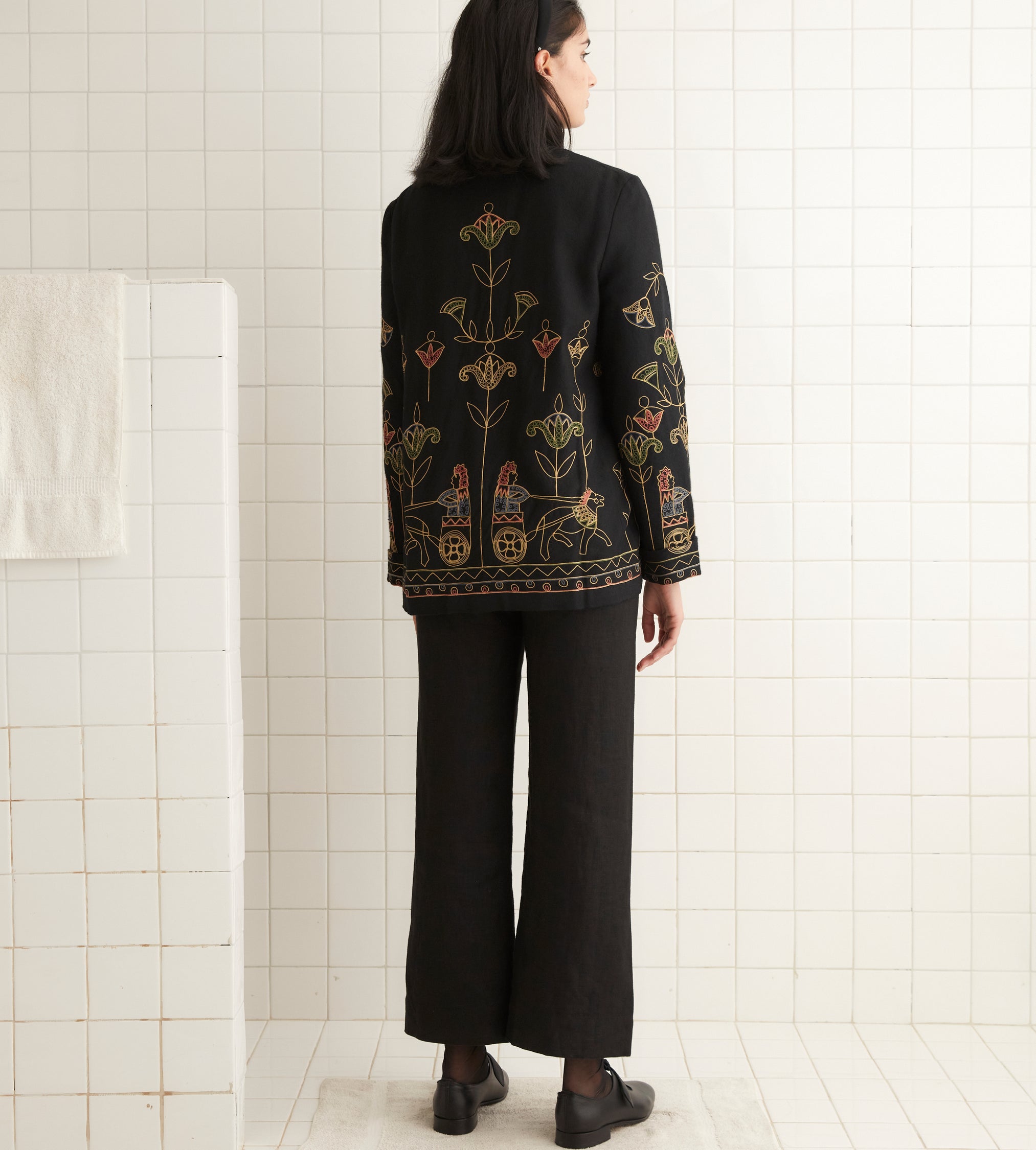 The Egyptian Revival, or “Egyptomania,” as it was called at the time, was fanned by archaeological discoveries thorughout the decade, especially of the tomb of Tutankhamen in 1922. We reproduced the chain-stitched embroidery of the original jacket along the hem of this piece.