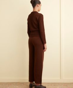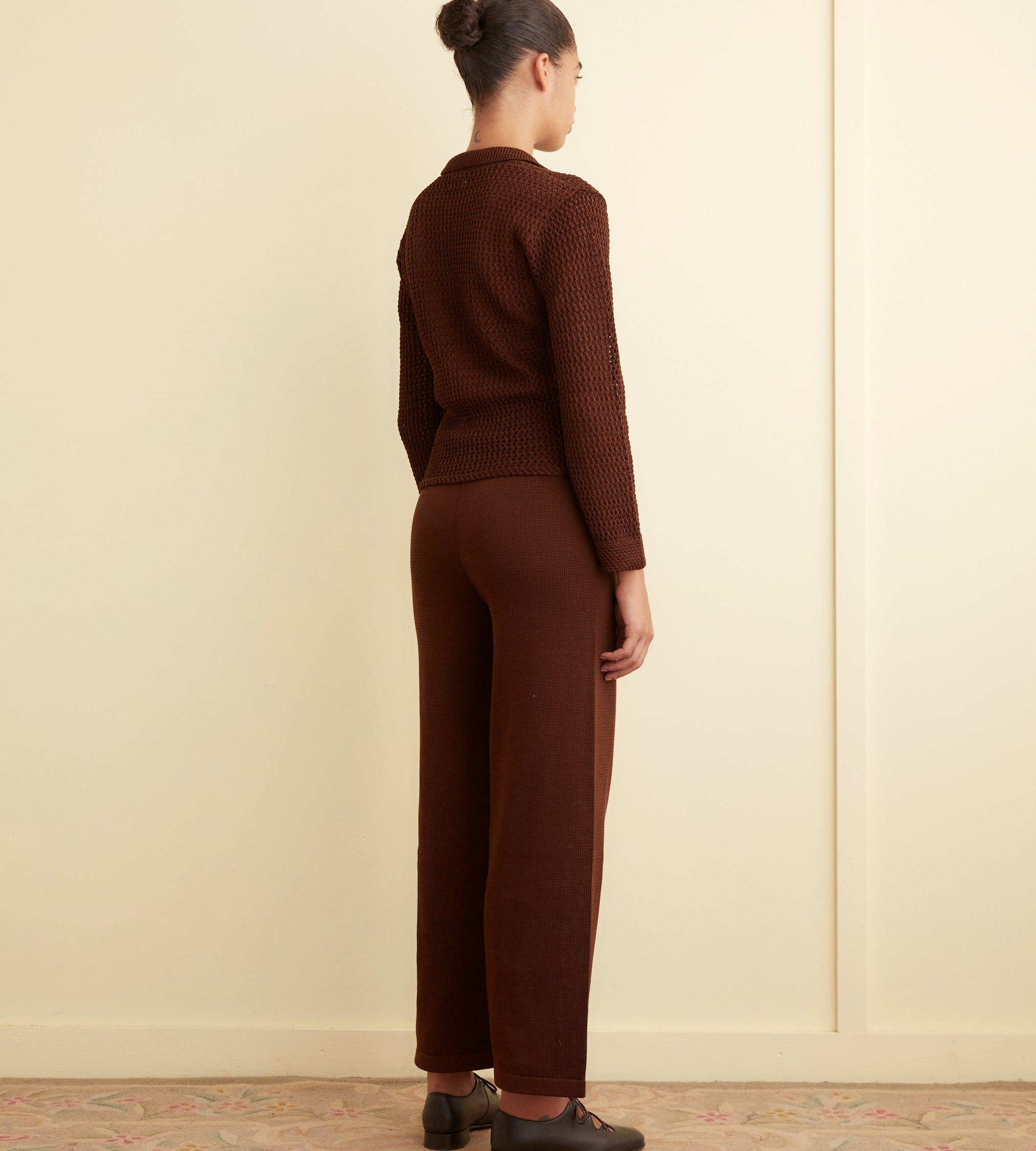 These pants are inspired by a pair of women’s knit pants from the late 20th century. We reproduced the silhouette and the crocheted ribbon detail at the waistband. The pants have a mid-rise and a straight leg.