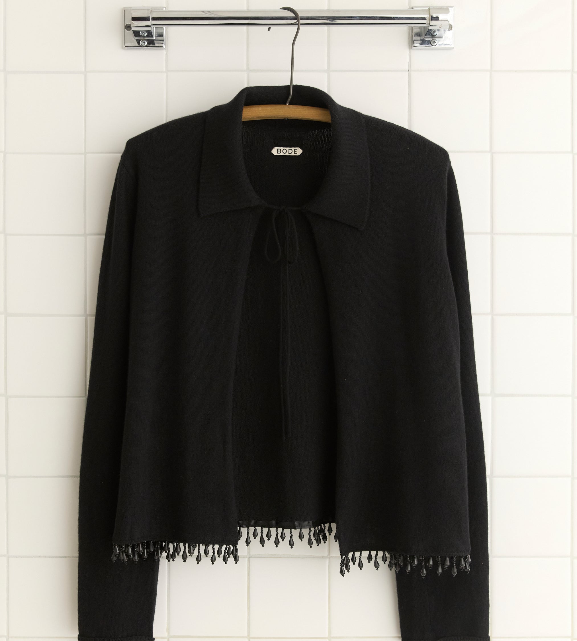 This style is inspired by a vintage French cardigan, sourced in Paris. We reproduced the silhouette, with its pointed collar and its tie-neck detail, in cashmere. The cardigan is trimmed with droplet beads.