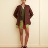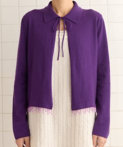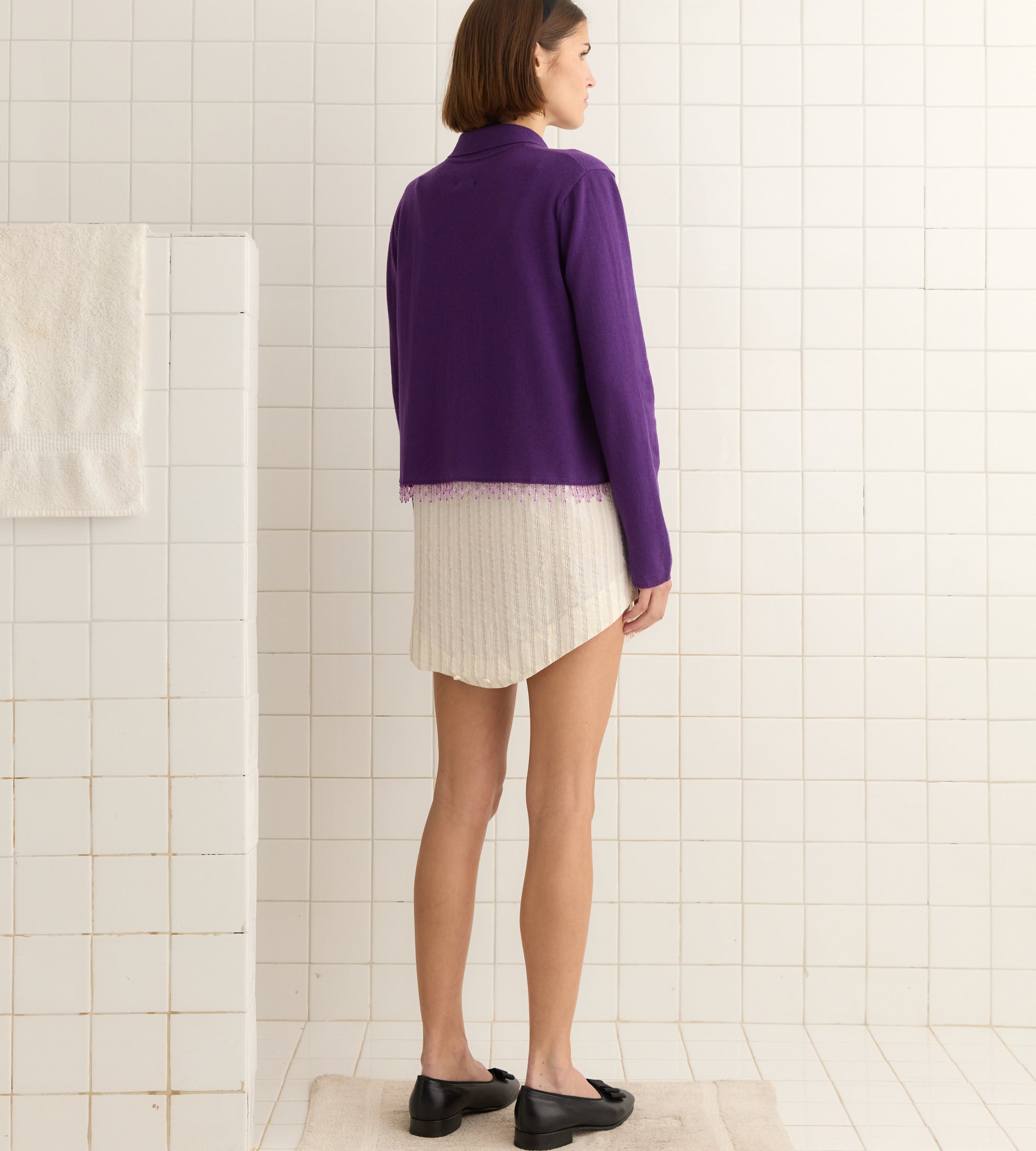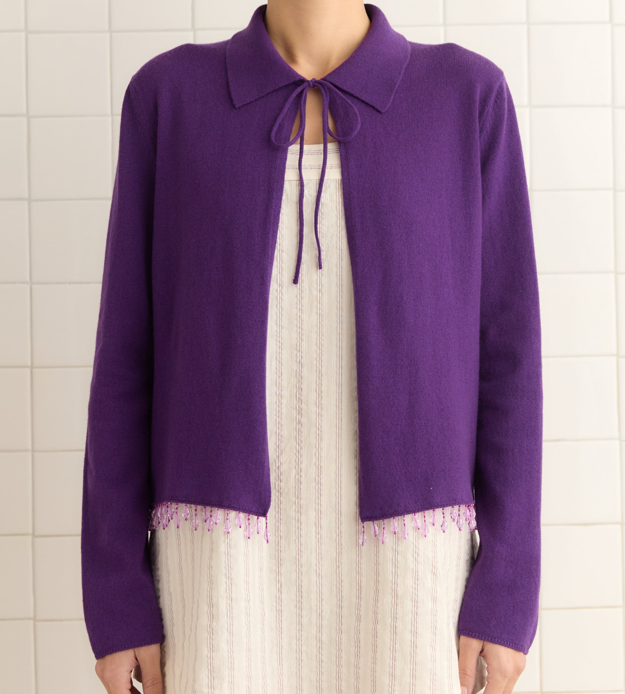 This cardigan is inspired by a vintage French cardigan, sourced in Paris. We reproduced the silhouette, with its pointed collar and its tie-neck detail, in purple cashmere with beaded trim.