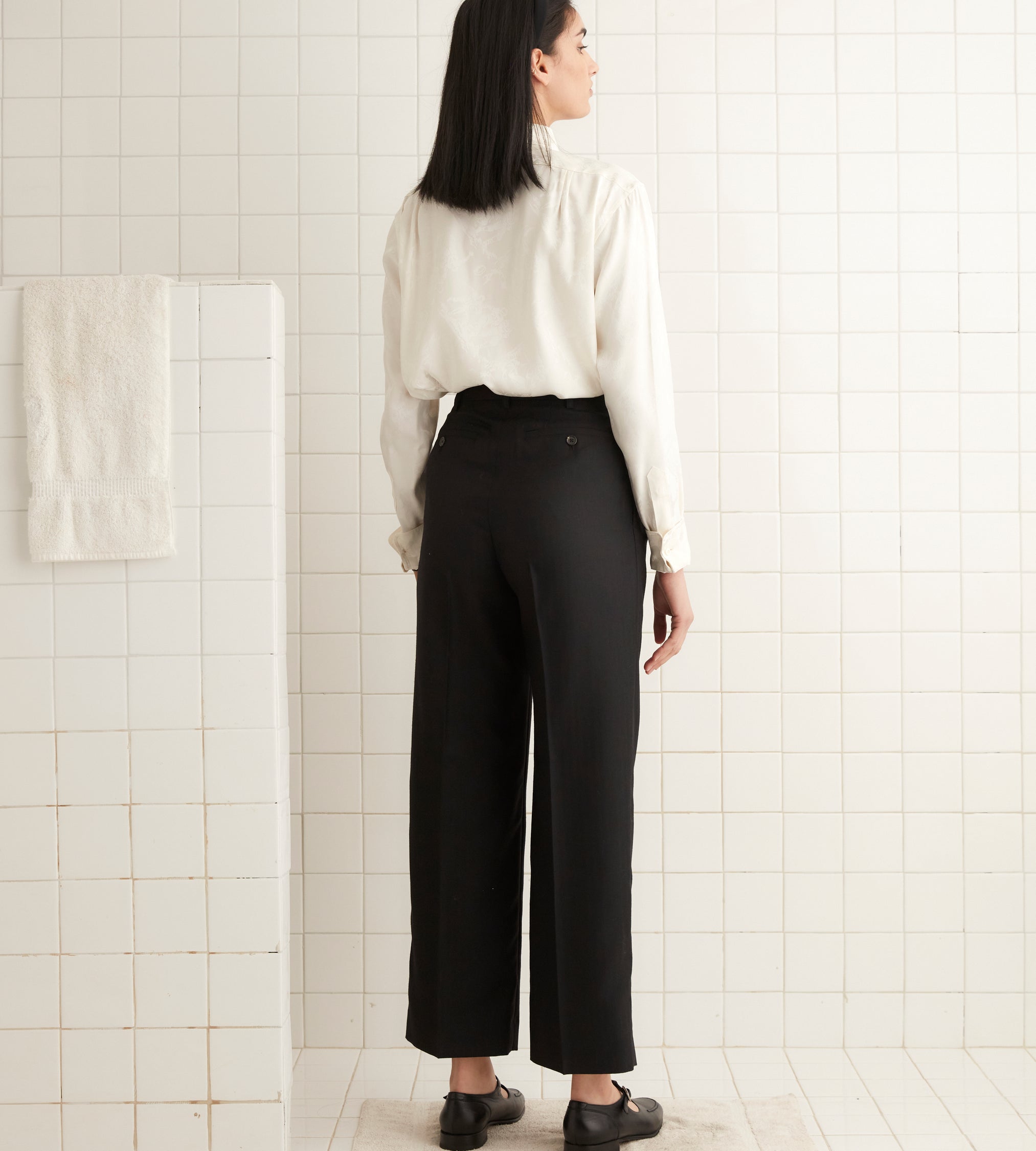 These trousers are inspired by men’s trousers from the 1940s-1950s. We reproduced the original silhouette, which has a wide leg and a tab button at the waist, in a lightweight, drapey wool.