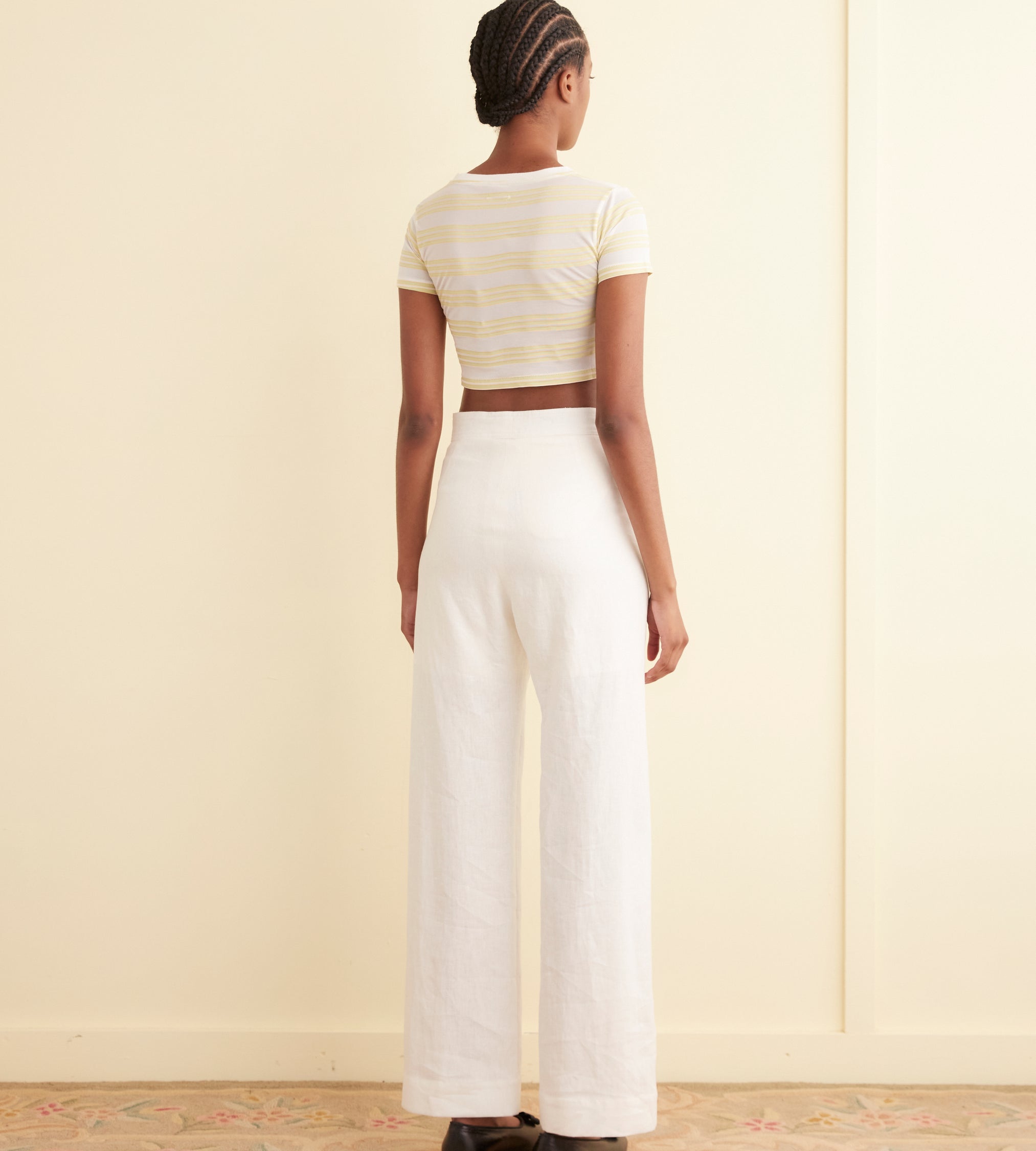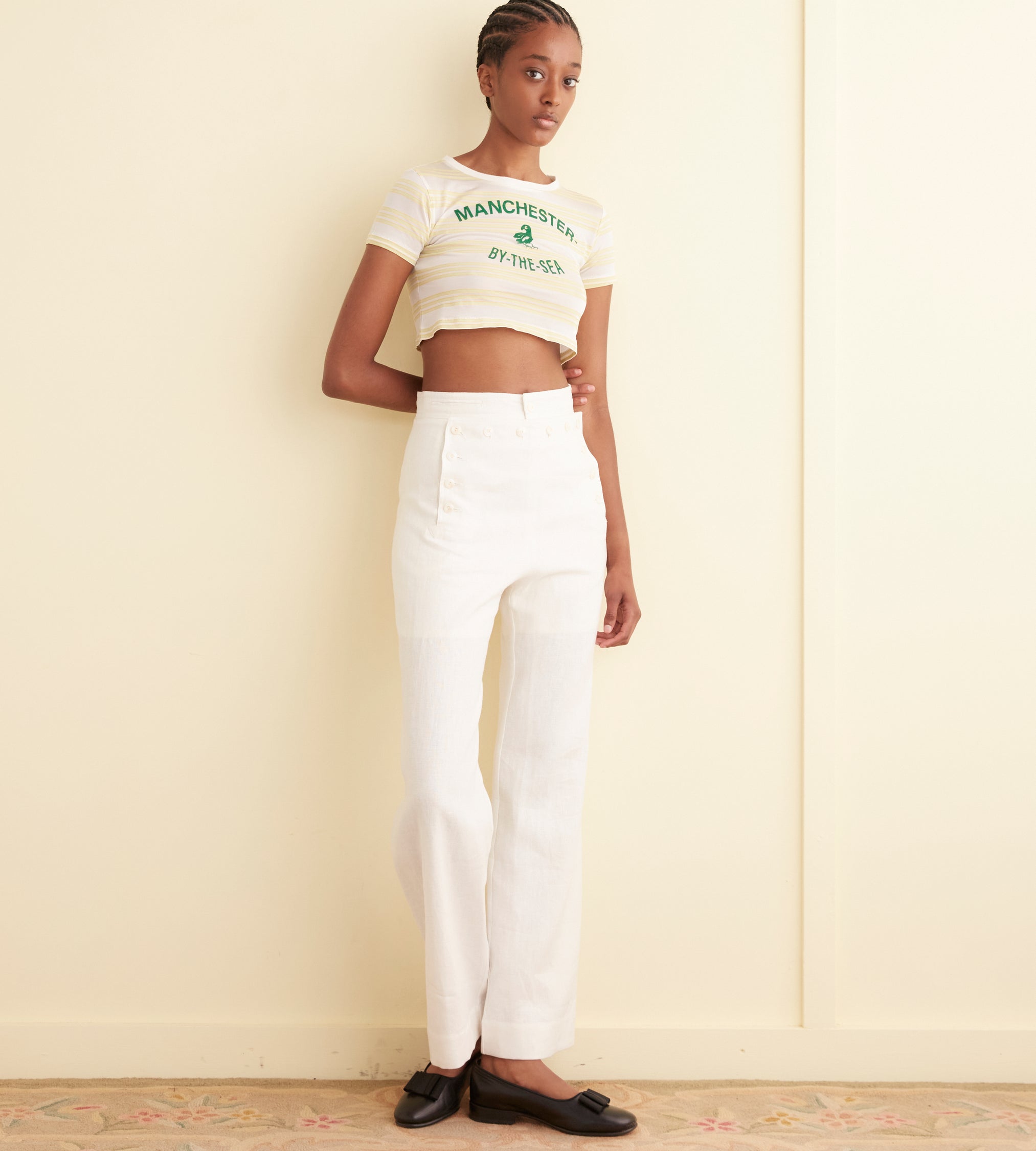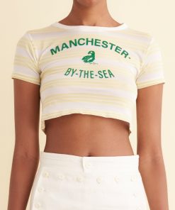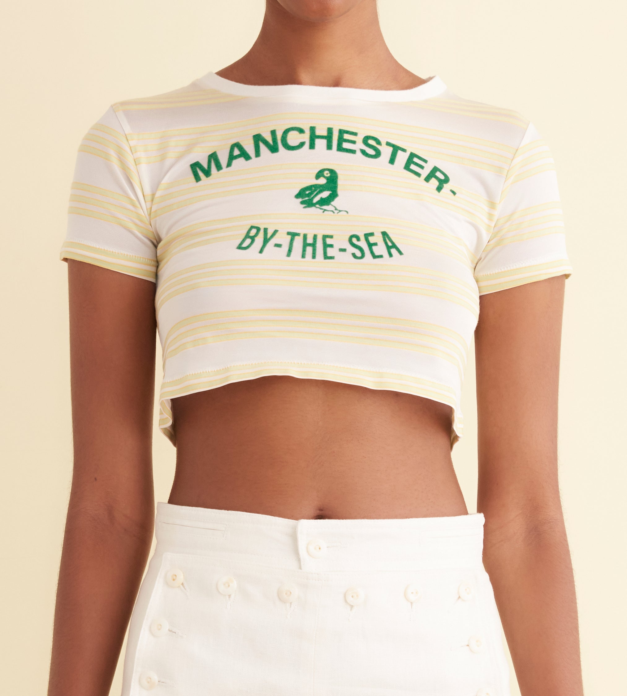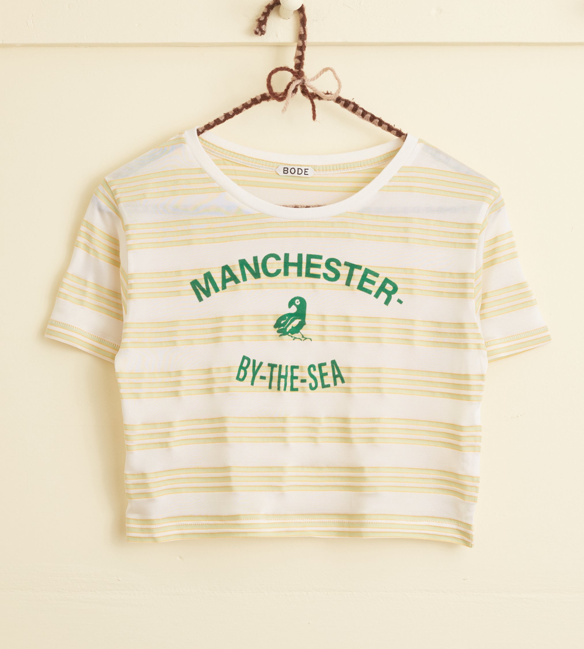 This tee is inspired by a 1920s sock, which was patterned with this green and yellow stripe. We reproduced the original pattern on this shrunken tee shirt, made of a silky cotton/rayon blend. The “Manchester-by-the-Sea” design is flocked, a decorative process in which tiny fibers are dusted over adhesive to create a velvety texture.