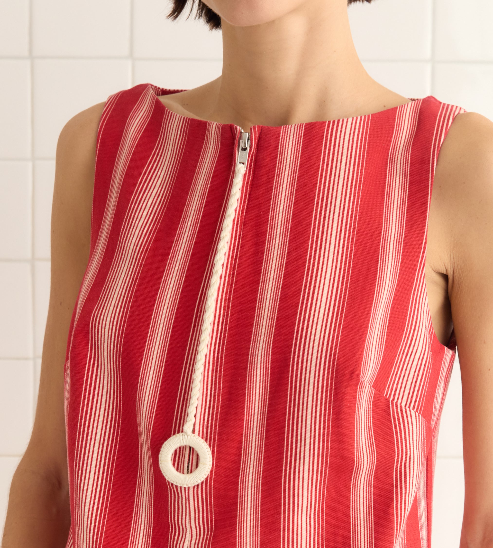 This style is a historical reproduction of a dress from the 1960s. We reproduced the Mod silhouette, with its ripple hem and crocheted zipper pull, in a red-and-white fabric recreated from a book of 1960s awning stripes.