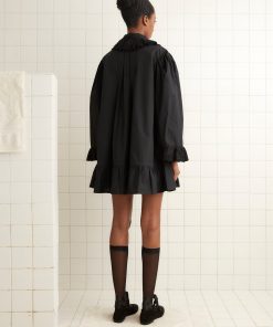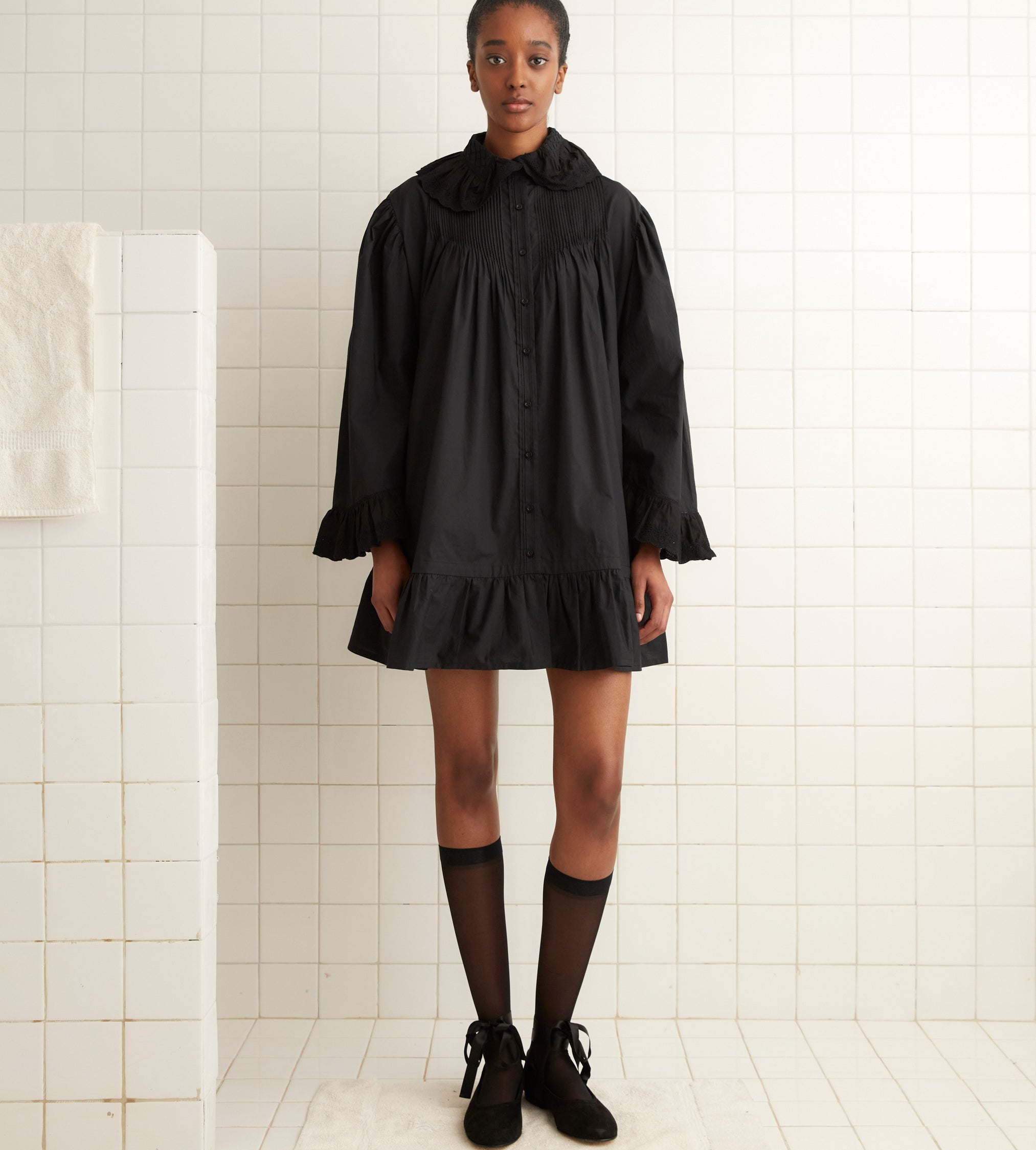 This dress is inspired by a nightgown, circa 1900. We reproduced the silhouette, with its pintucked bodice, swing silhouette, and needlework details, in a crisp white cotton. The dress features bell sleeves and a collar trimmed with broderie anglaise.
