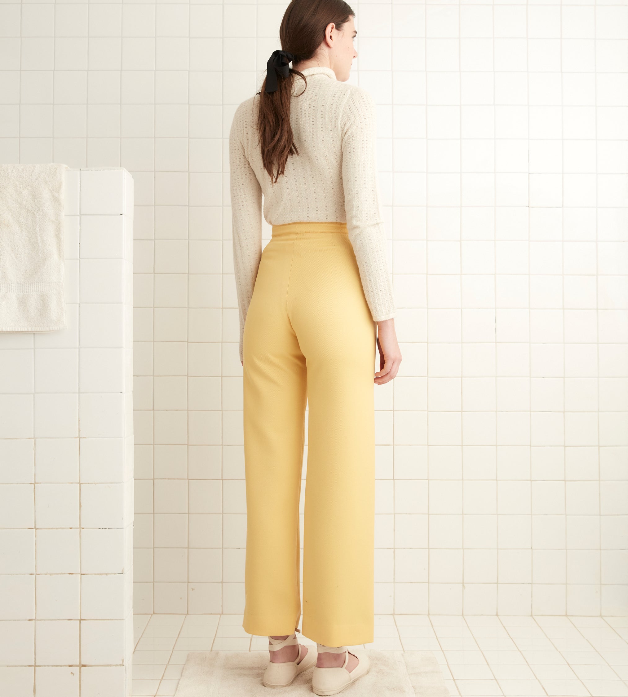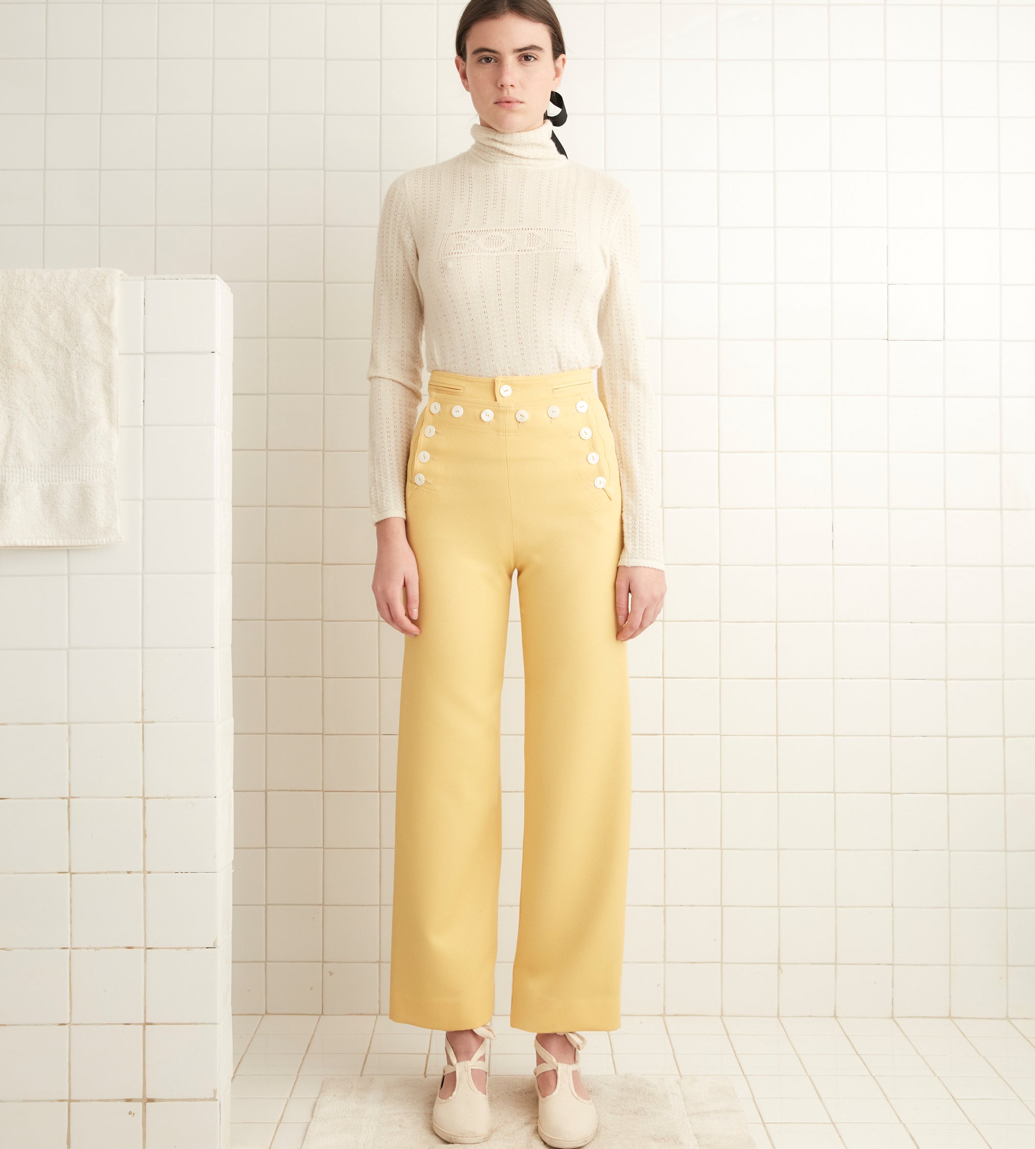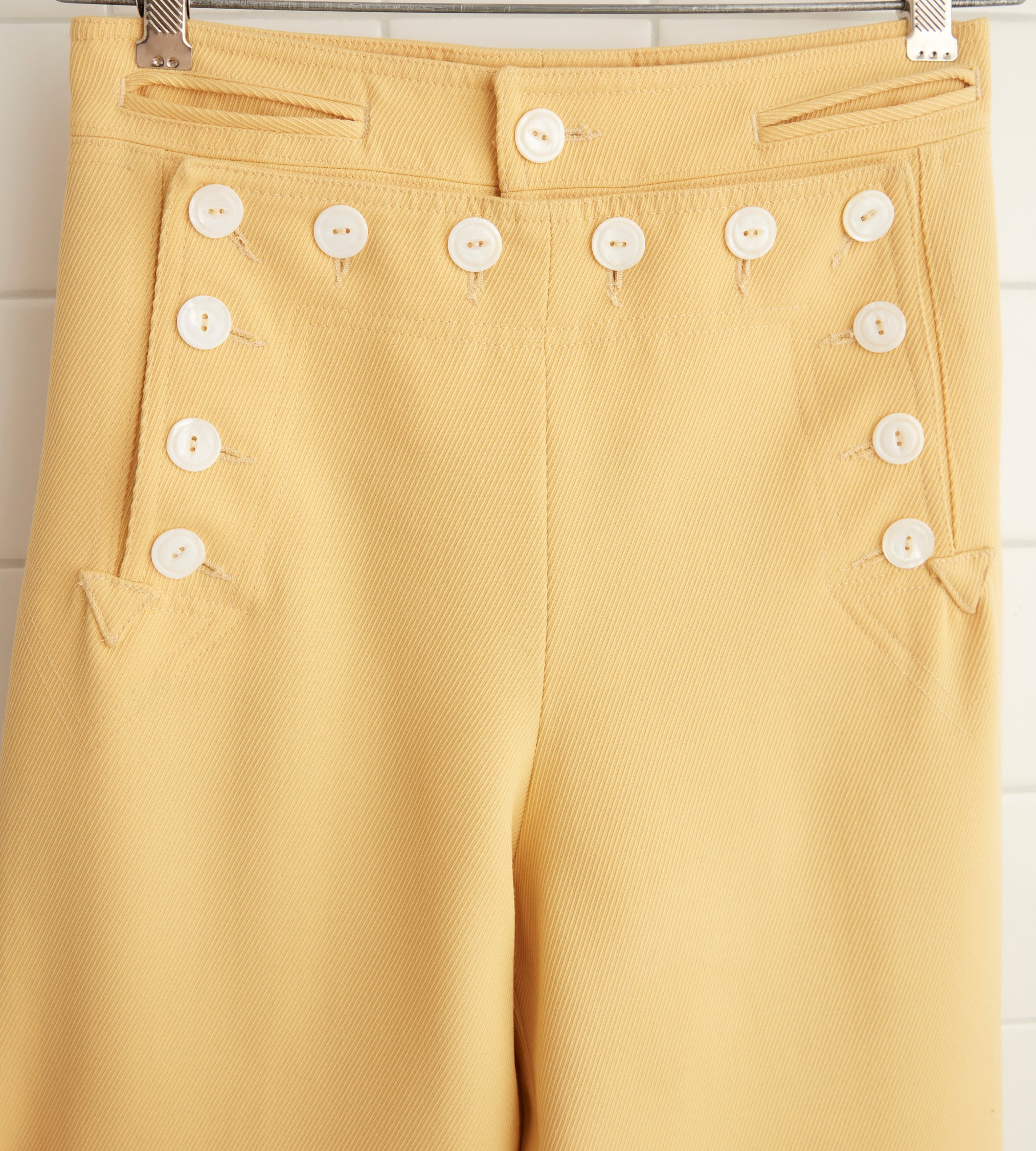 These trousers are inspired by a pair of 1930s riding breeches. We reproduced the fabric—a fine wool twill—for this style, which is cut in the silhouette of U.S. Navy pants from the 1940s.