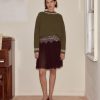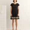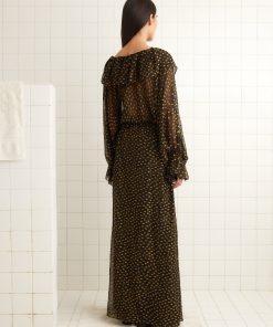 This dress is inspired by a French blouse from the late 1960s. It is made of sheer fil coupé—meaning “cut threads,” a style of jacquard weaving in which some of the fabric is cut away, leaving a raised, textured pattern. The dress features wide ruffles at the collar and cuffs and can be cinched at the waist.