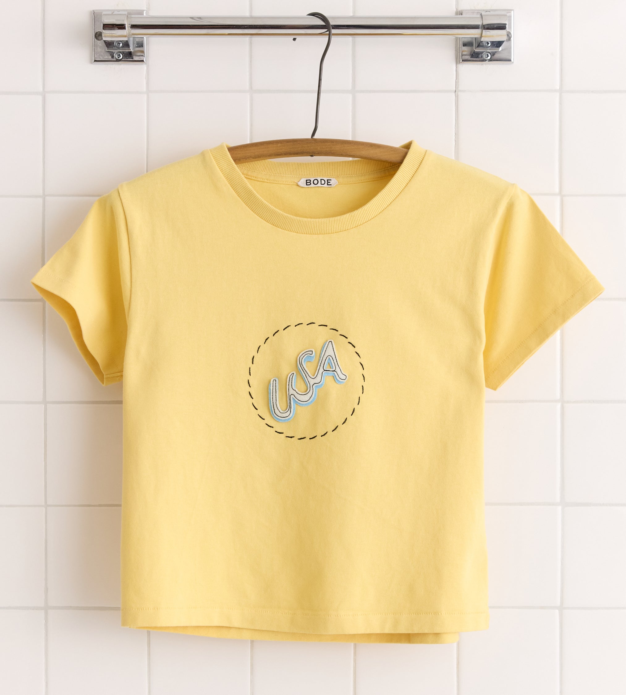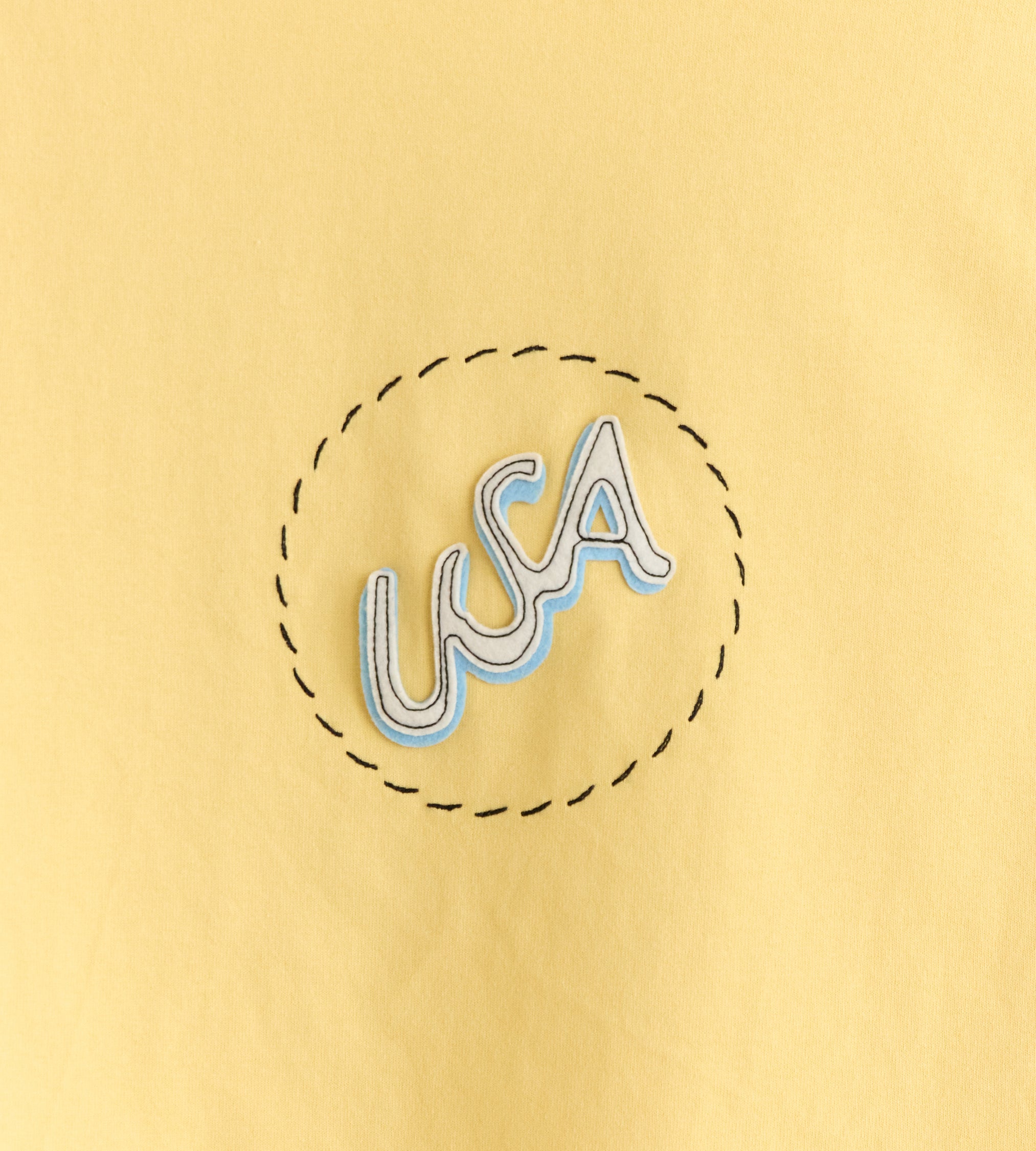 This shirt is inspired by a tee from the 1970s. We reproduced the graphic, a felt- appliquéd “USA” with embroidery details, for this style.