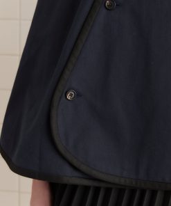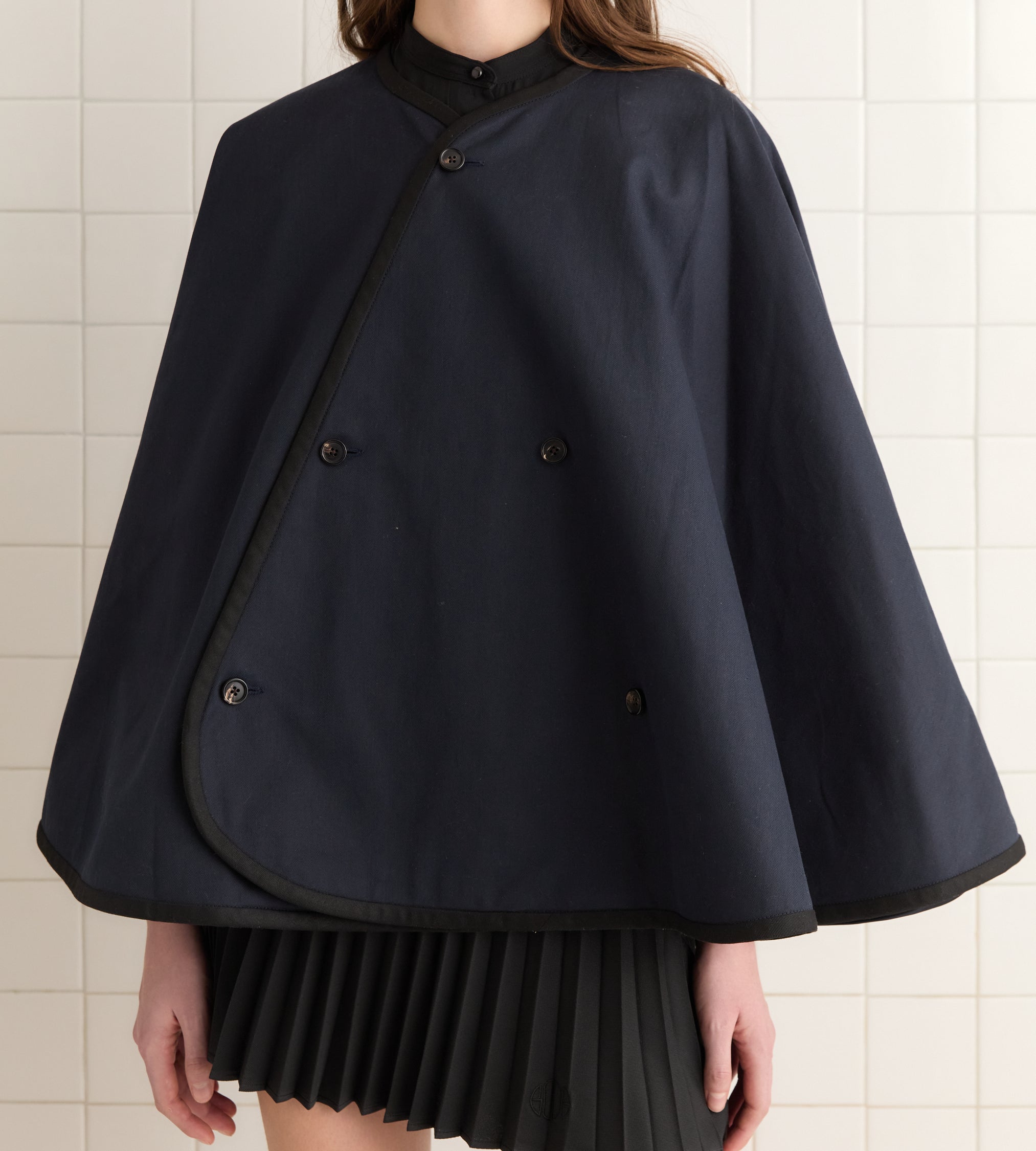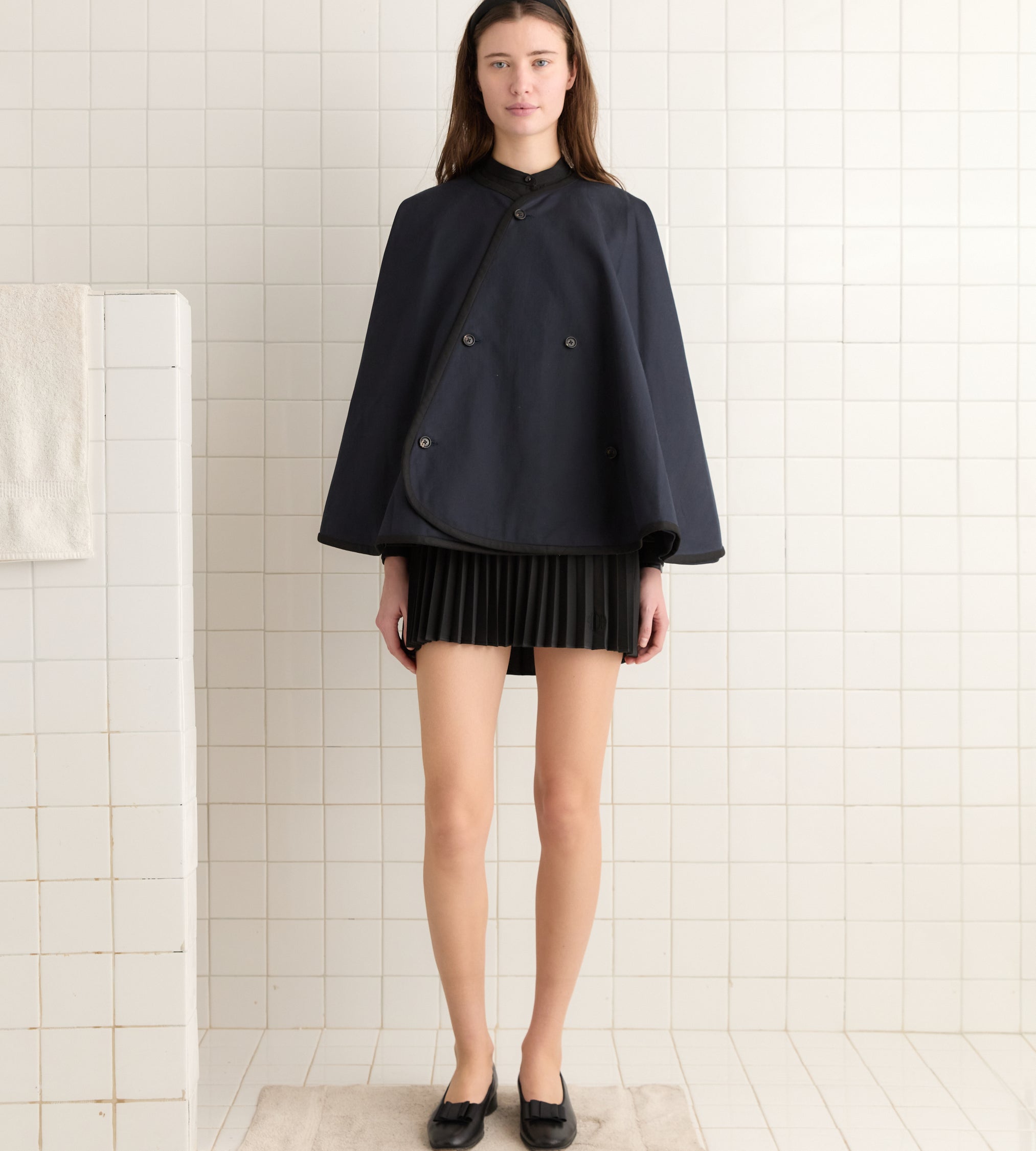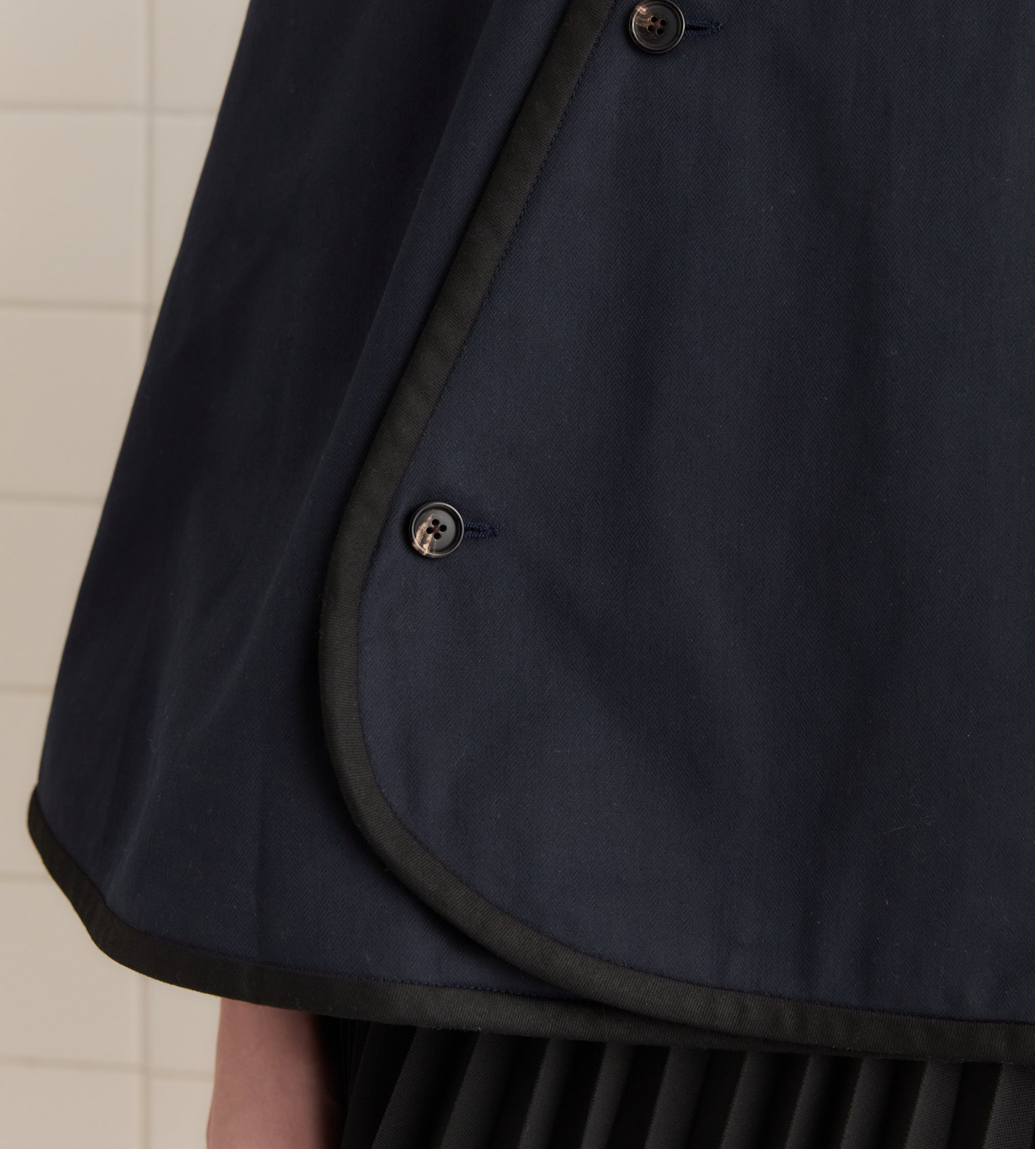 This piece is inspired by a handmade rain cape from the late 20th century. We reproduced the silhouette for this style, which is made from water-resistant waxed cotton from historic workwear mills in Britain. The finish improves with age as the wax wears down.