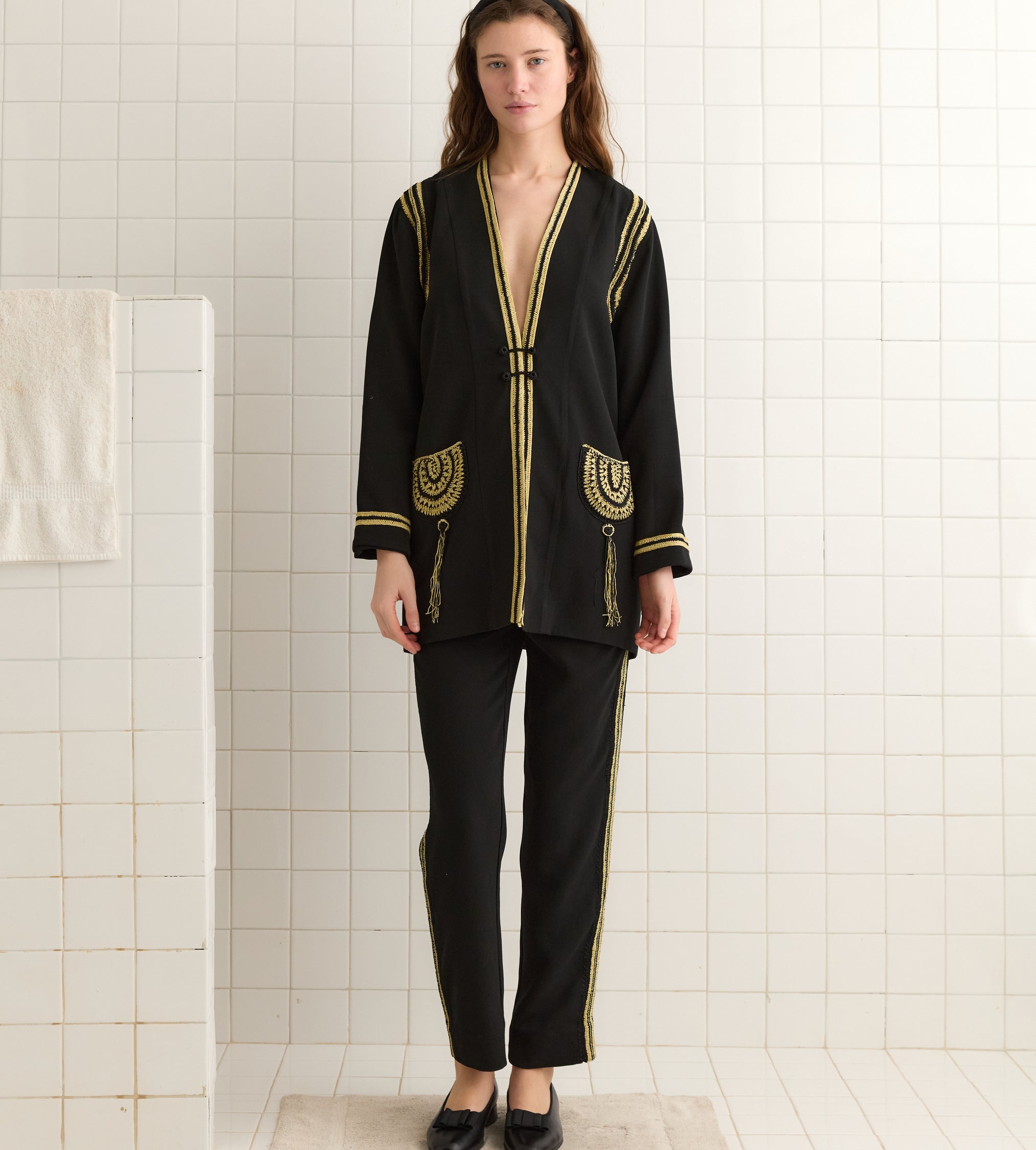 This jacket is inspired by a tunic from the 1920s. We reproduced the ecru-and-black crochet seams and pockets for this style.