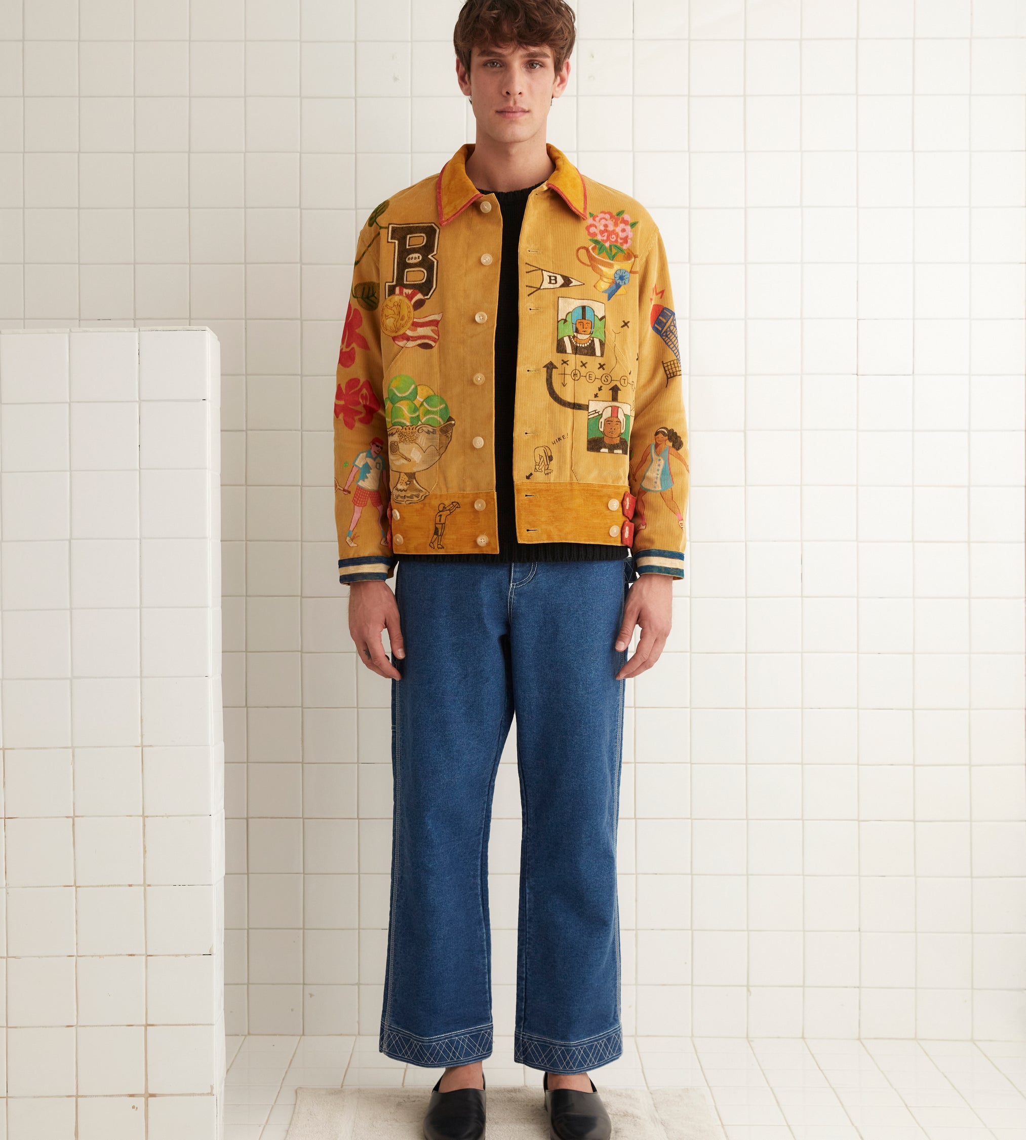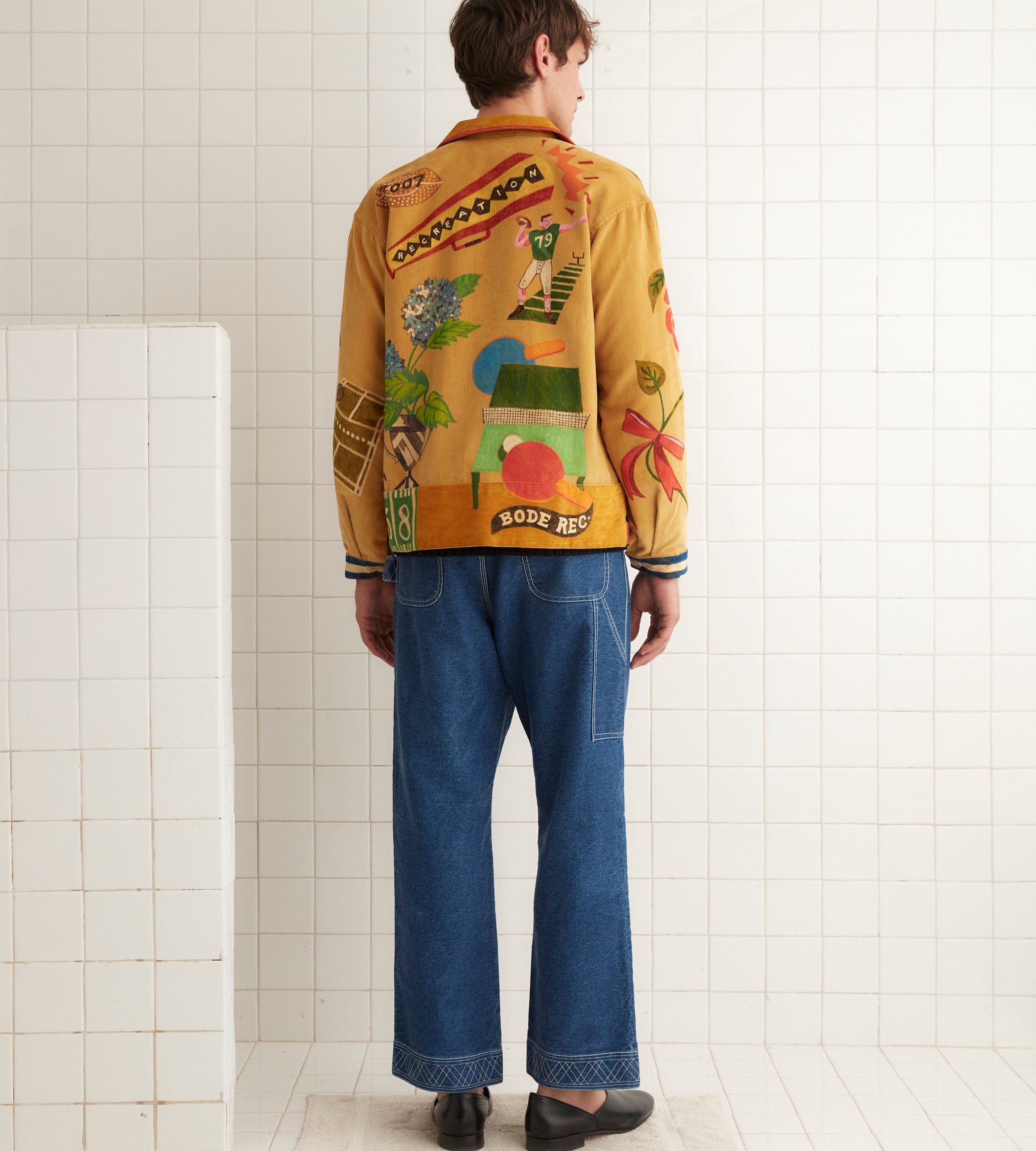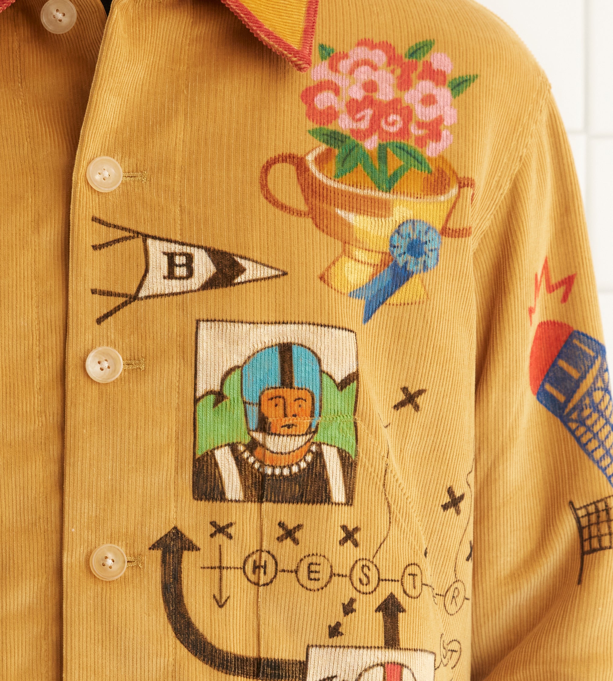 This style is made-to-order and drawn with various images and Bode logos. Please allow 10-12 weeks for completion. For the customizable option, view the Custom Senior Cord Side Tab Jacket.