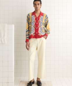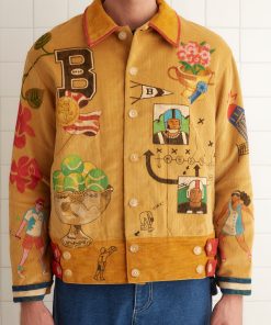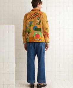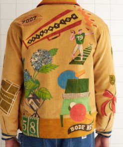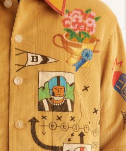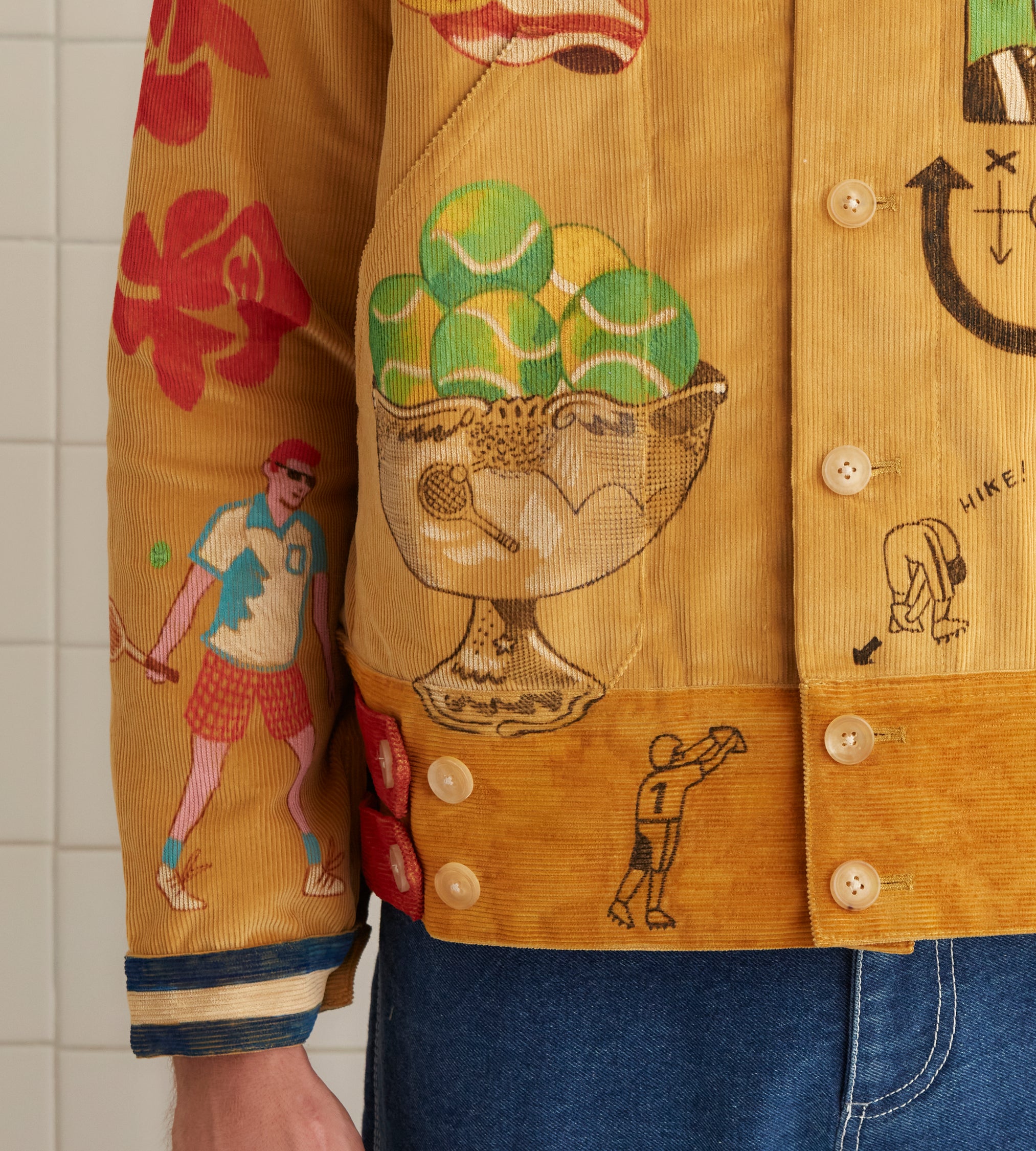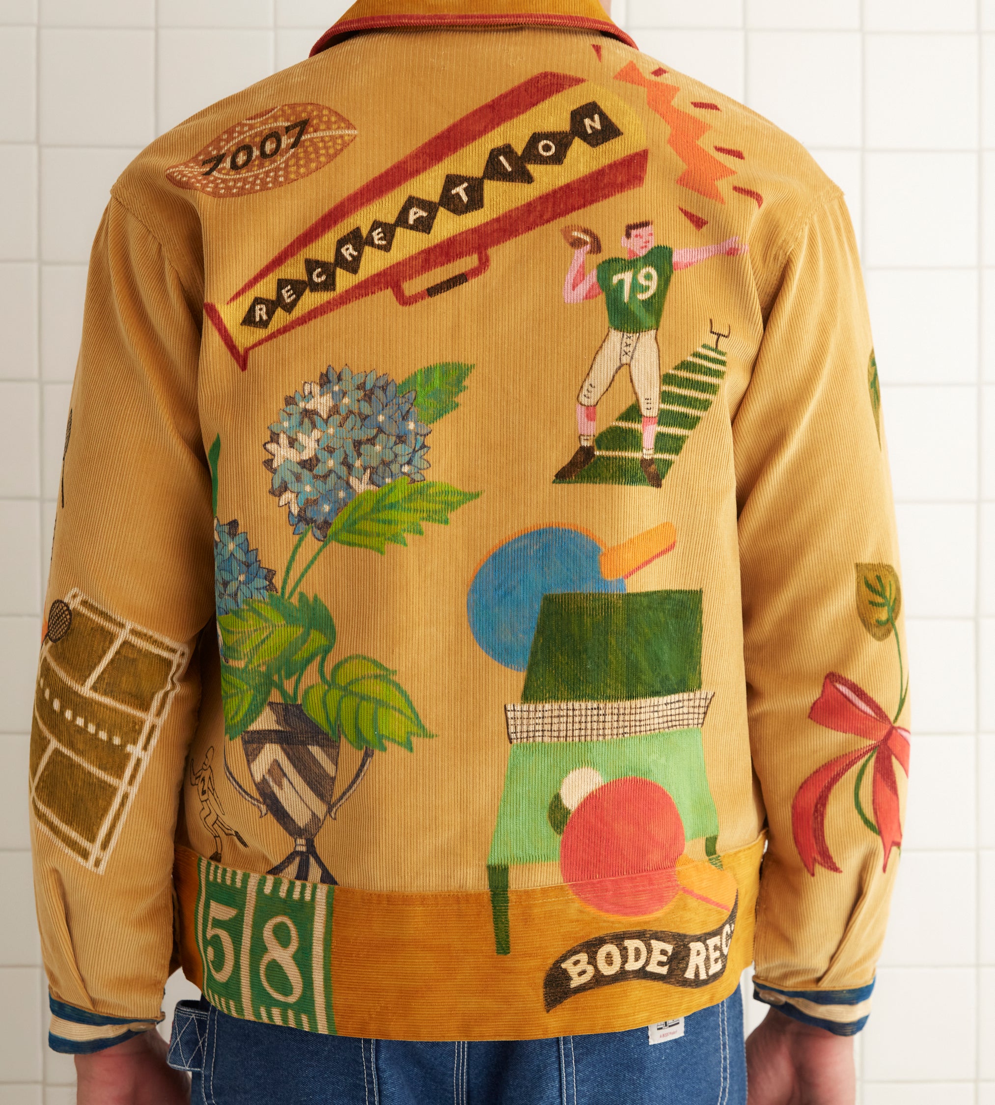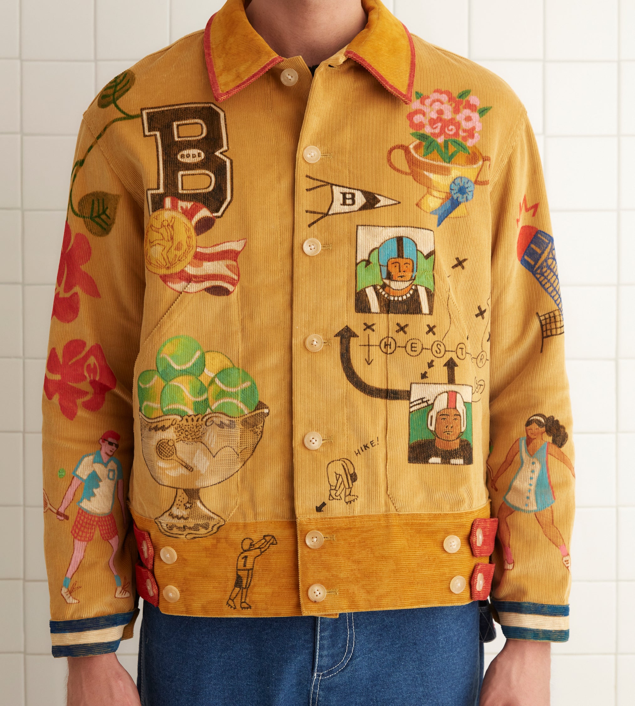 This style is made-to-order and drawn with various images and Bode logos. Please allow 10-12 weeks for completion. For the customizable option, view the Custom Senior Cord Side Tab Jacket.